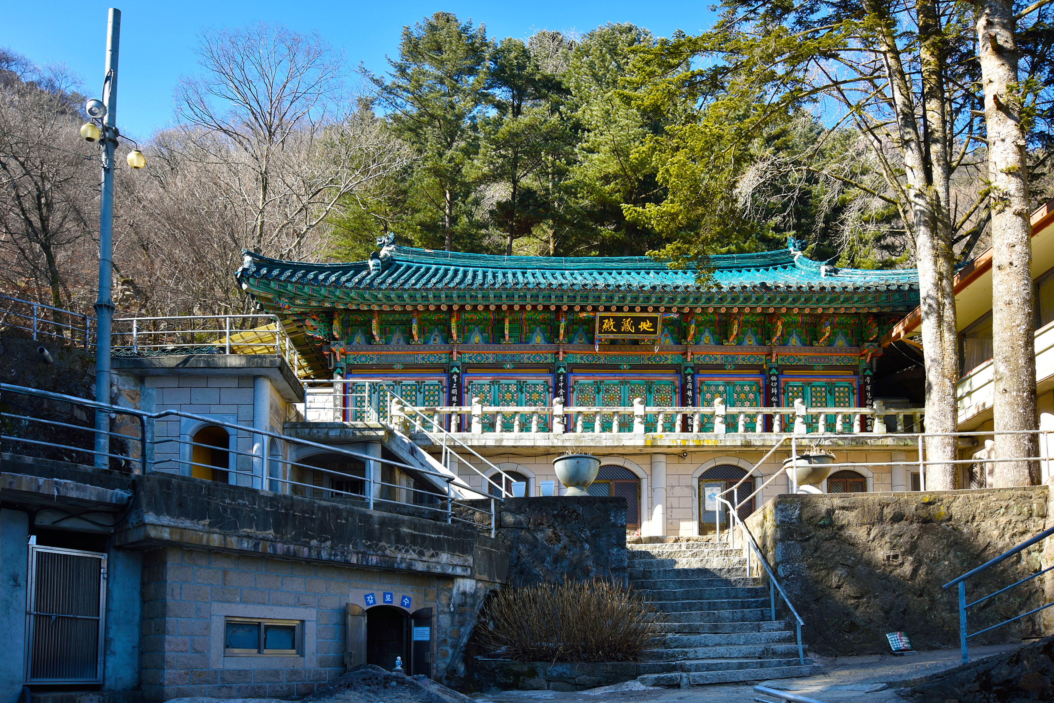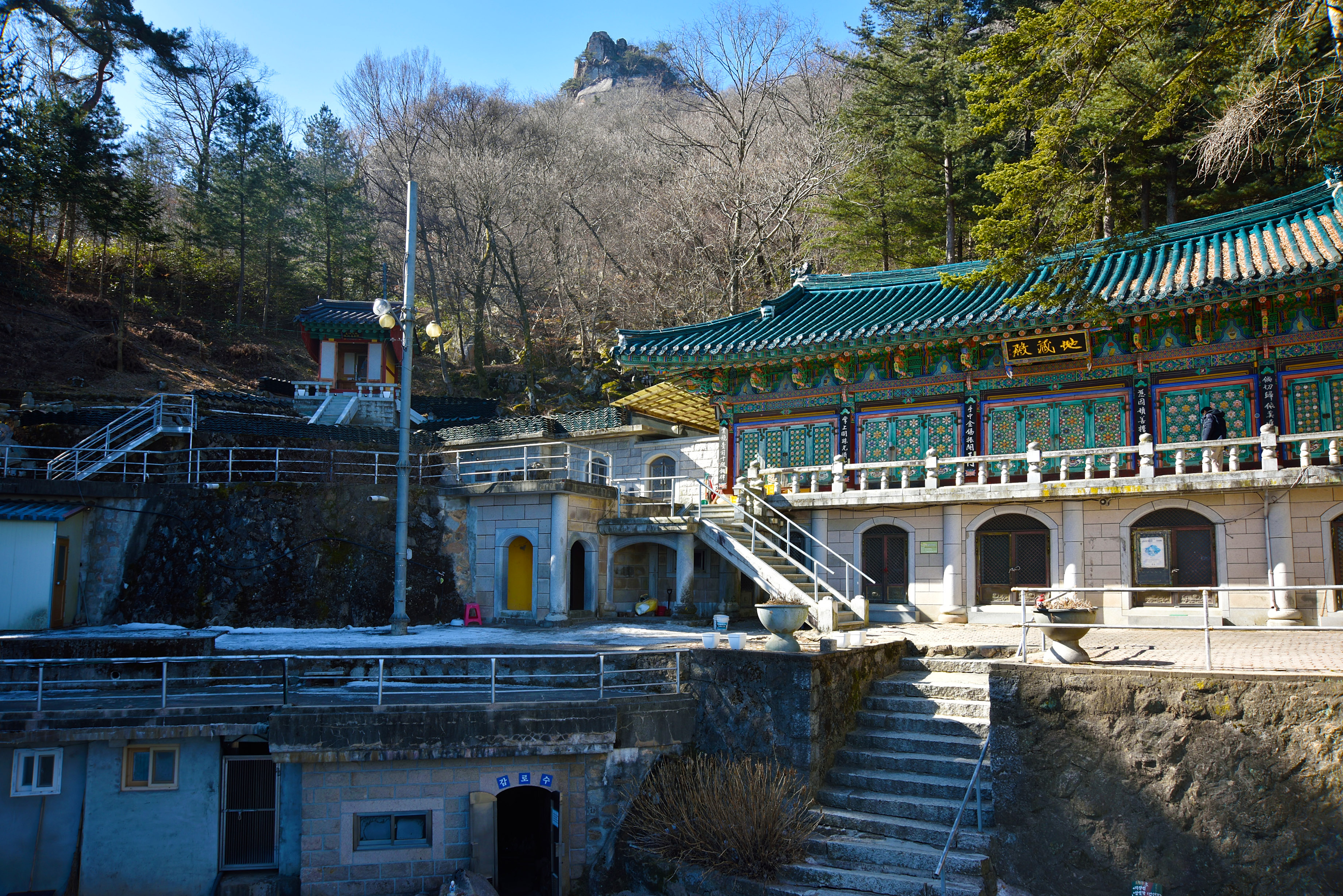 보현당 위의 지장전, 돌아가신 분들을 위한 독경소리가 낭랑하게 들려왔다. 아래 감로수 토굴에서 얼음 아래 암반수를 한 잔 마셨다.