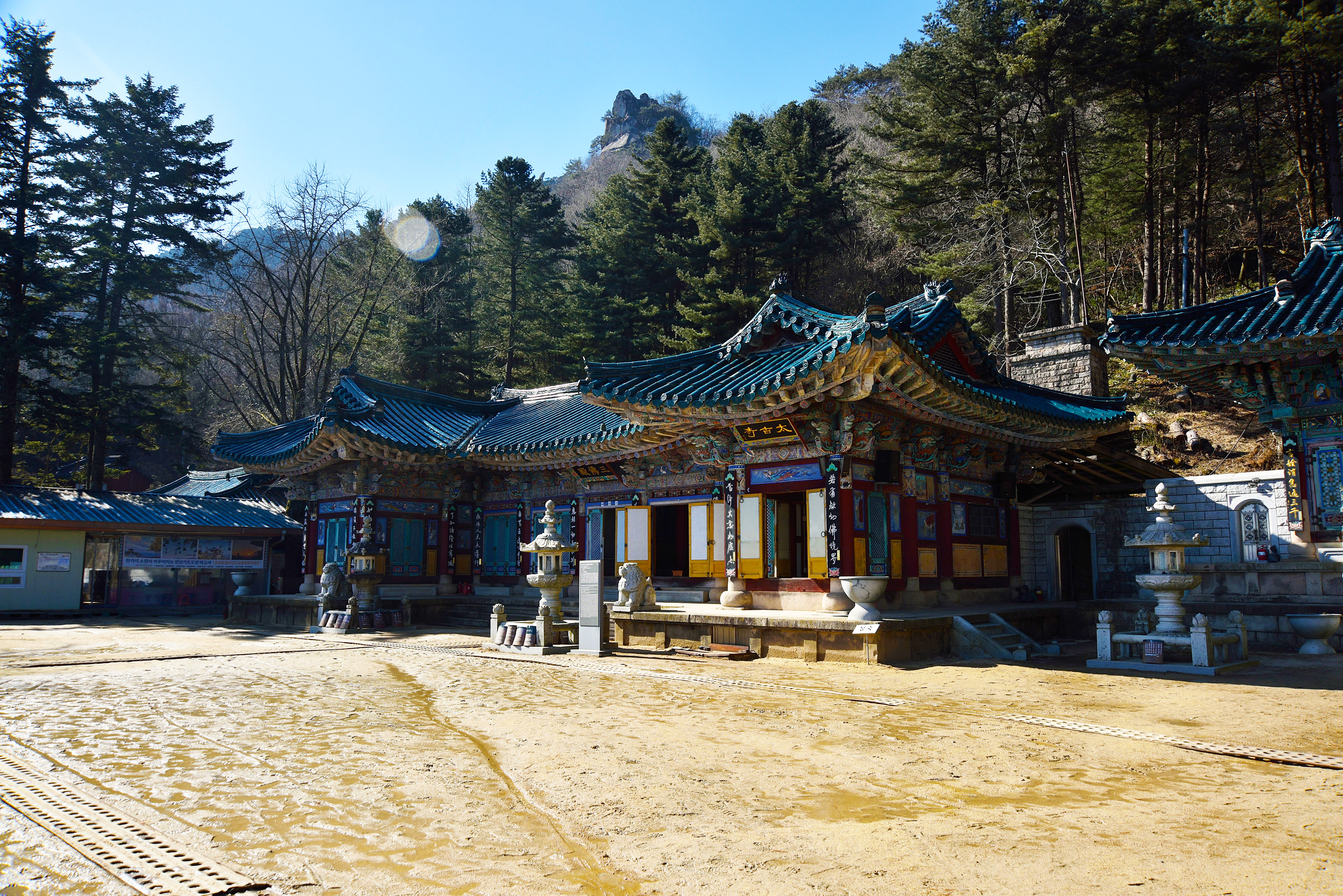 절 뒤편으로는 대둔산의 거대한 암봉들이 병풍처럼 둘러쳐져 있다. 이는 북쪽의 찬 기운을 막아주는 든든한 현무(玄武) 역할을 하며, 절을 아늑하게 감싸 안는 구조를 만든다.