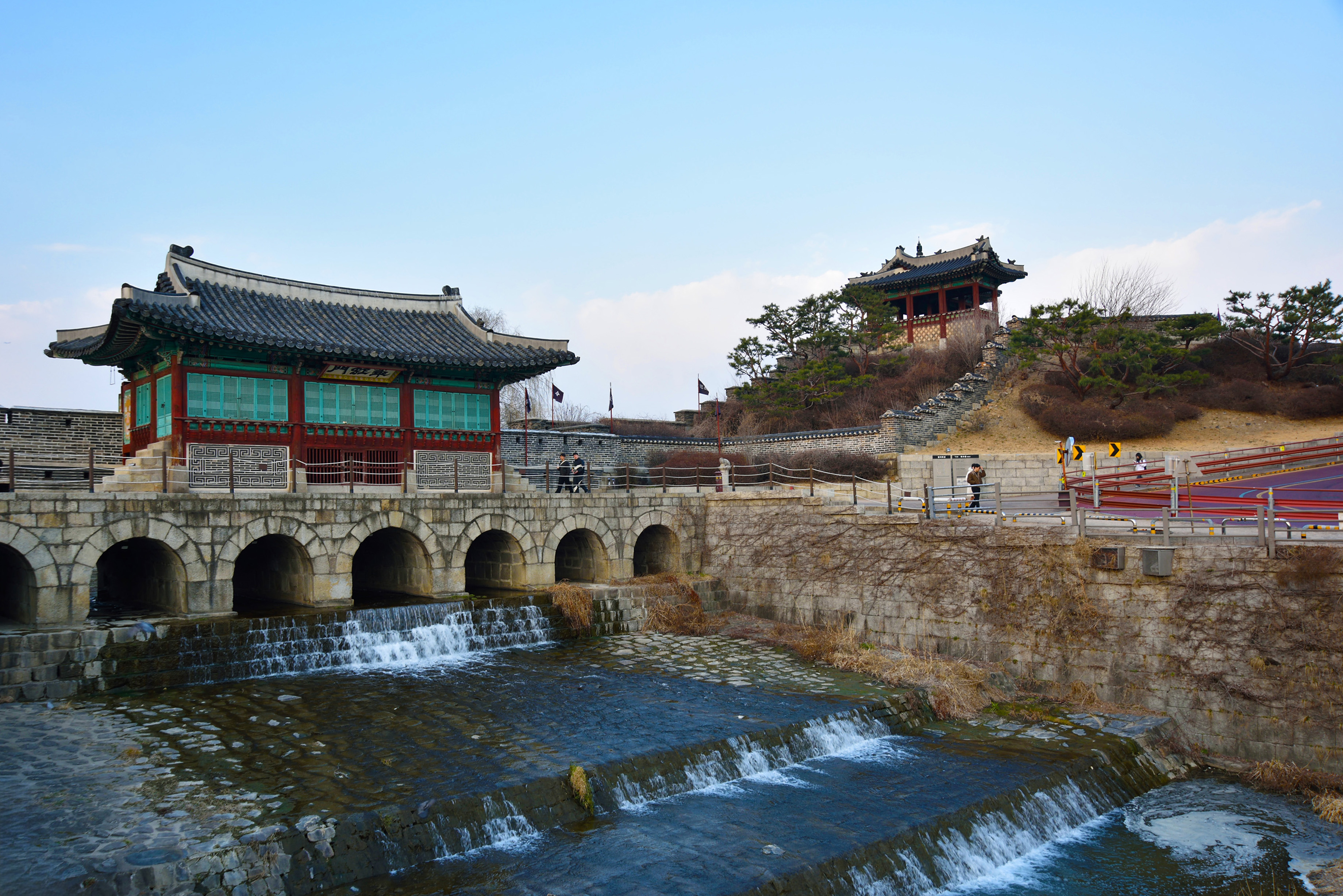 행궁, 홍살문과 신풍루, 산 위의 화성장대.