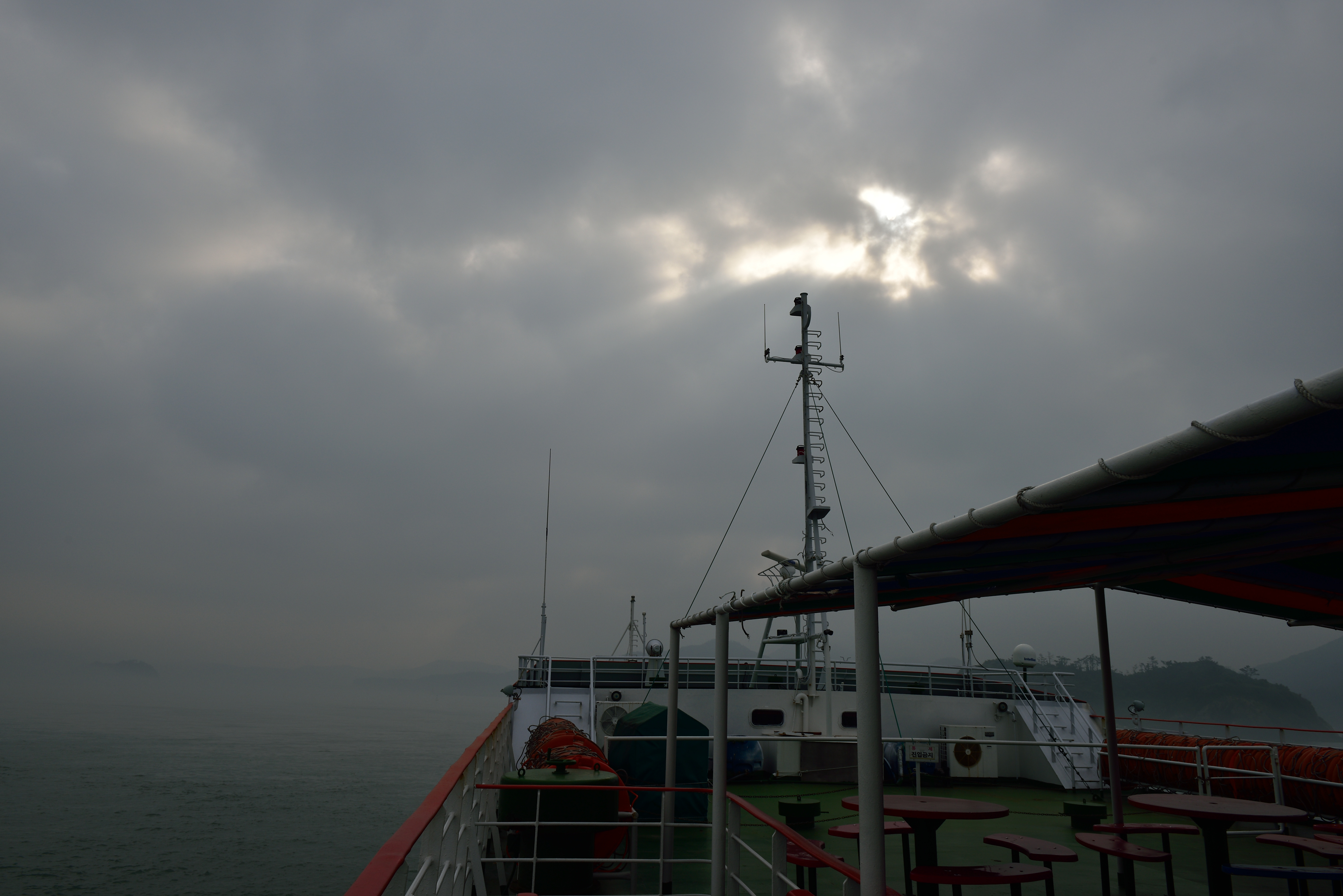 15일 오전 창유항을 떠나며... 춘향과 이몽룡이 이별하던 장면이 생각났다. "저 방자 미워라고 이랴 툭쳐 말을 몰아 다랑다랑 훨훨 넘어가니 그때 춘향이는 따라갈 수도 없고 높은 데 올라서서 이마 위에 손을 얹고 도련님 가시는디만 뭇두두루미 바라보니 가는 대로 적게 뵌다. 달만큼 보이다 별만큼 보이다 나비만큼 불티만큼 망종 고개 넘어 아주 깜박 넘어가니 그림자도 못 보겄네.~"