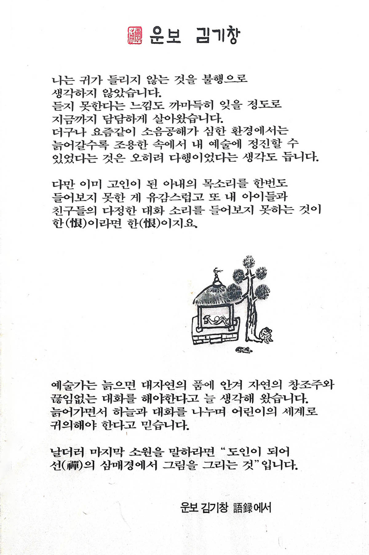 고래등 같은 기와집, 그리고 마당 앞뜰에 있는 정자와 작은 연못, 그 자체가 하나의 아름다운 풍경이었다. 눈 덮인 고택의 풍경은 또 다른 아름다움을 보여 주었다. 관람객들을 위하여 고택의 내부까지 공개하고 있어서, 마련된 슬리퍼를 신고 살아생전 운보가 머물던 작업실과 거실도 함께 볼 수 있었다. 운보의 집을 후측면으로 나와 운보미술관에 들어가, 그의 작품들을 관람했다. 그의 힘 있는 듯한 글씨 그림, 전통한국화, 석판화들을 두루 보고 그림 판매실에 들려 진열해 놓은 운보의 석판화들을 보았다. 진한 원색으로 찍어놓은 석판화는 그림과 차이가 없어 보였다. 전문가 아니면 구별도 어렵다는 설명이었다. 직원의 말에 의하면 석판화는 150장가량 찍은 후, 석판을 파쇄해 버린다는 것이었다. 판매하는 그림은 거의 마지막 판본 정도 된다는 것인데, 가격은 대략 큰 것이 250만 원 정도였다. 그림이 너무 아름답고 색깔이 강렬해서 구입하고 싶은 마음이 일었으나, 평소 해보지 않았던 일이라 마음뿐으로 실행에 옮기지는 못했다. 전시실 한편에는 월북작가로 활동하다 작고 했다는, 운보의 동생 김기만의 유작도 볼 수 있었다. 2005년인가 금강산에 갔을 때, 옥류관 근처에서 운보동생의 그림이라며 표구도 안 된 낱 장 그림들을 판매하던 모습이 떠오르기도 했다.
