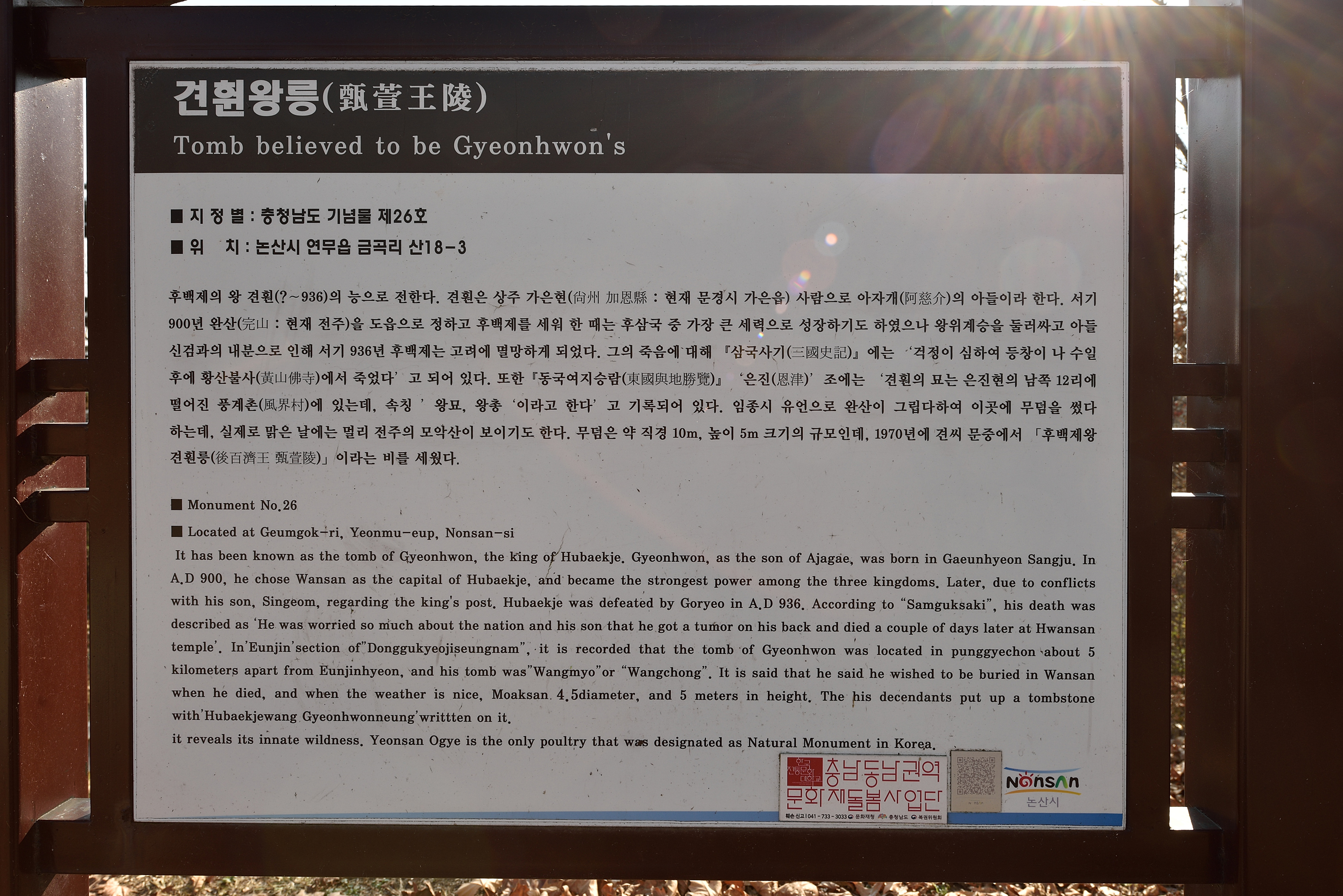호남 고속도로를 다닐 때, 도로변 안내판에서 견훤왕릉 표지를 보고 무척 궁금했었다. 논산 연무대에서 4km란 이정표를 보곤 그리로 향했다. 논산벌 한가한 시골 들판 구릉 위에 견훤릉이 있었다. 주지하다시피 견훤은 후삼국 시대 강력한 카리스마로 신라를 정벌하여, 경애왕을 퇴위시키고 경순왕을 옹립했었던 막강한 인물이었다. 궁예의 뒤를 이은 왕건과 후삼국 통일을 두고 각축을 벌릴 정도로 강력했던 그는 아들들의 불화로 금산사에 갇혔다가 왕건에게 투항하고 말았다. 견훤에게는 열 명이 넘는 아들이 있었다. 그중에서 견훤은 기골이 장대하고 지략이 뛰어난 넷째 아들 금강(金剛)에게 왕위를 물려주려고 했다. 그러자 세 형 신검(神劒), 용검(龍劒), 양검(良劒)이 반발해 반란을 일으켰다. 마침내 군사권을 휘어잡은 세 아들은 아버지 견훤을 금산사(金山寺)에 가두고 동생 금강을 죽인 후 권력을 차지했다. 금산사에 갇혀 있던 견훤은 사위 박영규(朴英規)의 도움으로 고려로 도망쳐 왕건에게 투항했다. 지방 호족들의 신검에 대한 반발도 컷다. 936년에 왕건이 대규모 군대를 이끌고 공격했을 때 후백제의 장군들이 제대로 싸우지도 못하고 항복하고 말았다. 신검은 고려군의 공격에 맞서 끝까지 버텼지만 역부족이었다. 결국 신검은 두 아우와 함께 항복하였다. 신검·양검·용검 등은 한때 목숨을 부지했으나, 얼마 뒤 모두 살해되었다. 견훤 또한 격한 성정으로 전전긍긍하다가 창질이 나서 연산(連山)에 있는 한 절에서 죽었다. 결국 44년 동안 지속되었던 후백제의 역사는 끝이 났다.