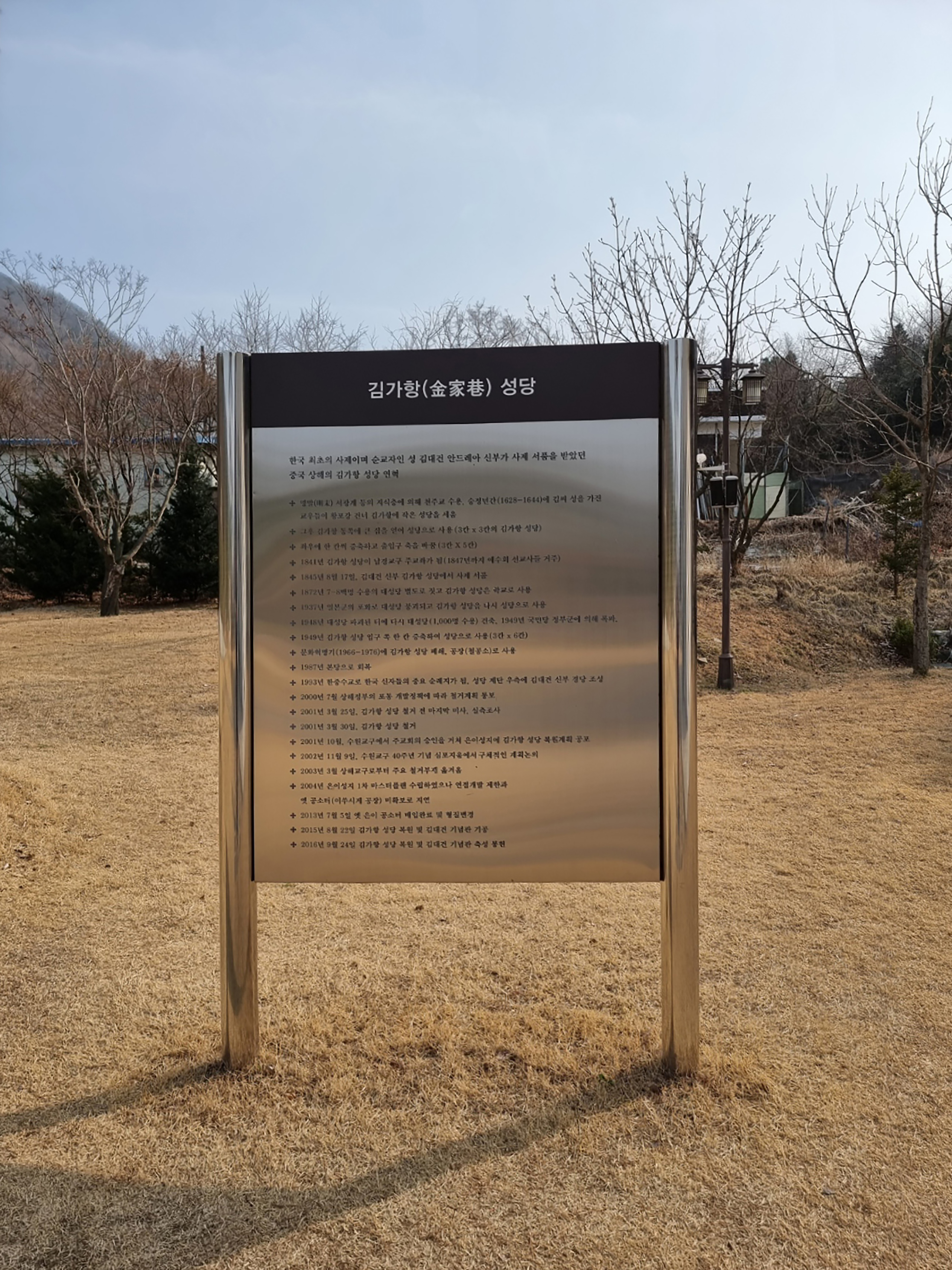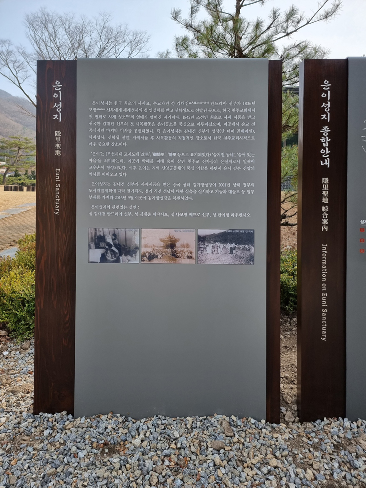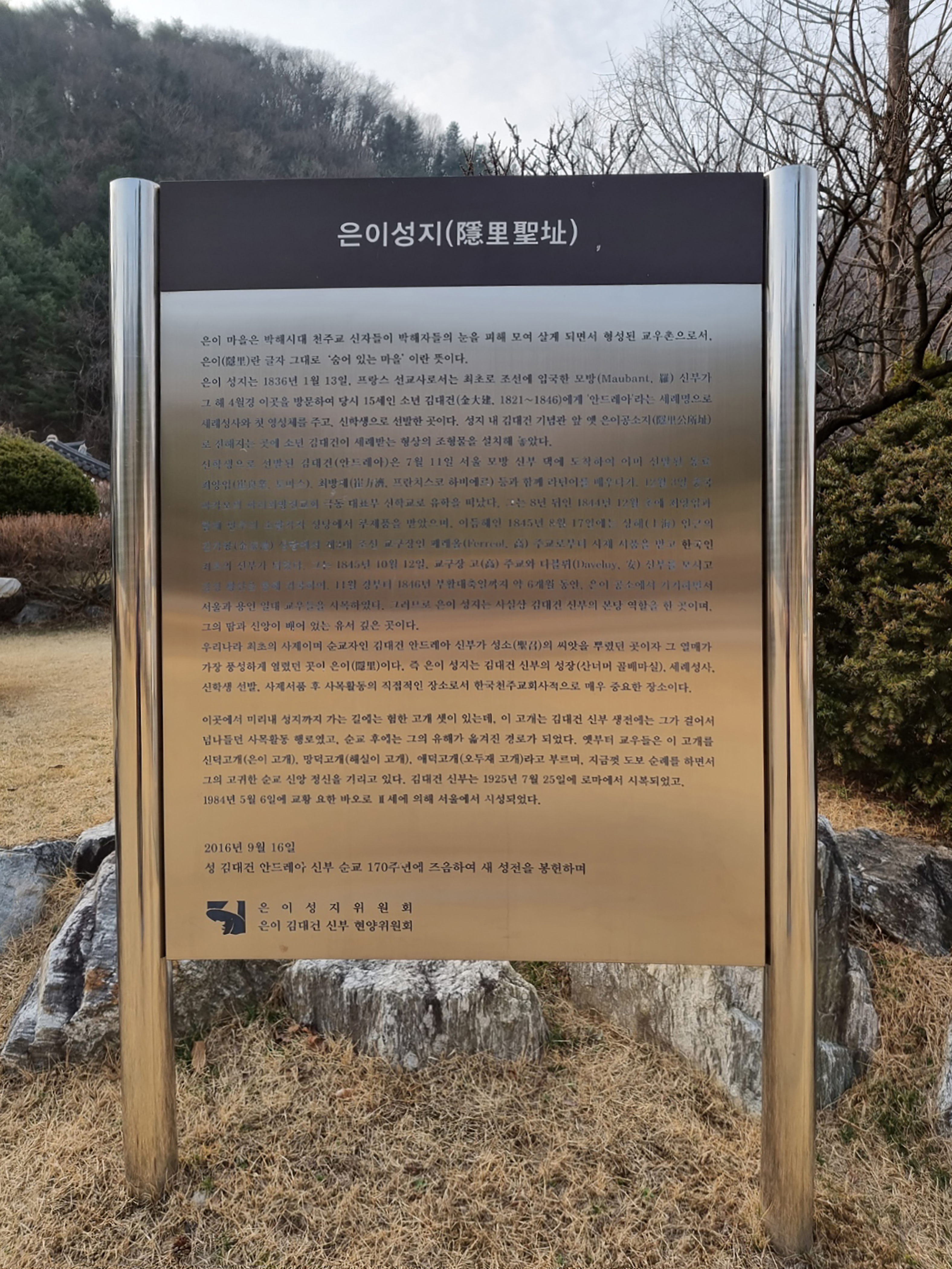 낮 기온이 올라서인지 미세먼지가 극성을 부렸다. 코로나에 미세먼지, 집 주변 가까운 거리 산책마저 힘든 날이었다. 그래서 찾은 은이 마을 은이 성지였다. 은이(숨을 隱, 마을 里) 마을은 천주교 신자들이 숨어 살아서 마을 이름이 그렇다고 한다. 이곳에서 김대건 안드레아 신부님이 1836년 프랑스 선교사로 최초 입국한 모방 신부님이 15세 소년 김대건에 '안드레아'라는 세례명으로 세례성사와 첫 영성체를 주고, 신학생으로 선발한 곳이다.