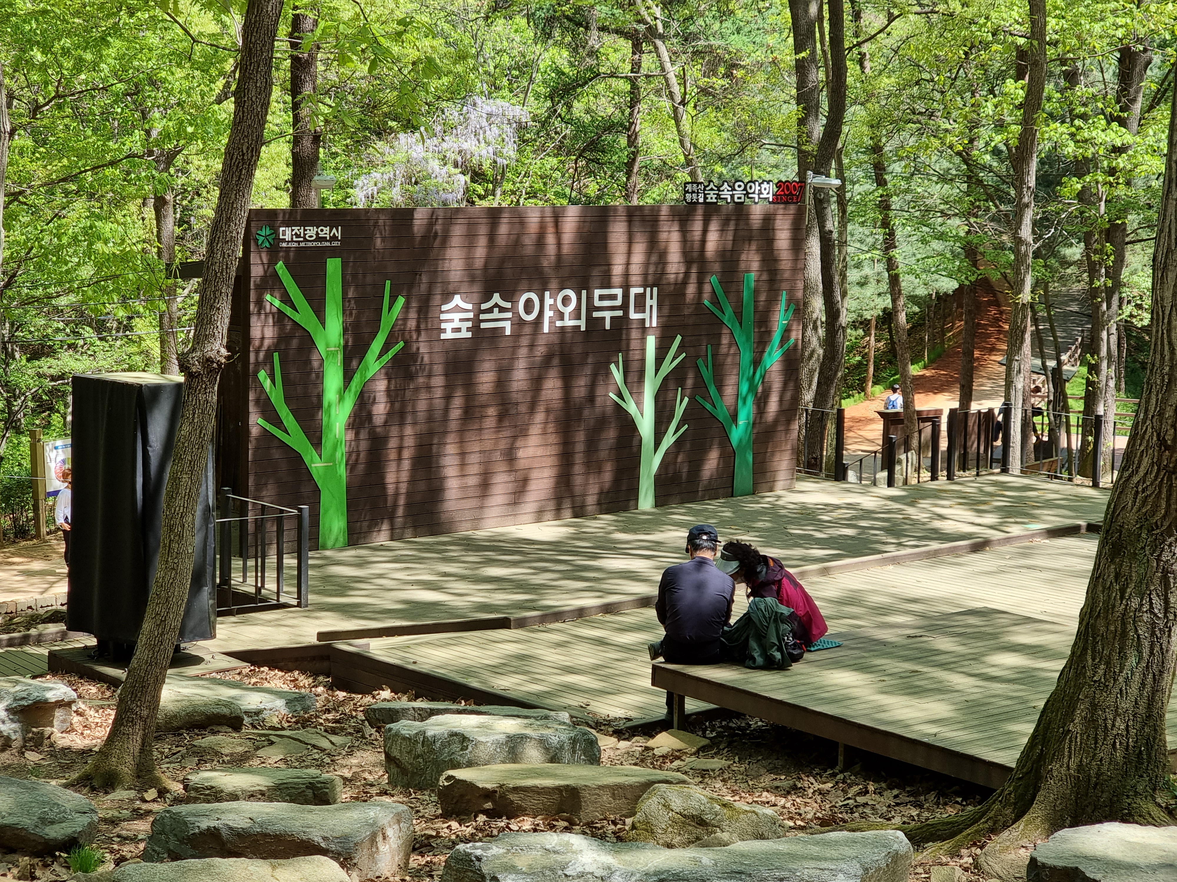 숲 속 야외무대 쉼터. 이곳에서 순환도로를 따르지 않고 계족산성으로 방향을 바꿔 산을 올랐다. 계족산성까지 소요시간 40여분이란다. 거리는 멀지 않으나, 산길이 가팔라 쉬운 길은 아니었다.