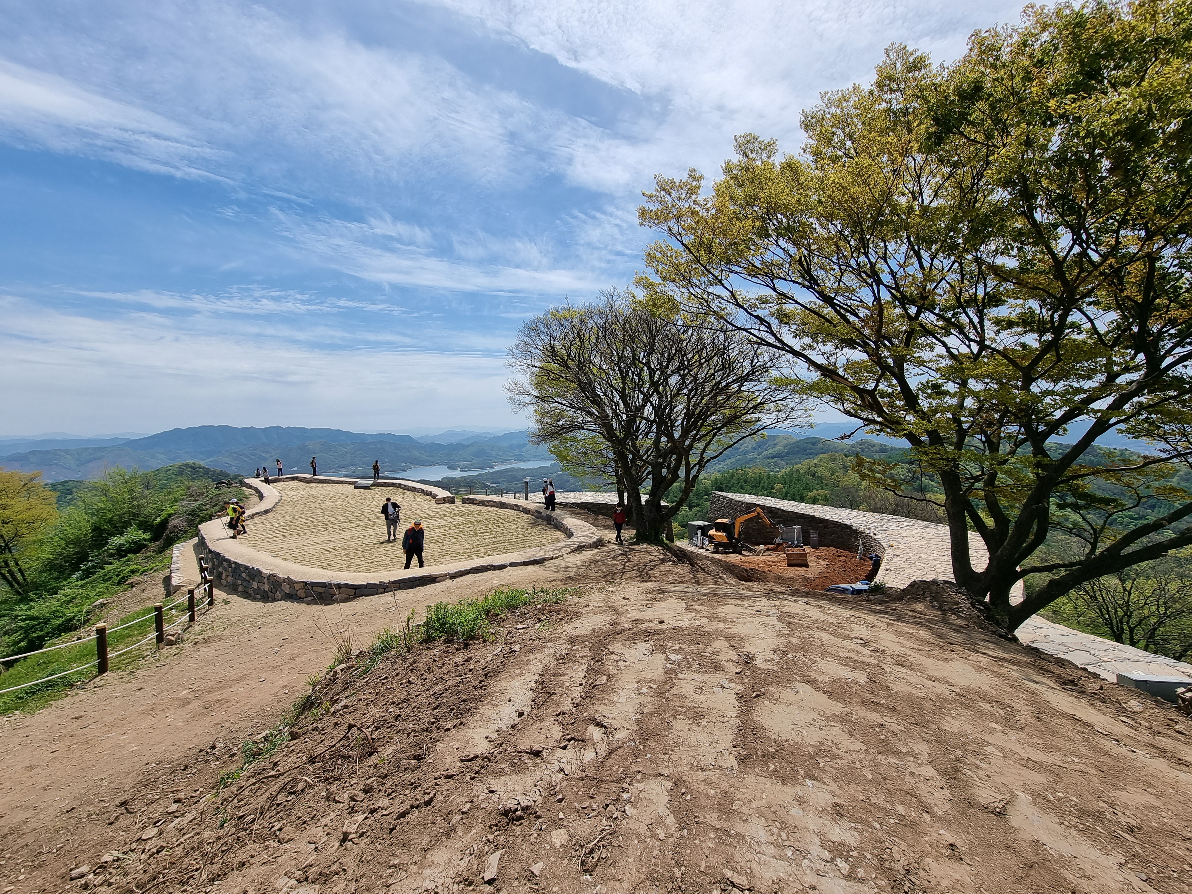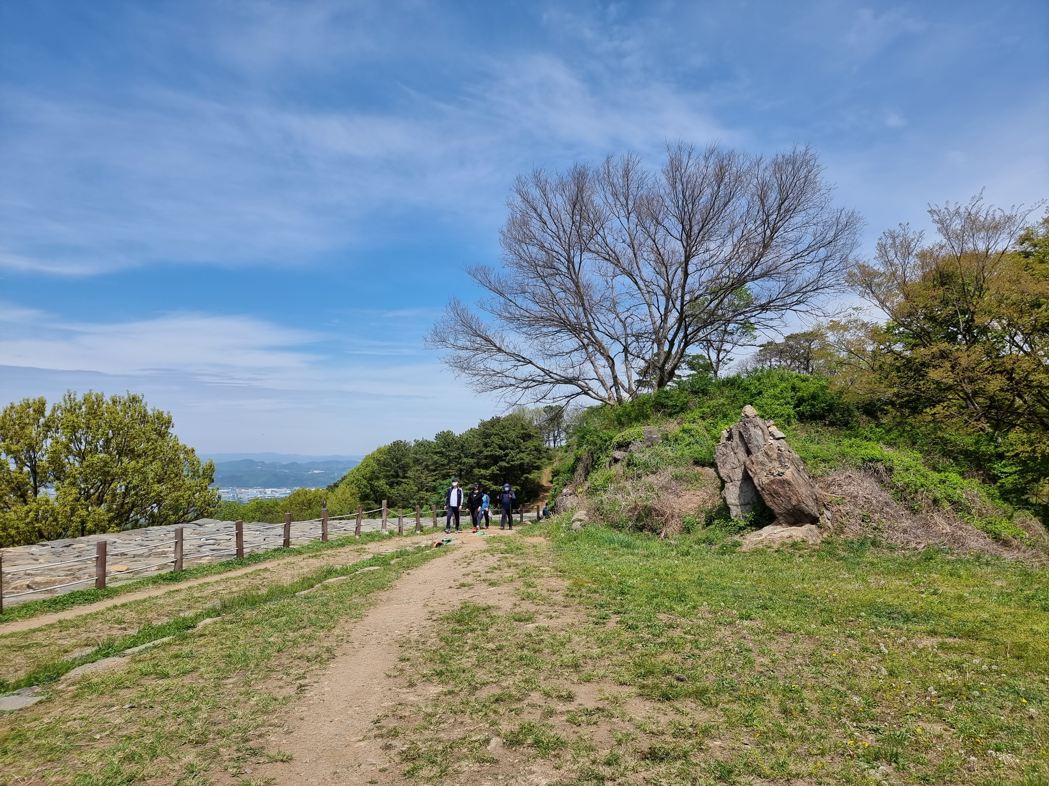 계족산성에 오르는 것이 목적이었기 때문에 맨발 황토체험은 다음 기회로 미루었다. 아기자기한 산림욕장에서 맑은 숲과 푸른 하늘을 바라보며 숲 향기를 호흡하면서 산길을 걸었다. 계족산성은 보수 중이어서 서문터에서 남문까지 일부분만 일부분만 볼 수 있었다. 북쪽은 흰색 보드로 벽을 세워 막아 통행을 금지했고, 남문은 포클레인을 동원하여 보수 작업 중이었다. 유감스럽게 옛 산성의 모습은 보지 못하고 새로이 축성한 석성 위를 걸었다. 산성의 아름다움보다는 사방이 탁 트인 산성의 성벽 위에서 신탄진과 대전시, 대청호까지 두루 조망할 수 있었다.