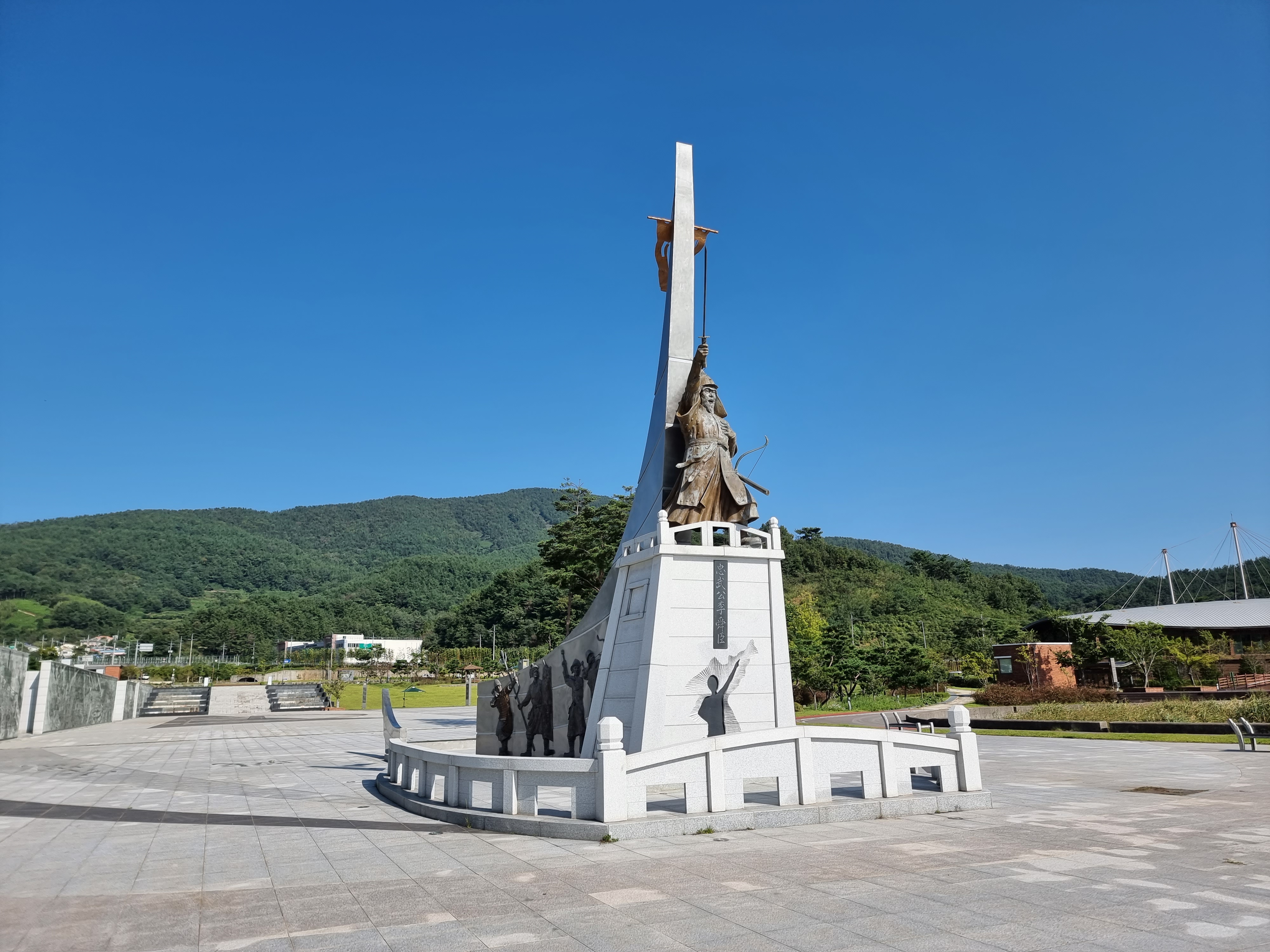 관음 포구는 서쪽으로 길게 뻗은 반도를 가운데 두고 북쪽 포구에는 이순신 장군 동상과 벽화가 있는 광장이 있고, 남쪽에는 주차장과 체험 공간이 있었다. 햇빛이 강하고 날씨가 더워 땀이 줄줄 흘렀지만, 망국의 기로에서 자신의 목숨 대신 나라를 구하신 장군의 살신성인을 생각하며, 모퉁이를 돌아 유허지로 들어섰다.