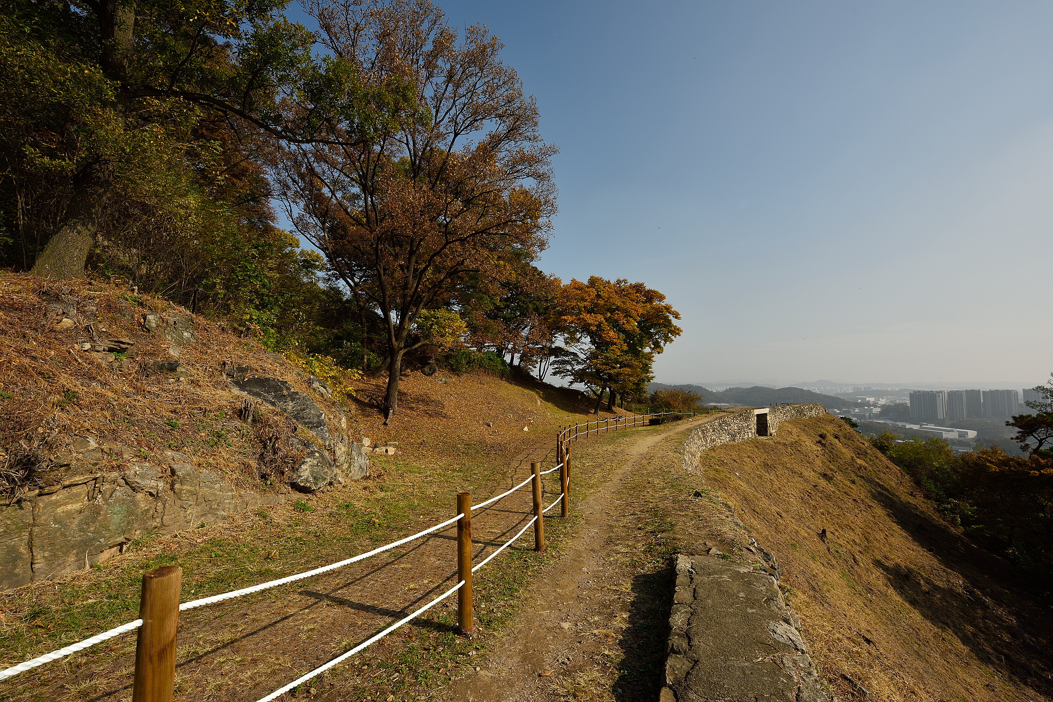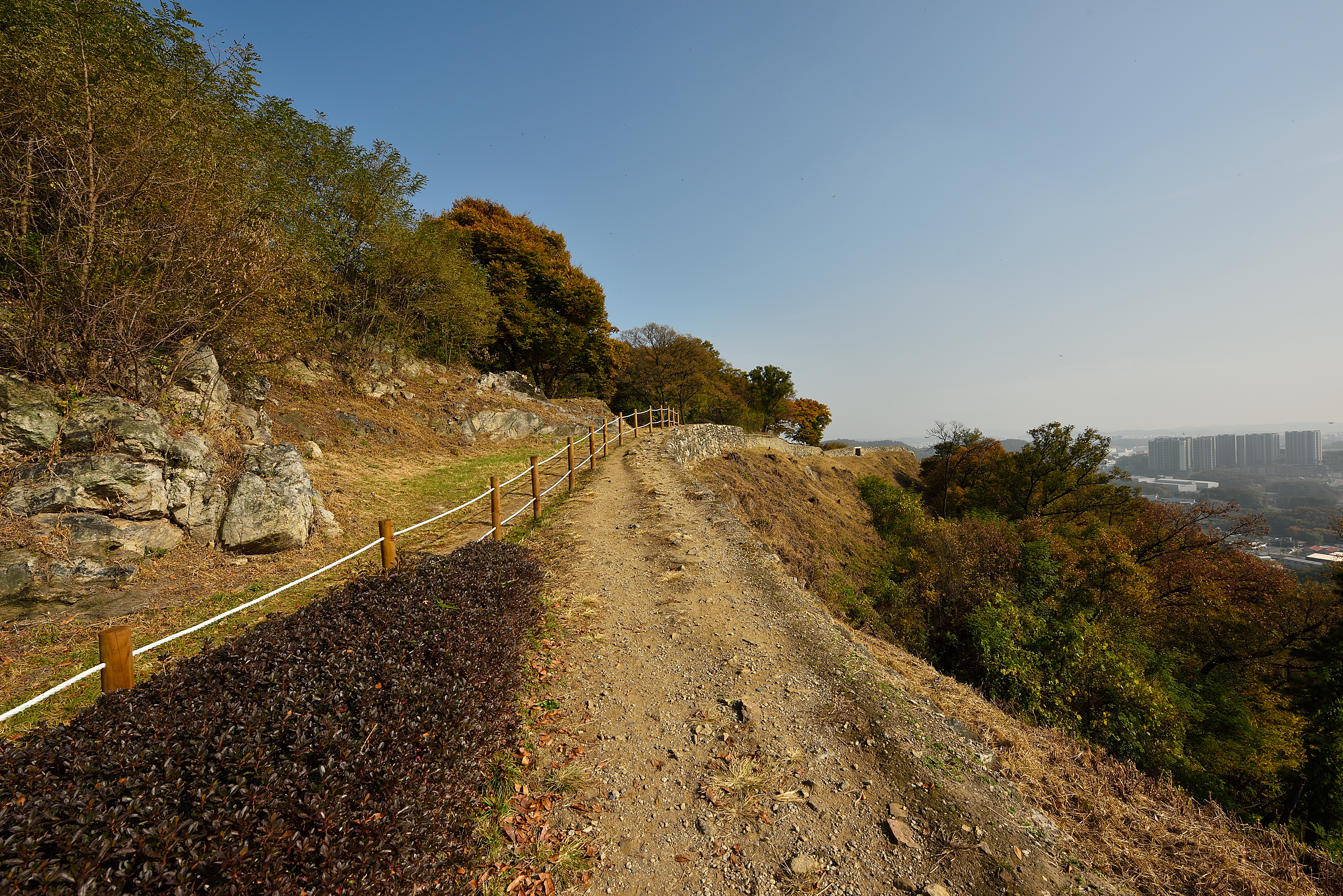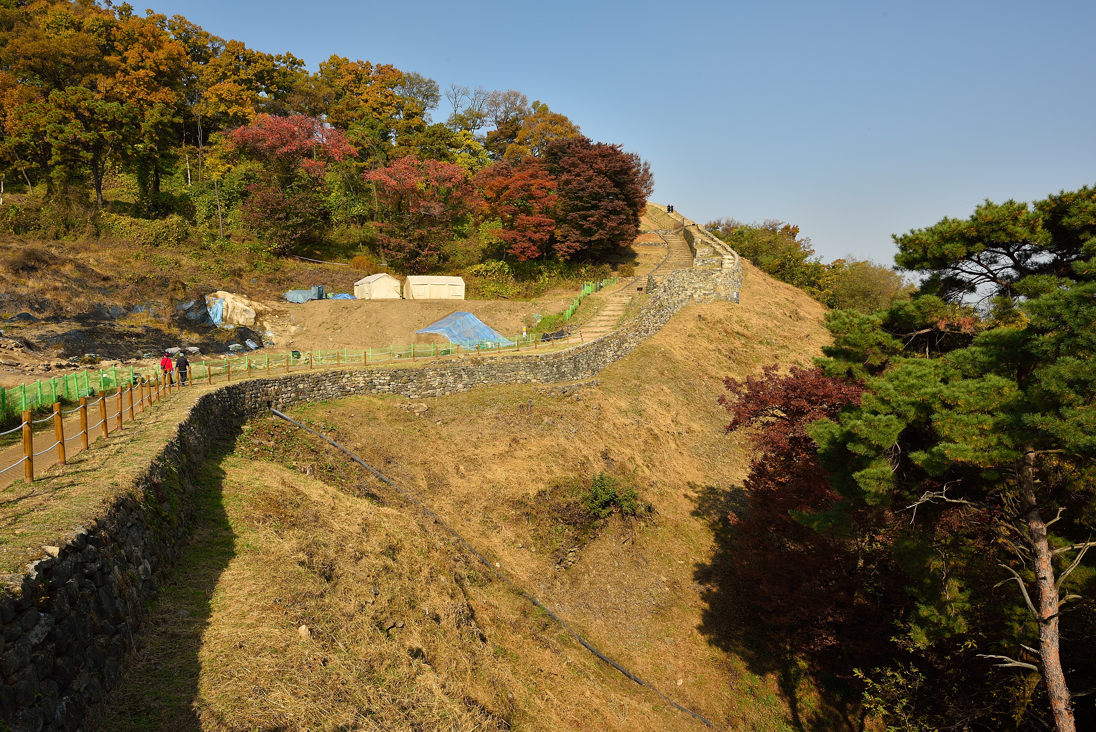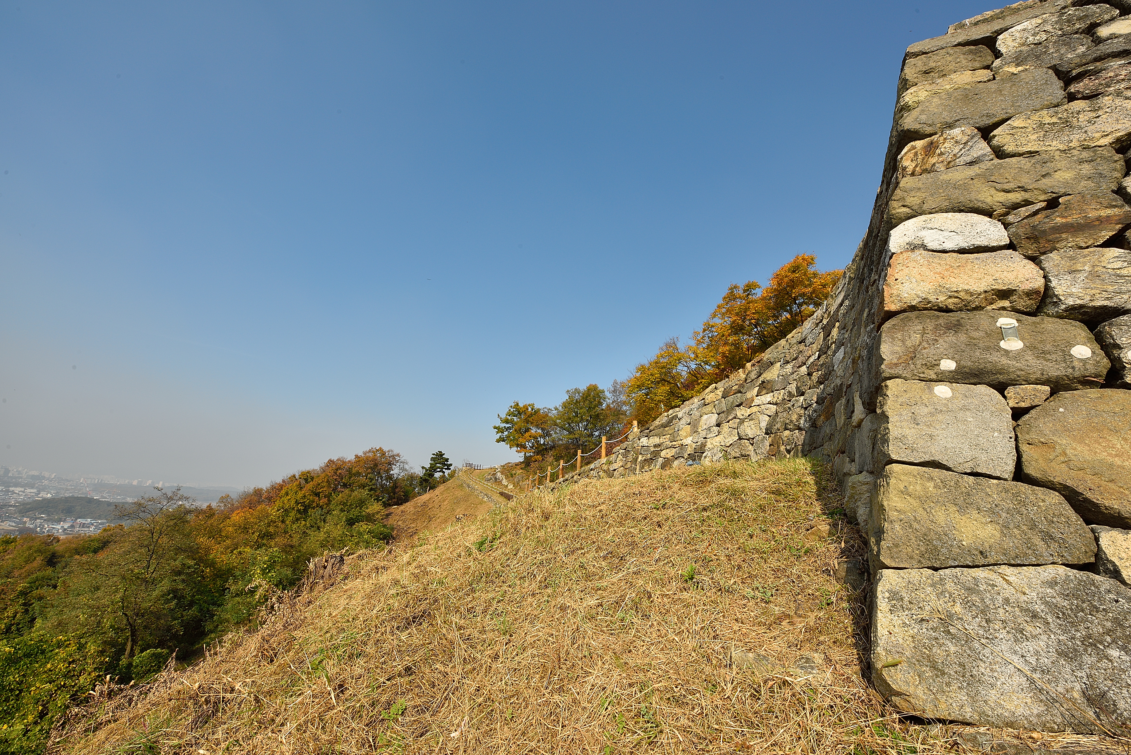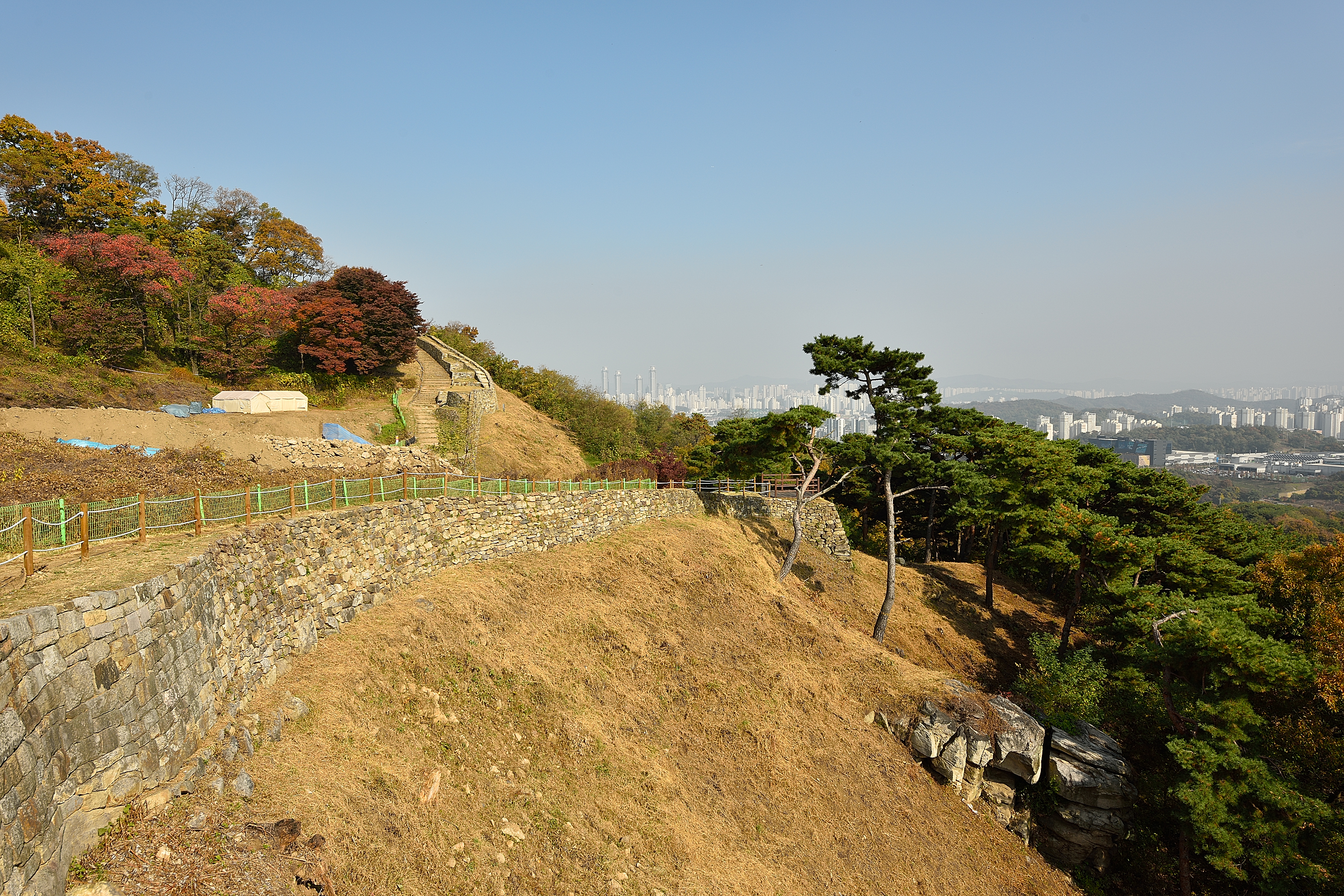 서북성벽 끝 치성에서 바라보는 남쪽 방향, 성벽 안쪽으로 말뚝을 박고 줄을 연결해서 안전지대를 만들었다. 예전에 비해 깔끔해진 느낌이었다.