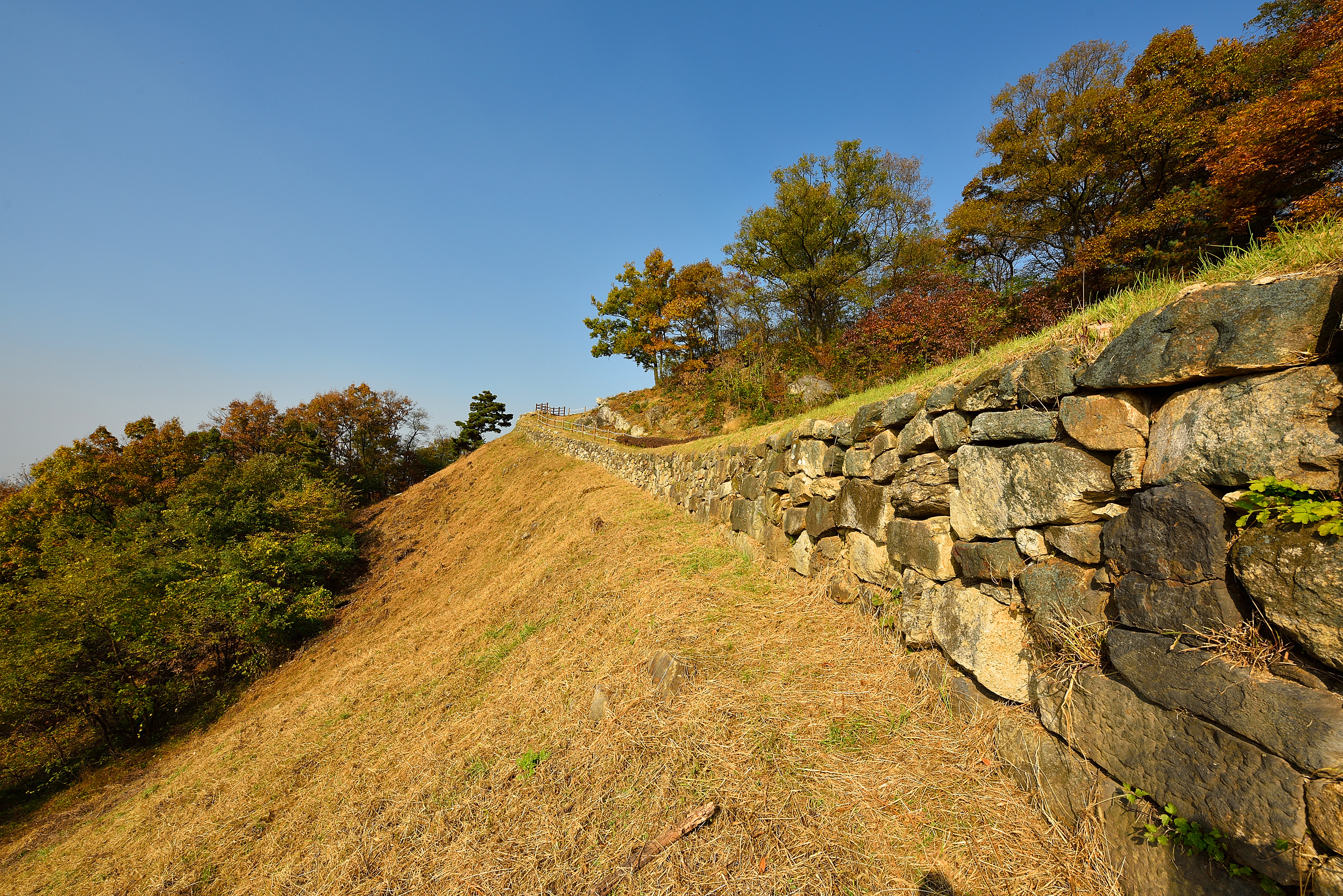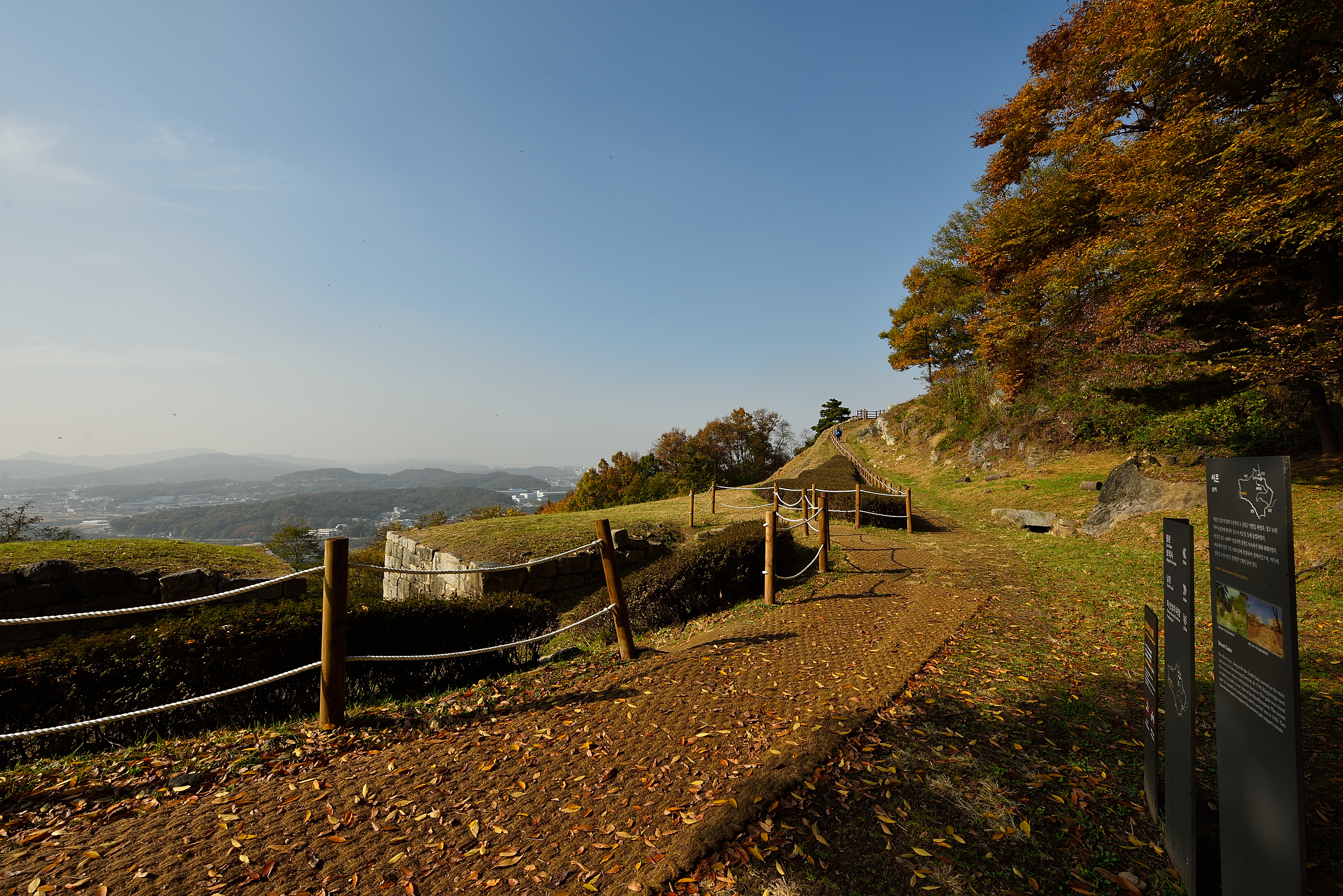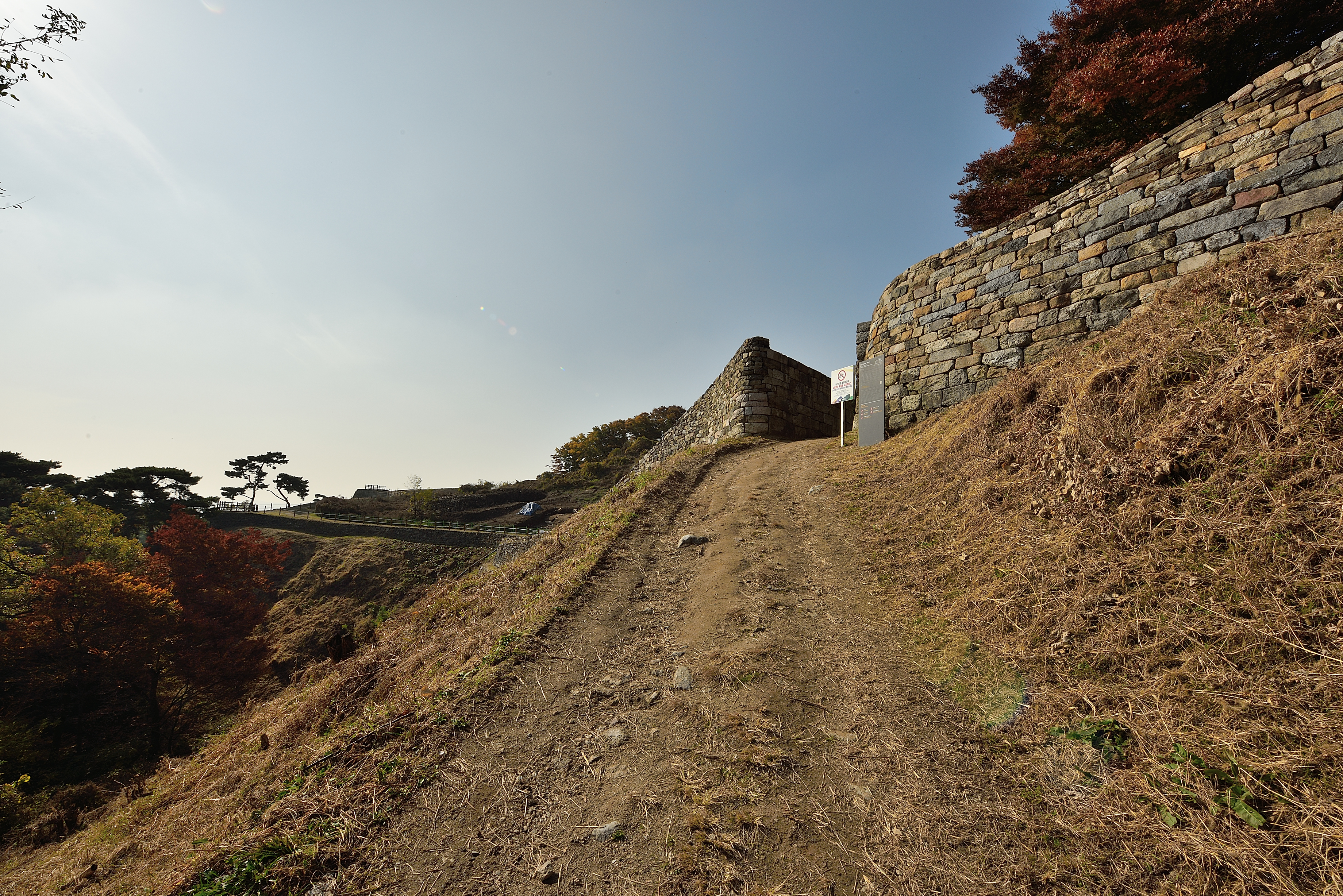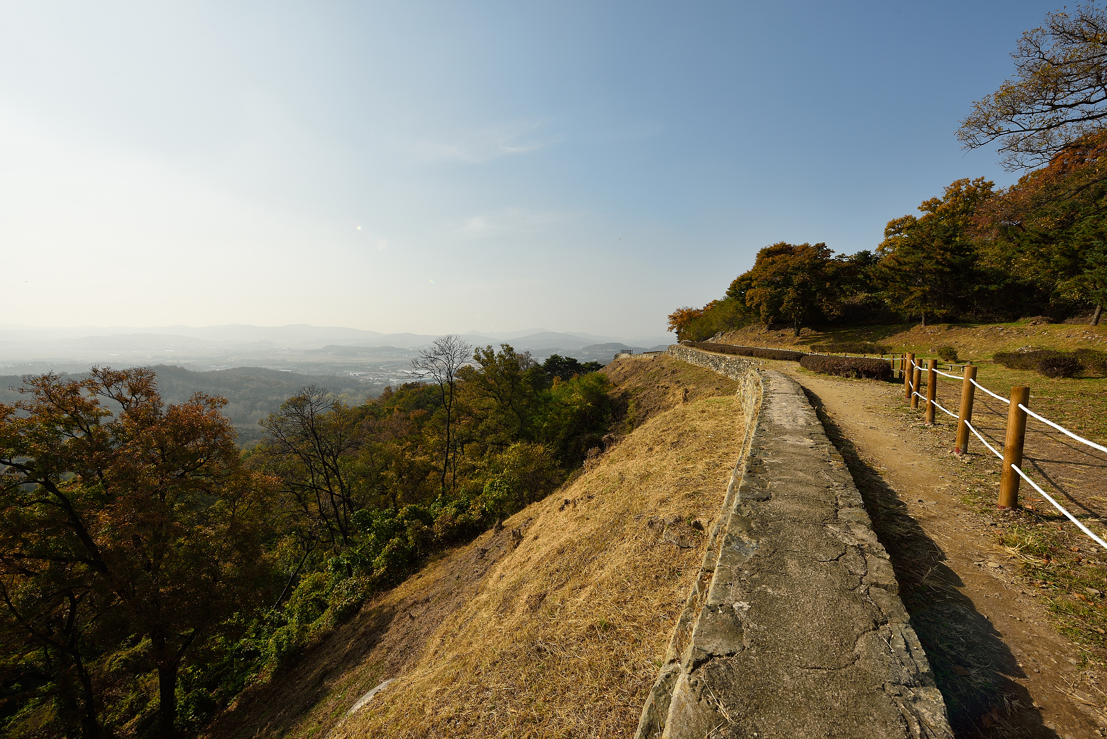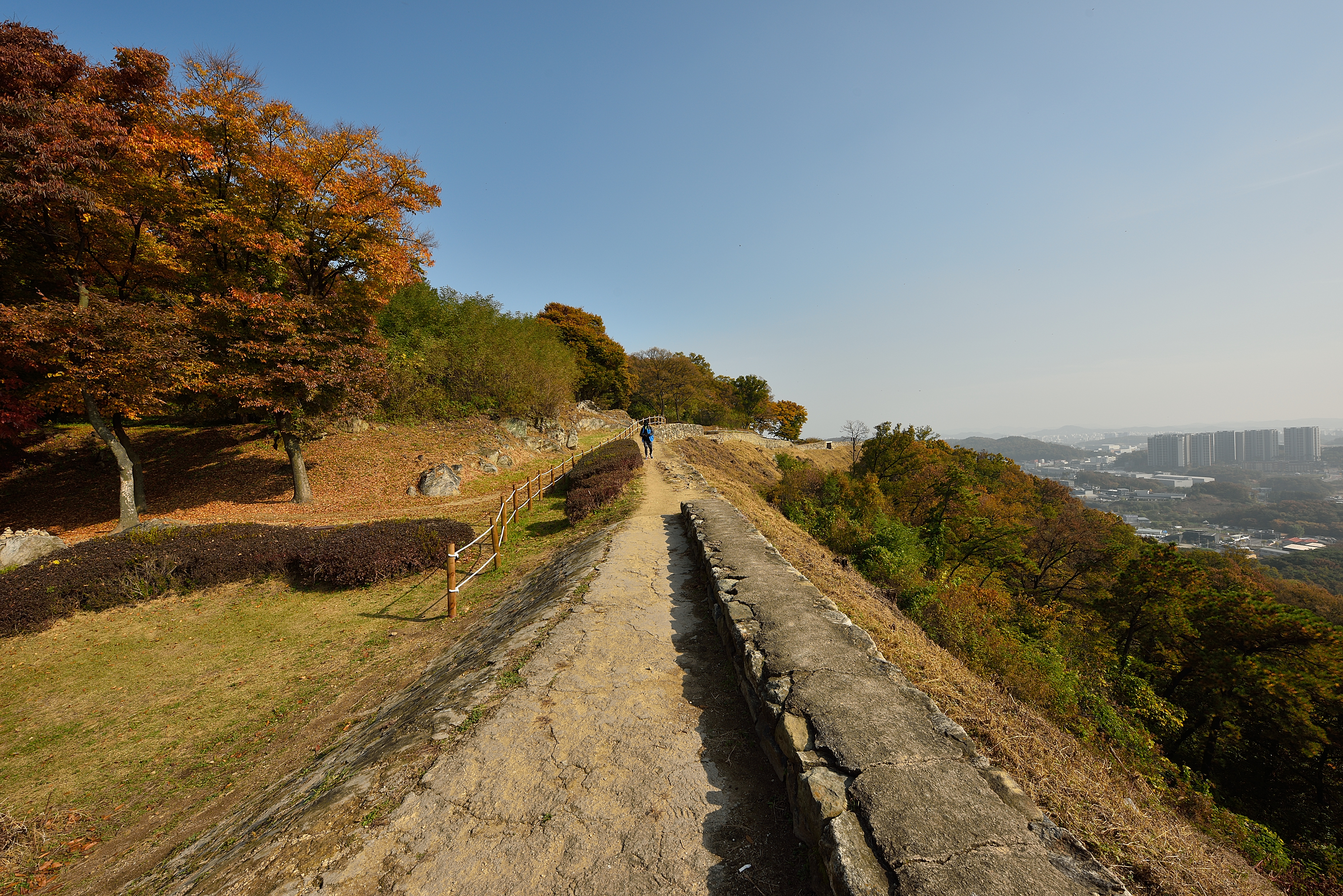서북성벽 끝 치성에서 바라보는 남쪽 방향, 성벽 안쪽으로 말뚝을 박고 줄을 연결해서 안전지대를 만들었다. 예전에 비해 깔끔해진 느낌이었다.