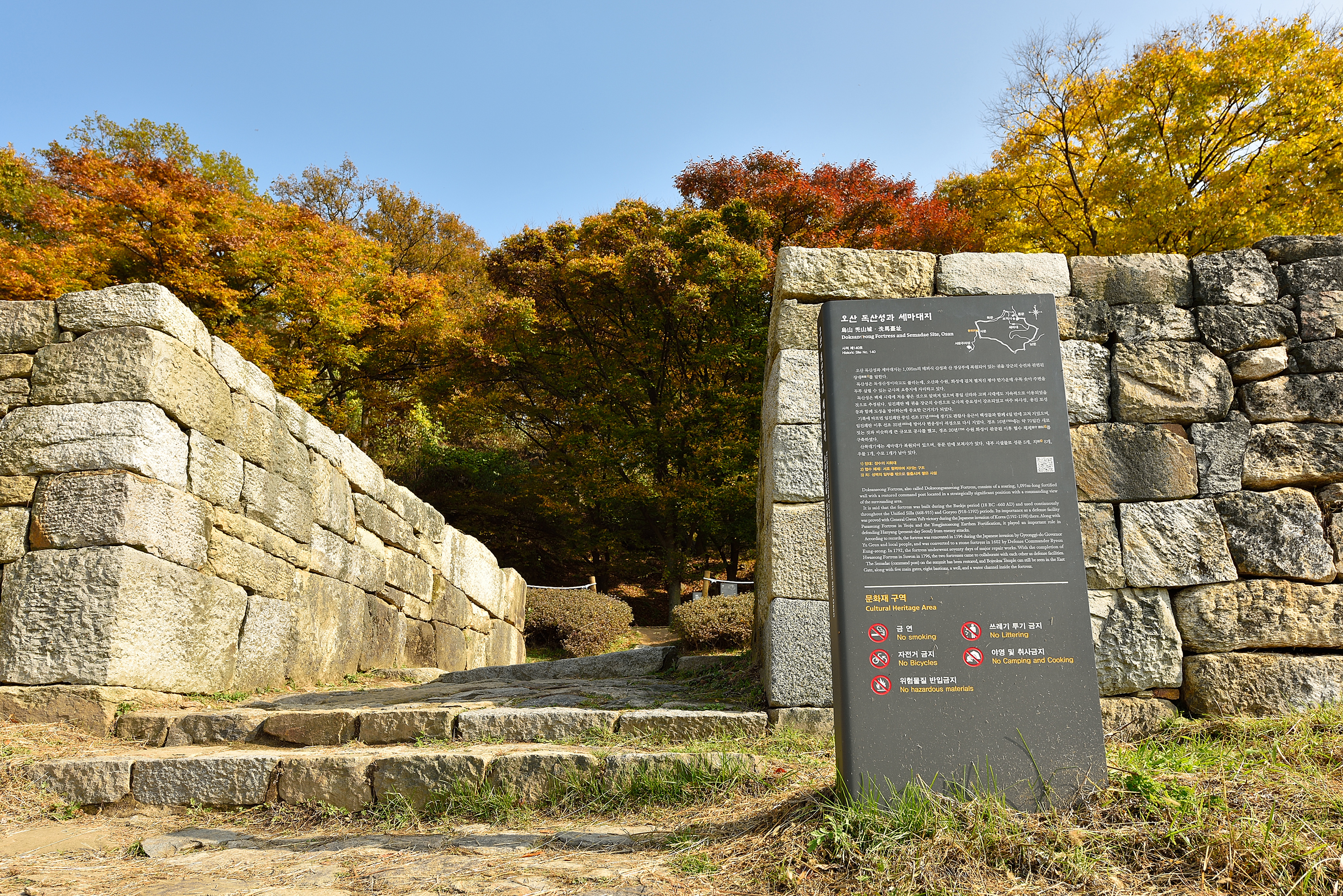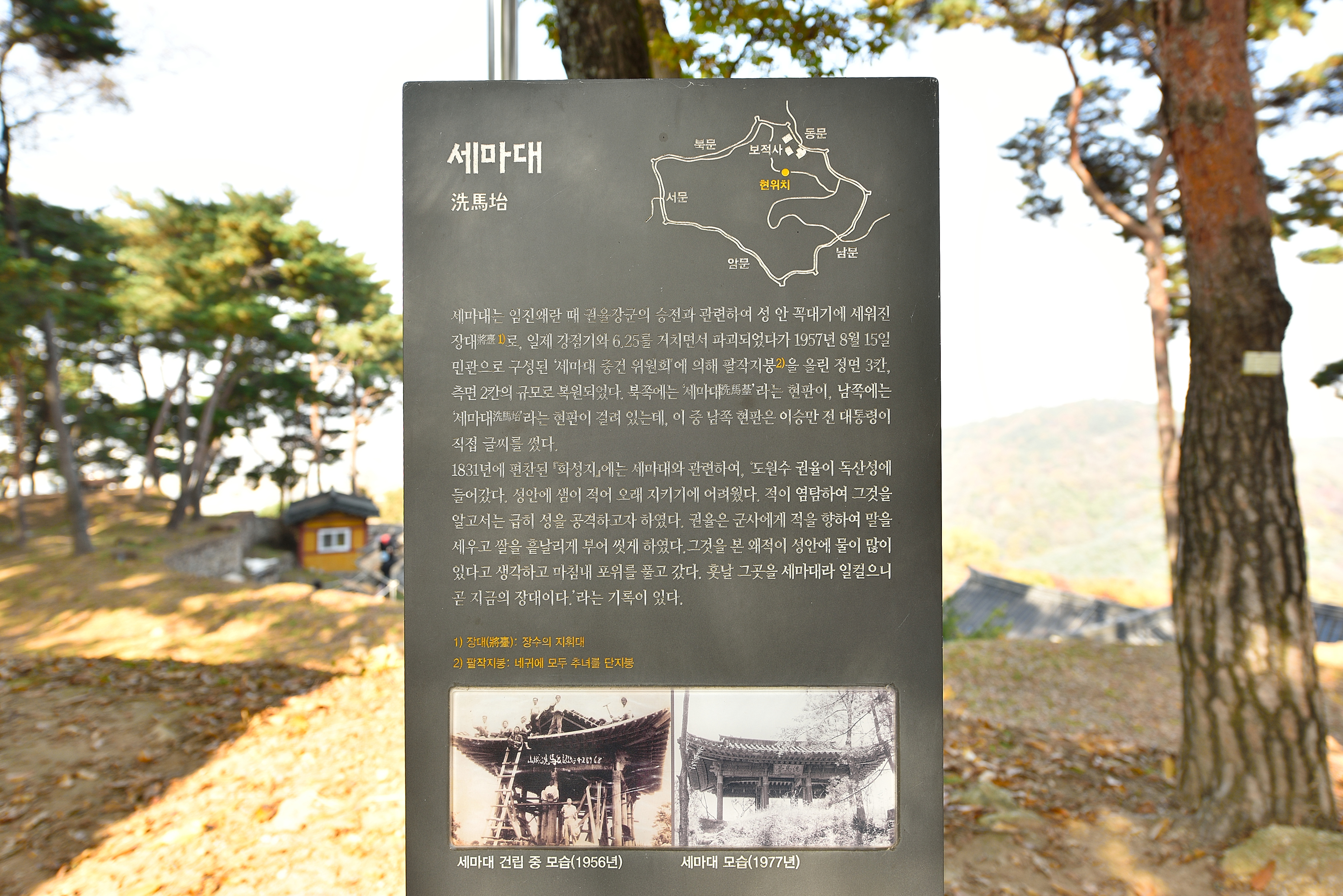 세마대, 임진왜란 당시 권율 장군이 흰쌀로 말을 씻어 왜적을 속였다는 곳으로 독산성의 전투 지휘소이다.