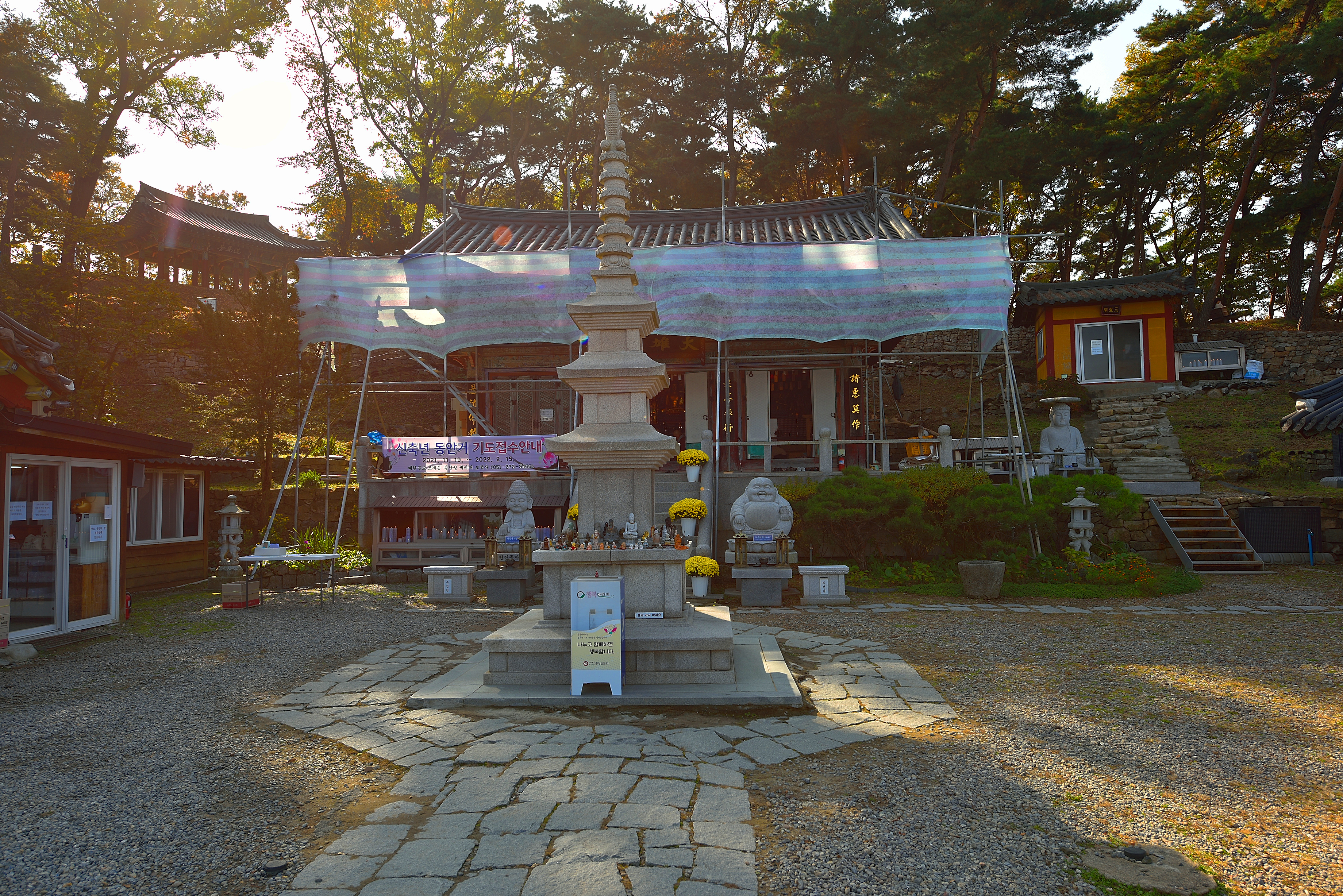가림막을 치고 보수 공사하는 보적사, 오른쪽에 좌불 석상을 새로 모셨다.