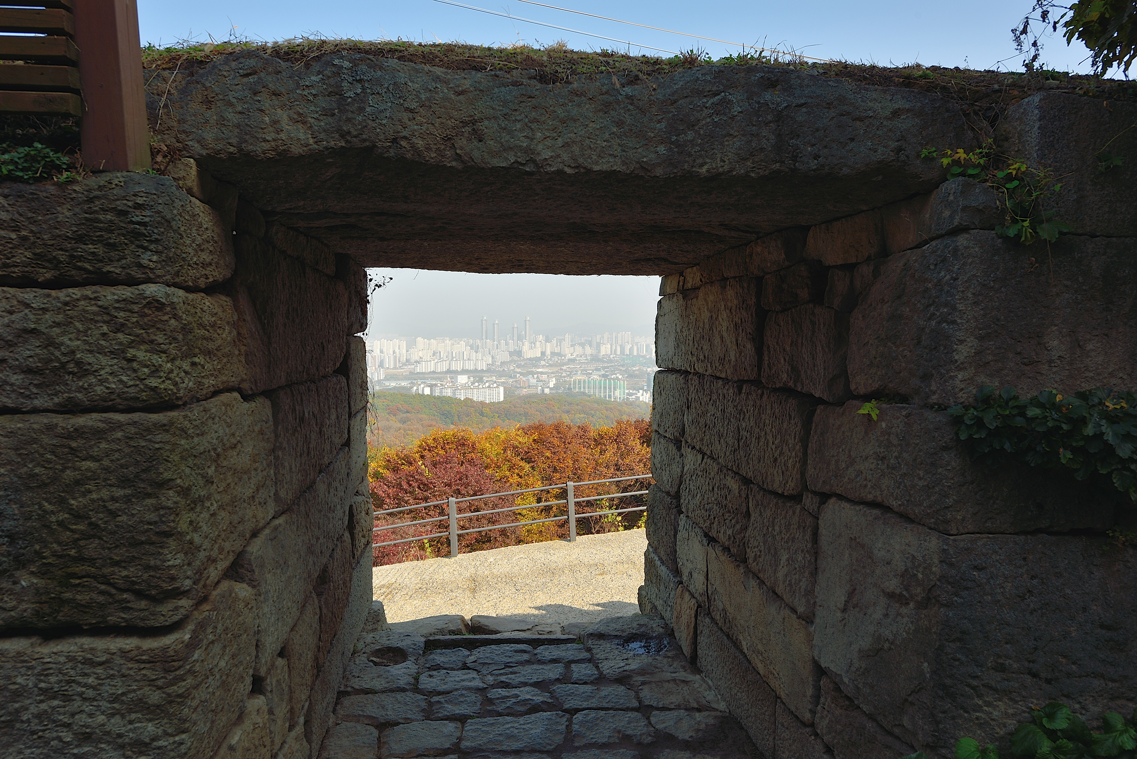 독산성 동문, 멀리 보이는 동탄신도시,동문은 성 아래에서 성안의 보적사로 드나드는 출입문이기도 하다.