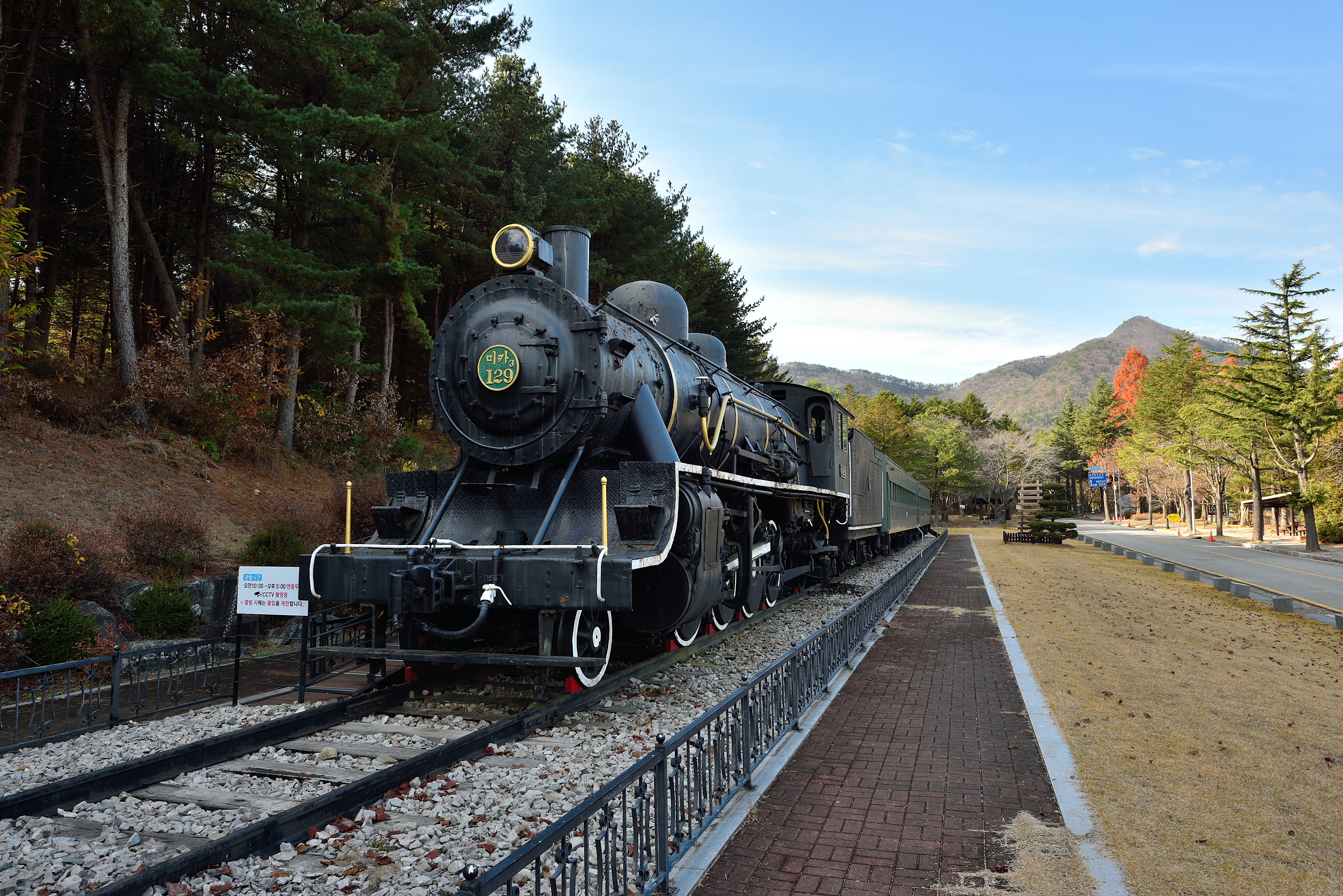 철도 유공자를 위한 기념관인 미카 129호 증기 기관차와 객차.