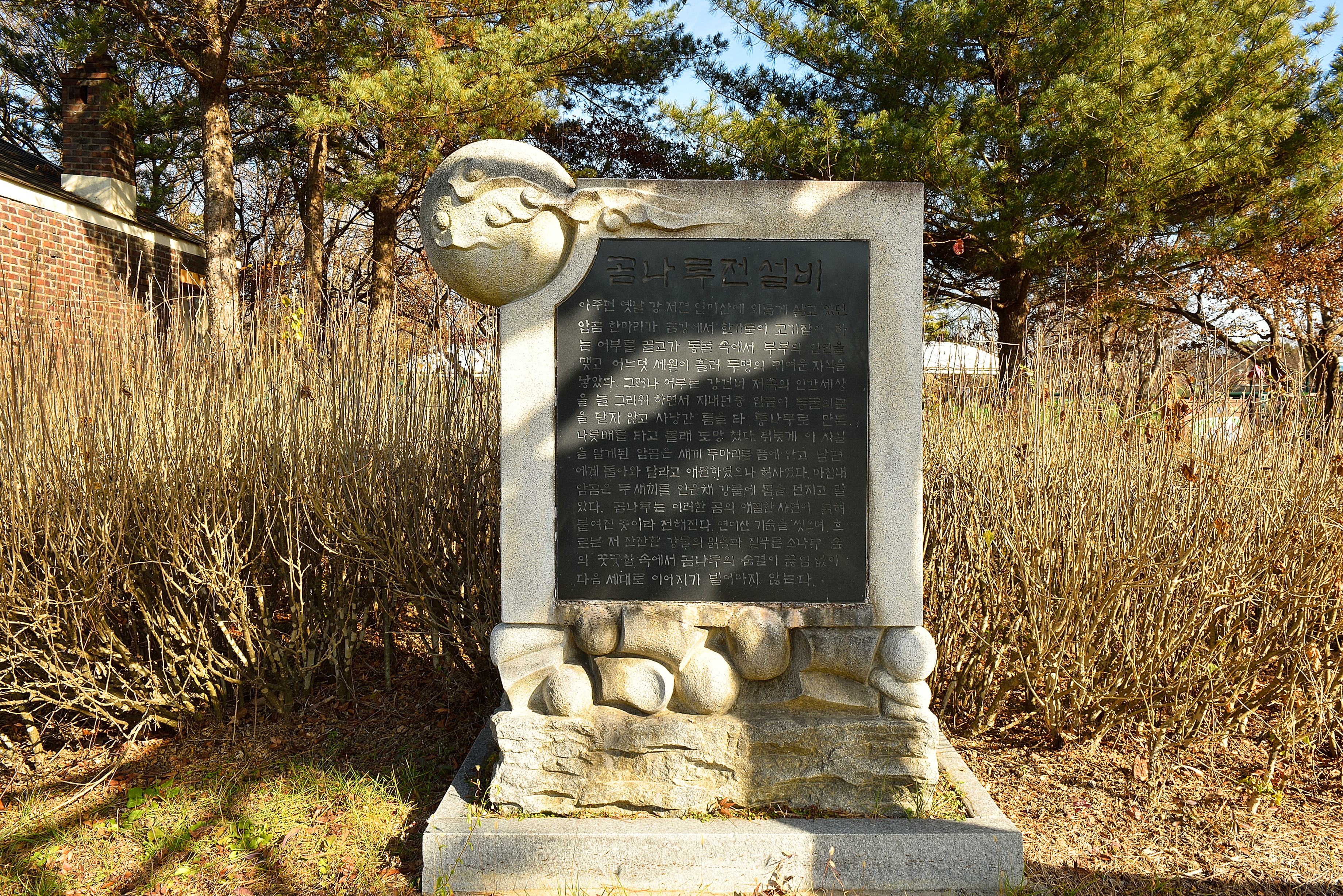 웅신단비문 - 금강의 물이 남동편으로 휘어돌고/ 여미산 올려다뵈는 한갓진 나루터/ 공주의 옛 사연 자욱하게 서린 곳/ 입에서 입으로 그냥 전하여온 애틋한 이야기/ 아득한 옛날 한 남자 큰 암곰에게 몸이 붙들리어/ 어느덧 애기까지 얻게 된다. 허나 남자는 강을 건너버리고 하늘이 무너져 내린 암곰/ 자식과 함께 강물에 몸을 던진다./ 여긴 물살이 달라지는 곳이어서/ 배는 자주 엎어지곤 하였다./ 곰의 원혼 탓일까 하고 사람들은 해마다 정성을 드렸는데/ 그 연원 멀리 백제에까지 걸친다./ 공주의 옛이름 웅진 고마나루/ 그 이름 아직 여기에 있어/ 백제 때 숨결을 남기고 있다./ 공주사범대학 백제문화연구소 찬