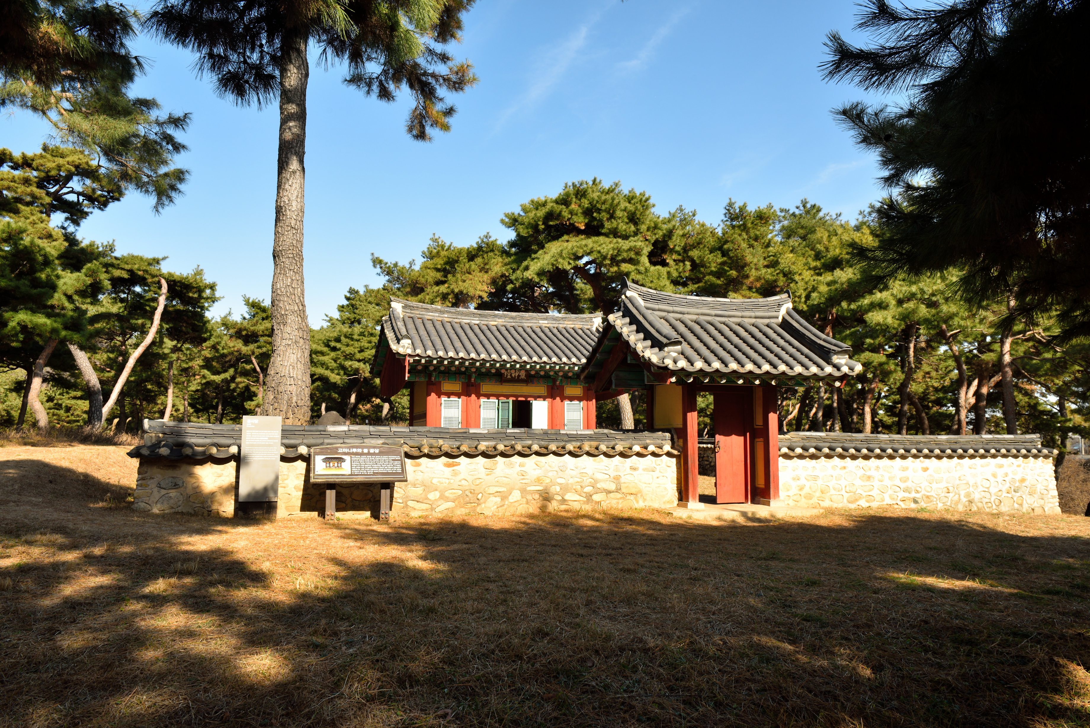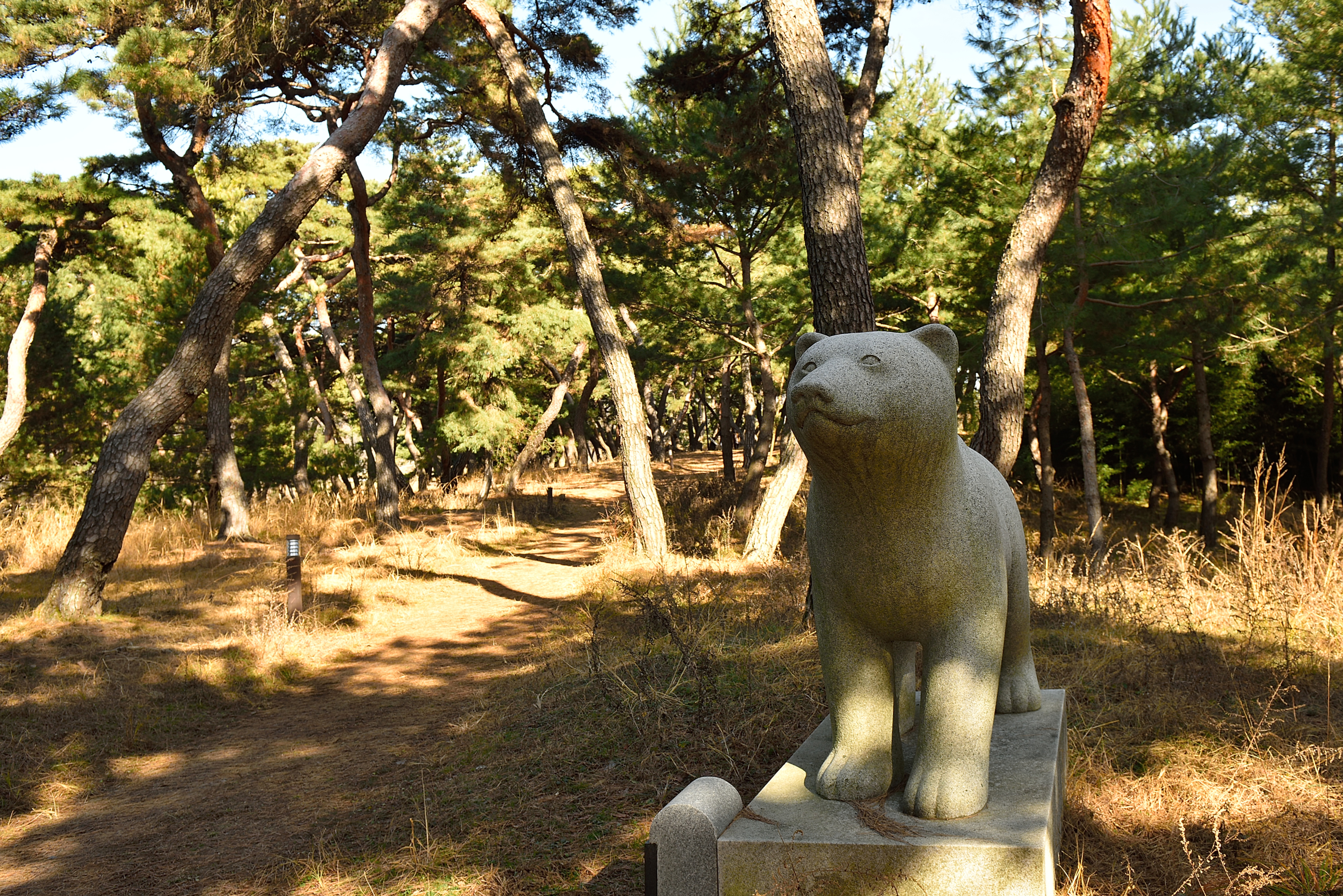 도로 건너 곰 사당으로 가는 소나무 숲길