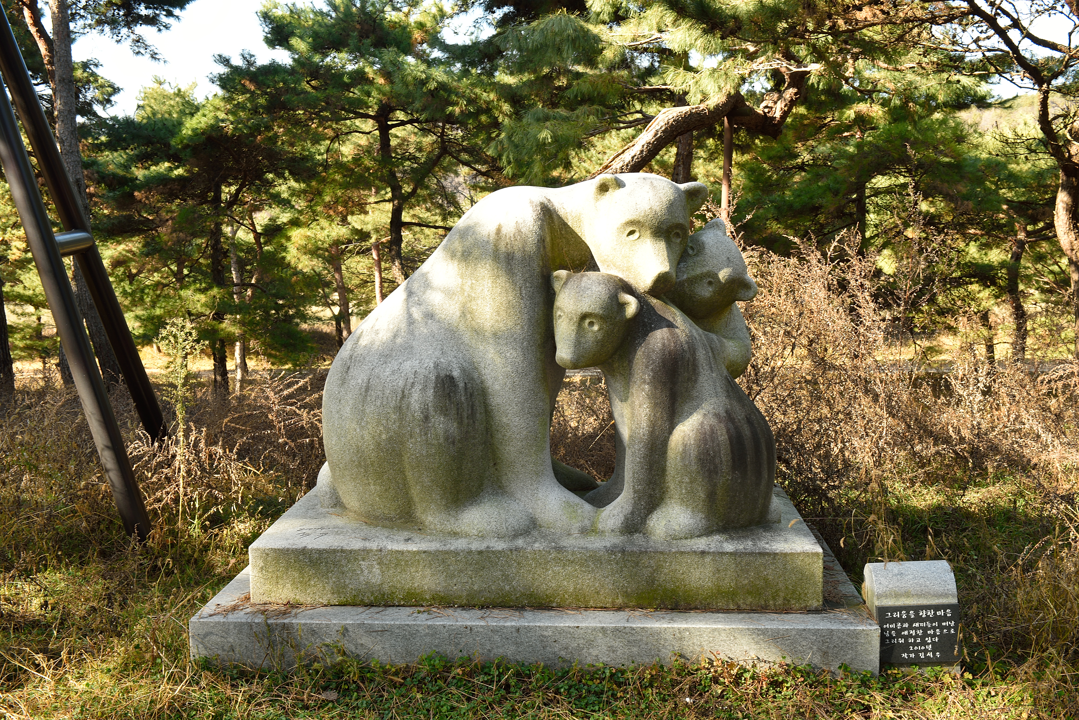 도로를 건너 잡풀이 우거지고 인적도 없는 숲 속에서 사람의 흔적을 찾아 숲길 흔적을 찾아 앞으로 나갔다. 드디어 숲길을 찾았다, 핸드폰을 보며 곰사당으로 걸었다. 소나무가 가득한 숲길 주변에 곰 조각들이 보였다. 그리고 곰사당 지붕도 나타났고...