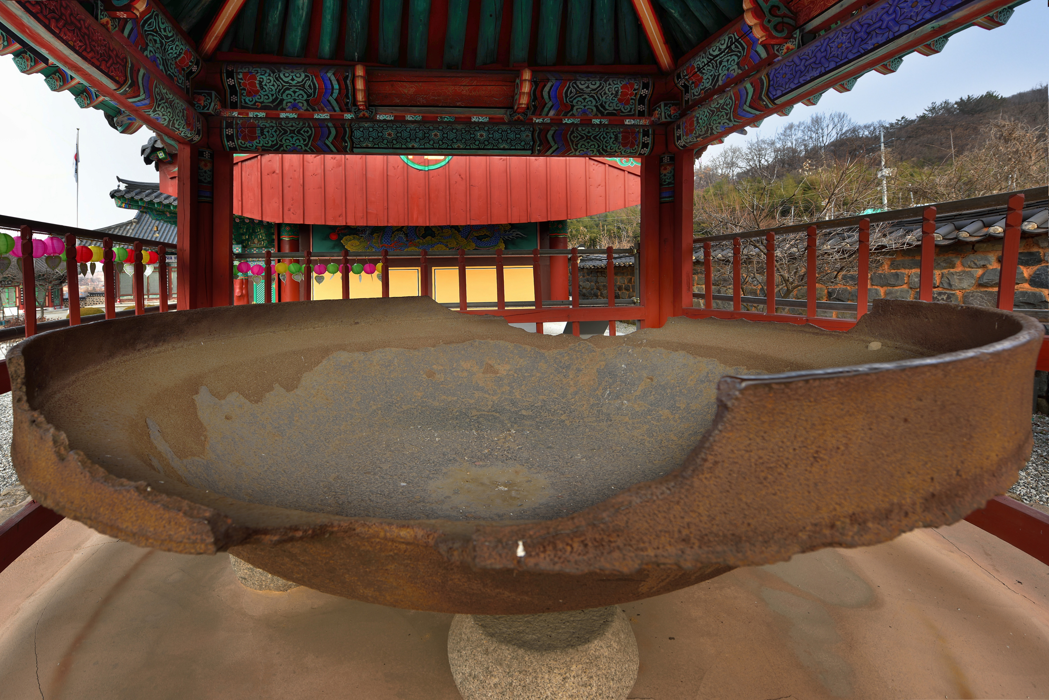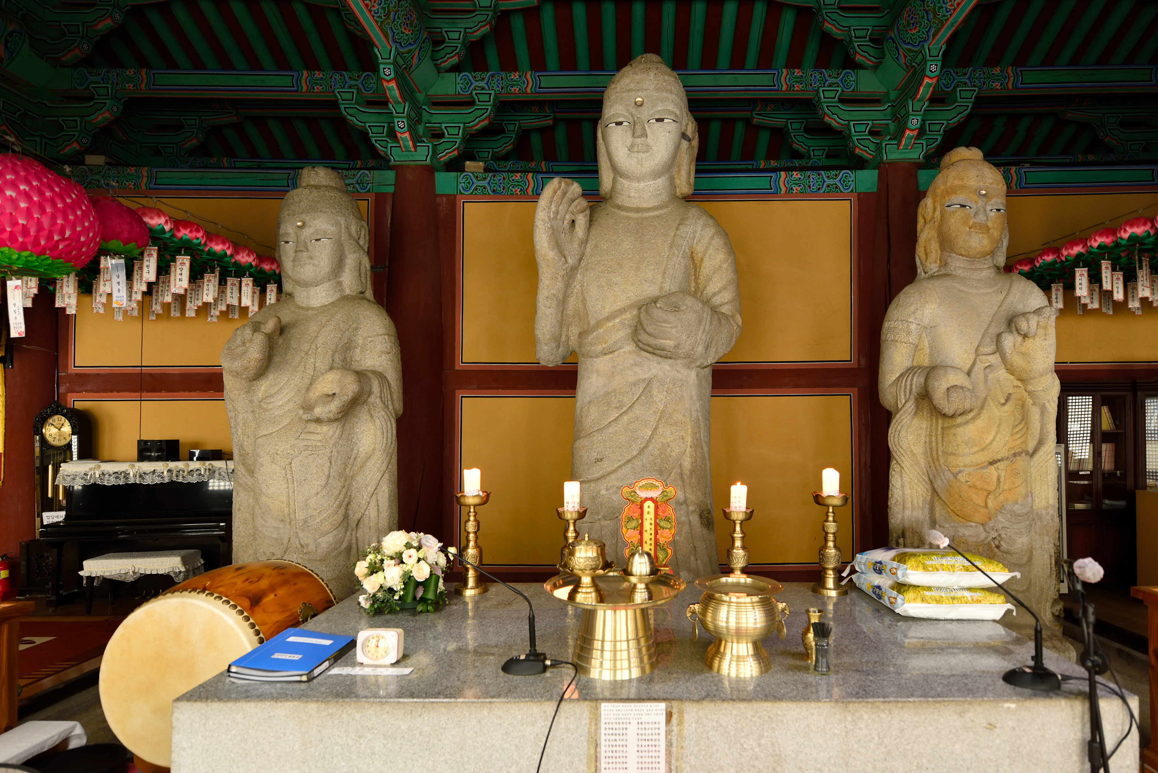 극락대보전 안에 모신 석조여래삼존불입상, 서양의 교회에 가면 사실적으로 조각한 석상들이 위엄을 뽐내는데, 우리나라 절 안의 조각들은 그저 두리뭉실해서 사실감이 떨어진다. 신체균형도 맞지 않고 손의 모양도 크기가 맞지 않아 태조 왕건이 개태사를 창건할 때의 것인지 의심스럽다. 아무튼 개태사지에서 모셔온 것이라 하니 역사성에 의미를 두어야 할 것 같다. 석굴암 본존불이나 금동미륵반가사유상 서산 마애삼존불 같은 훌륭한 걸작들이 있음에도 고려를 개국하며 세운 국가원찰의 삼존불로는 아쉬운 점이 많아 보인다. 사진촬영금지 구역이나 스님께 양해를 구하고 촬영했다.