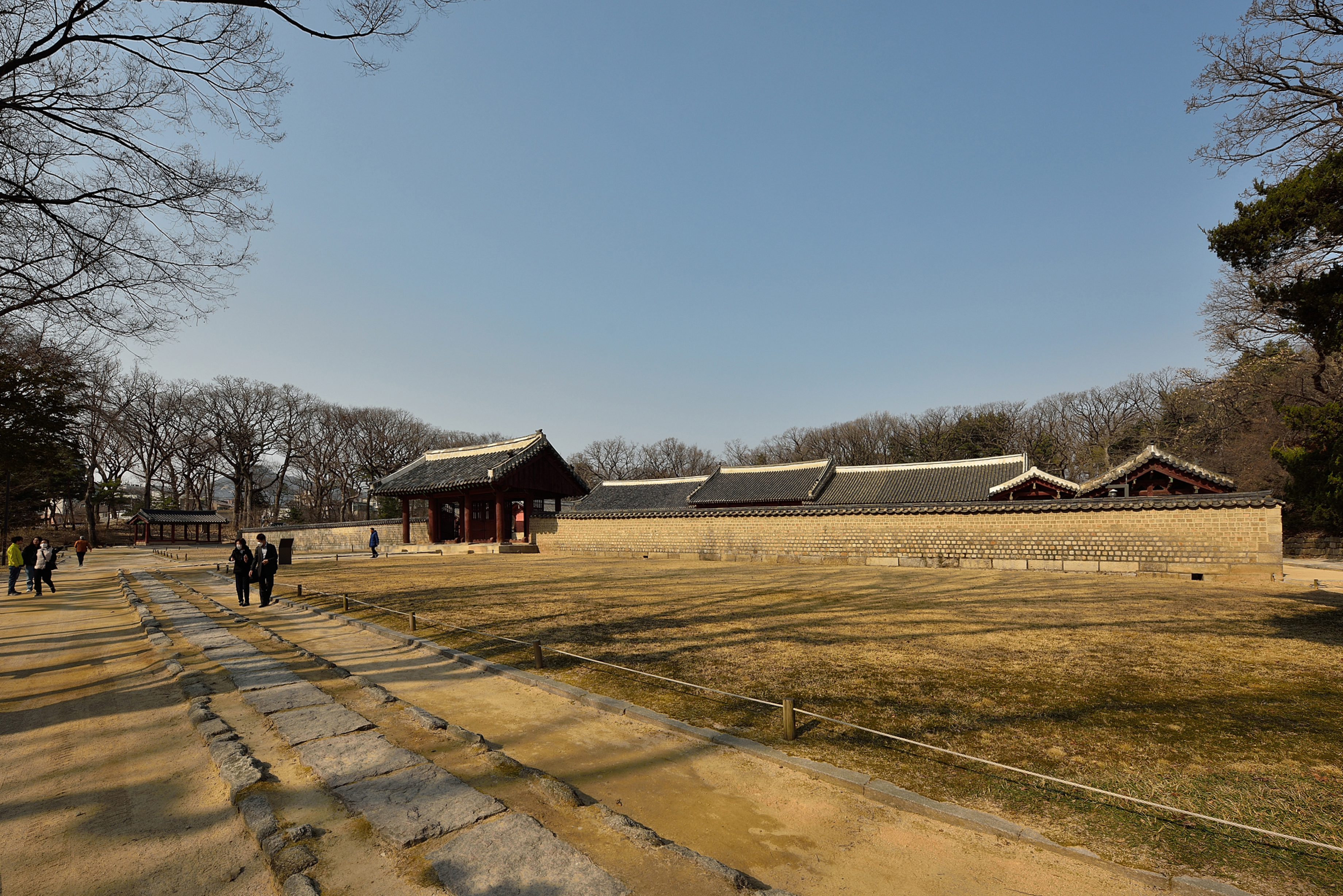 보수 중인 정전, 왼쪽의 정문과 담벽에 붙은 공신당. 공신당은 조선 왕조 역대 공신들의 위패를 모신 곳이다. 동쪽문은 현재 출입이 금지되었고 그 앞의 제수를 준비하던 전사청도 멀리서만 바라보았다.