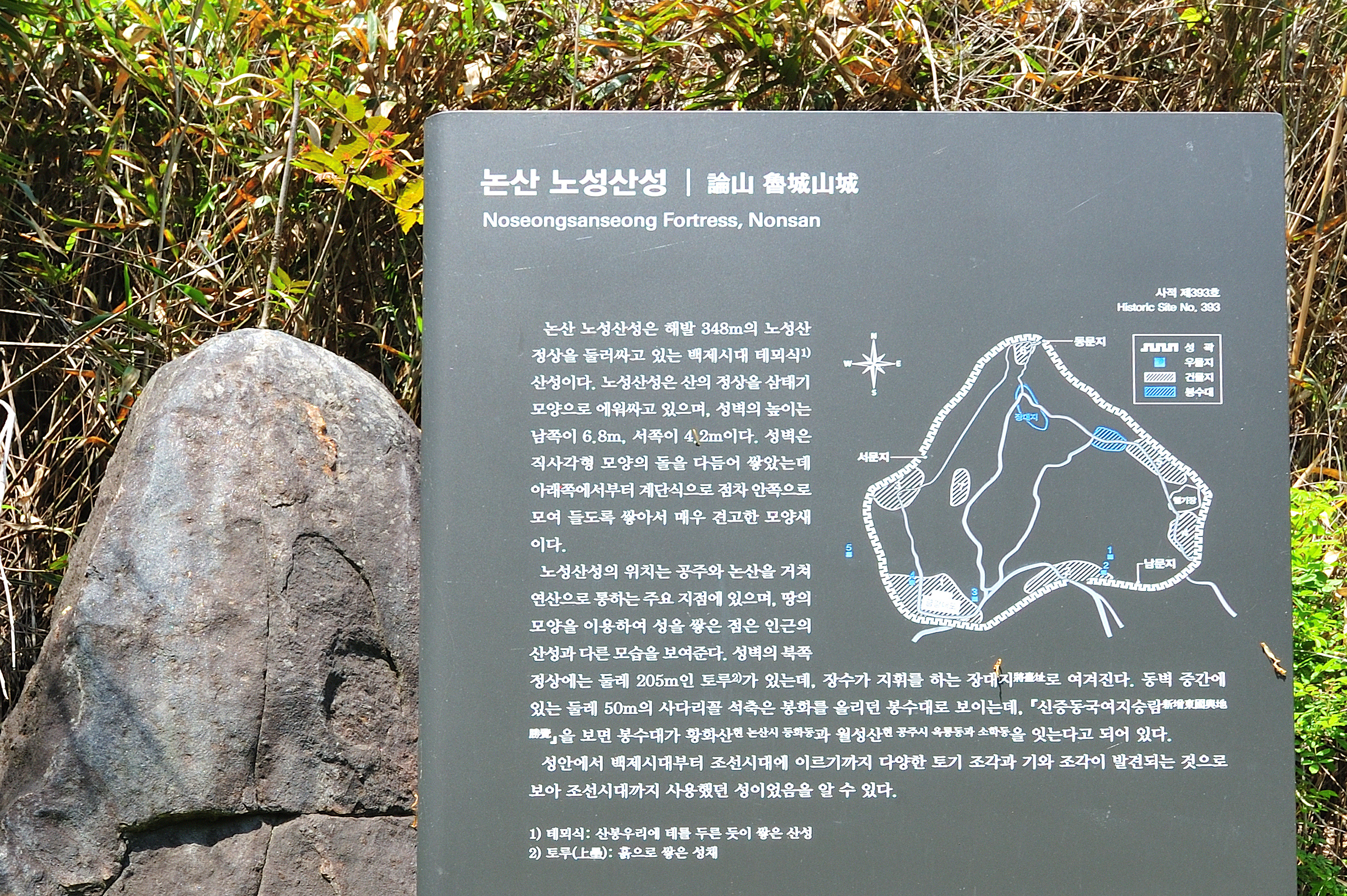 작년에 갔었던 황산성에 비해 보존이 잘 되어 있으리란 희망으로 노성산성을 찾았다. 그러나 기대감이 실망감으로 무너지고 말았다. 보수하려 노력은 한 것 같았으나, 새로 쌓은 성벽 부분을 사각으로 쪼아낸 돌로 축대 쌓듯이 만들어 성의 없어 보였다. 문화재청에 공사 감독관도 돌아보지 않았을 성싶었다. 이정표도 없어 올라가는 길에 성이 무너진 흔적인지 돌무더기인지도 모를 돌담 성벽길을 지나 정상까지 올라갔다.