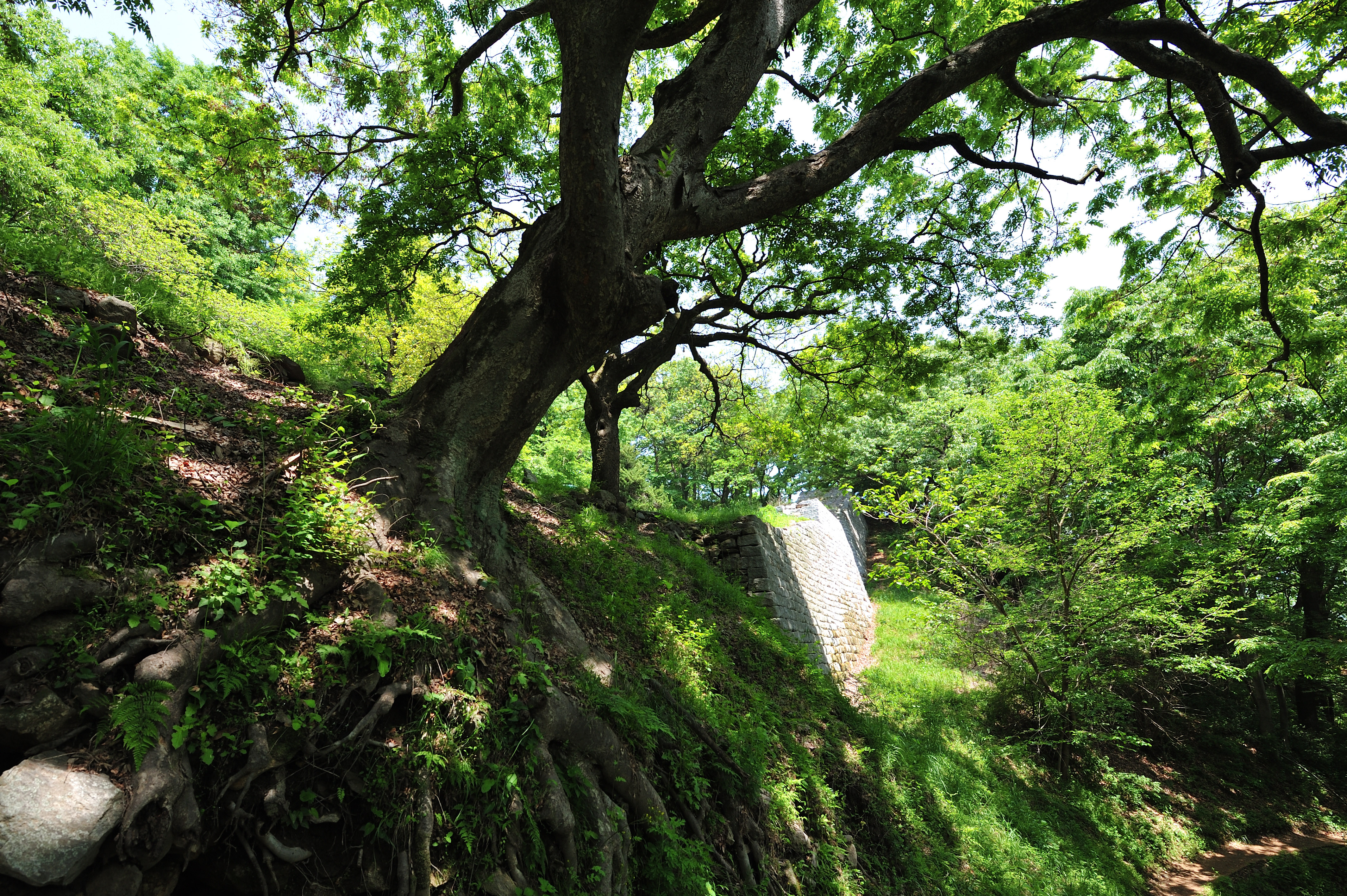 길 건너 아래쪽엣 옛 성벽 위에 새로 석성을 쌓아 복원했다. 여기에도 느티나무가 성벽을 훼손하고 있었다.