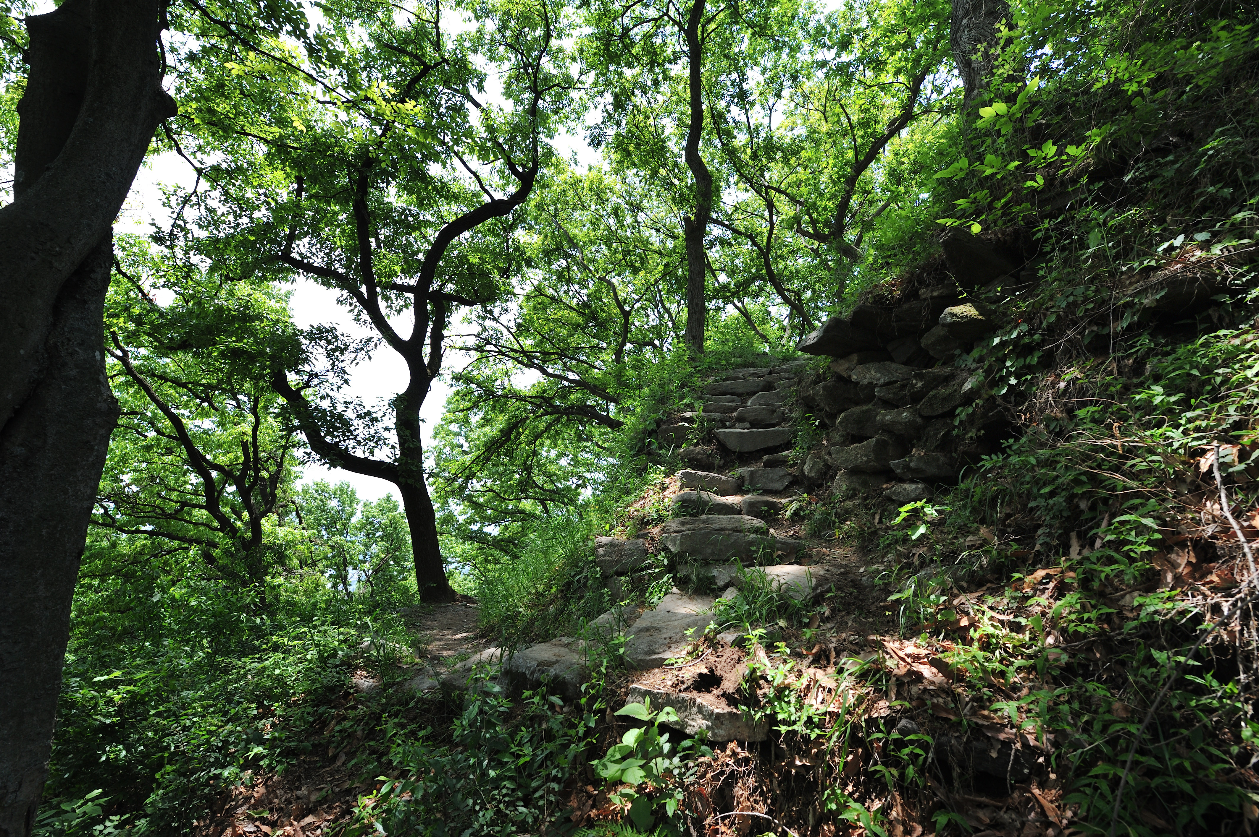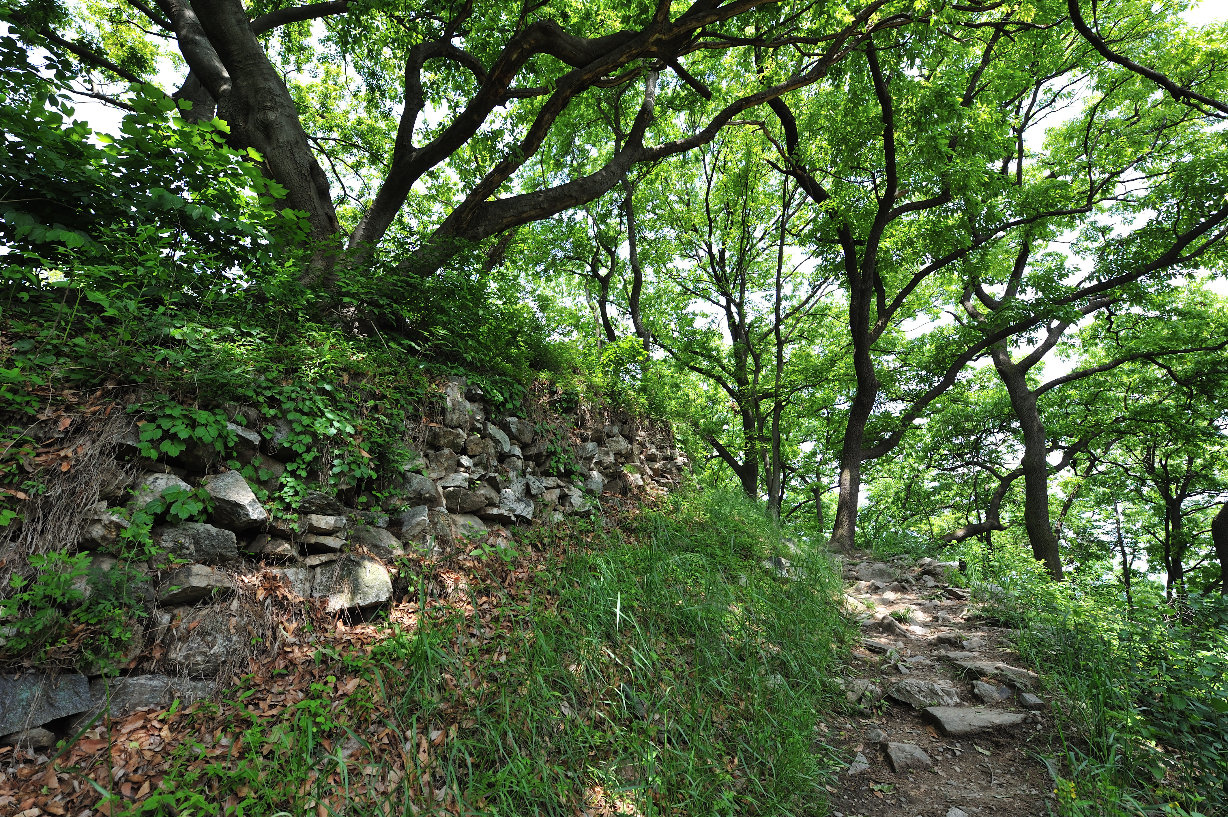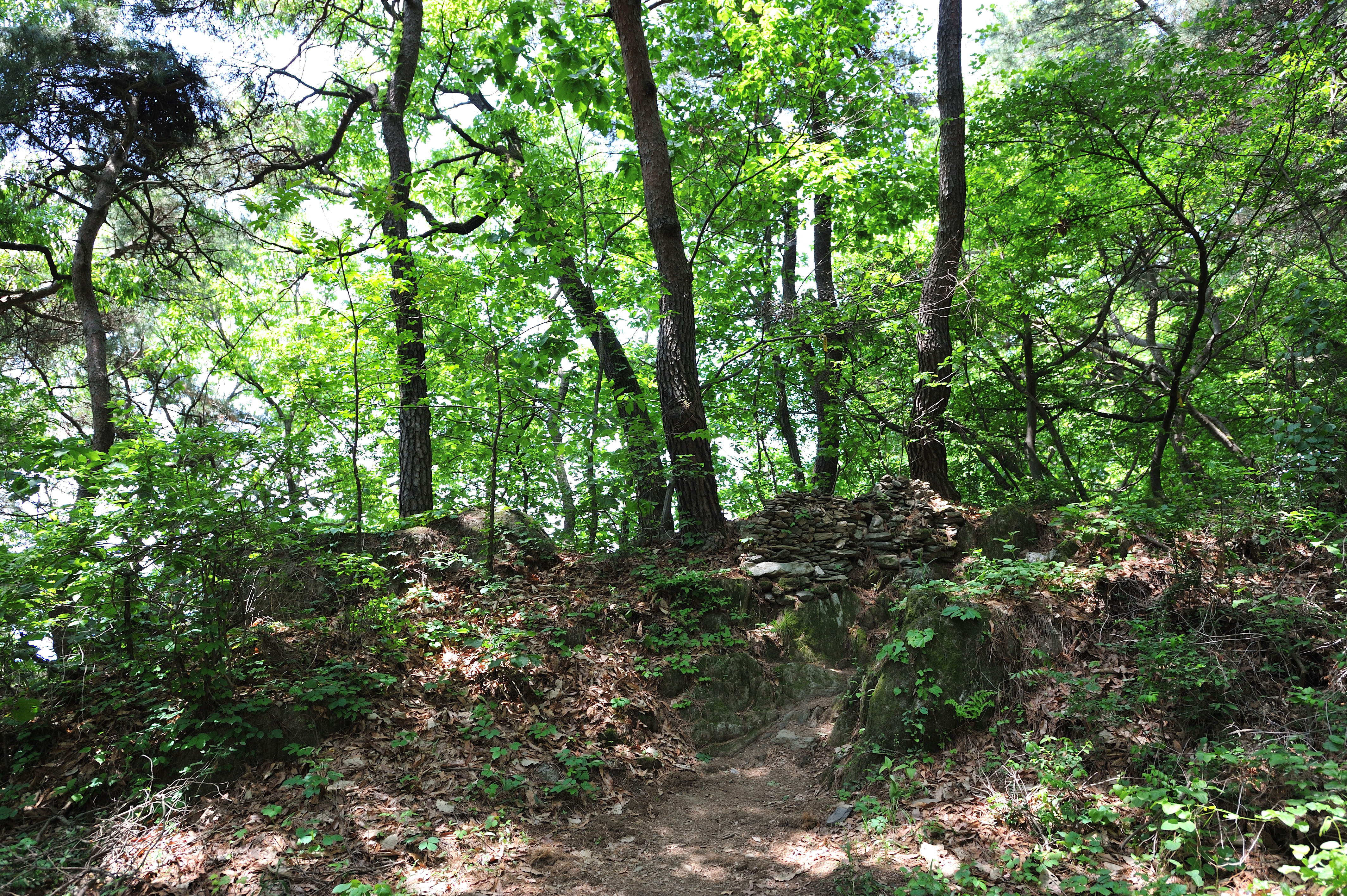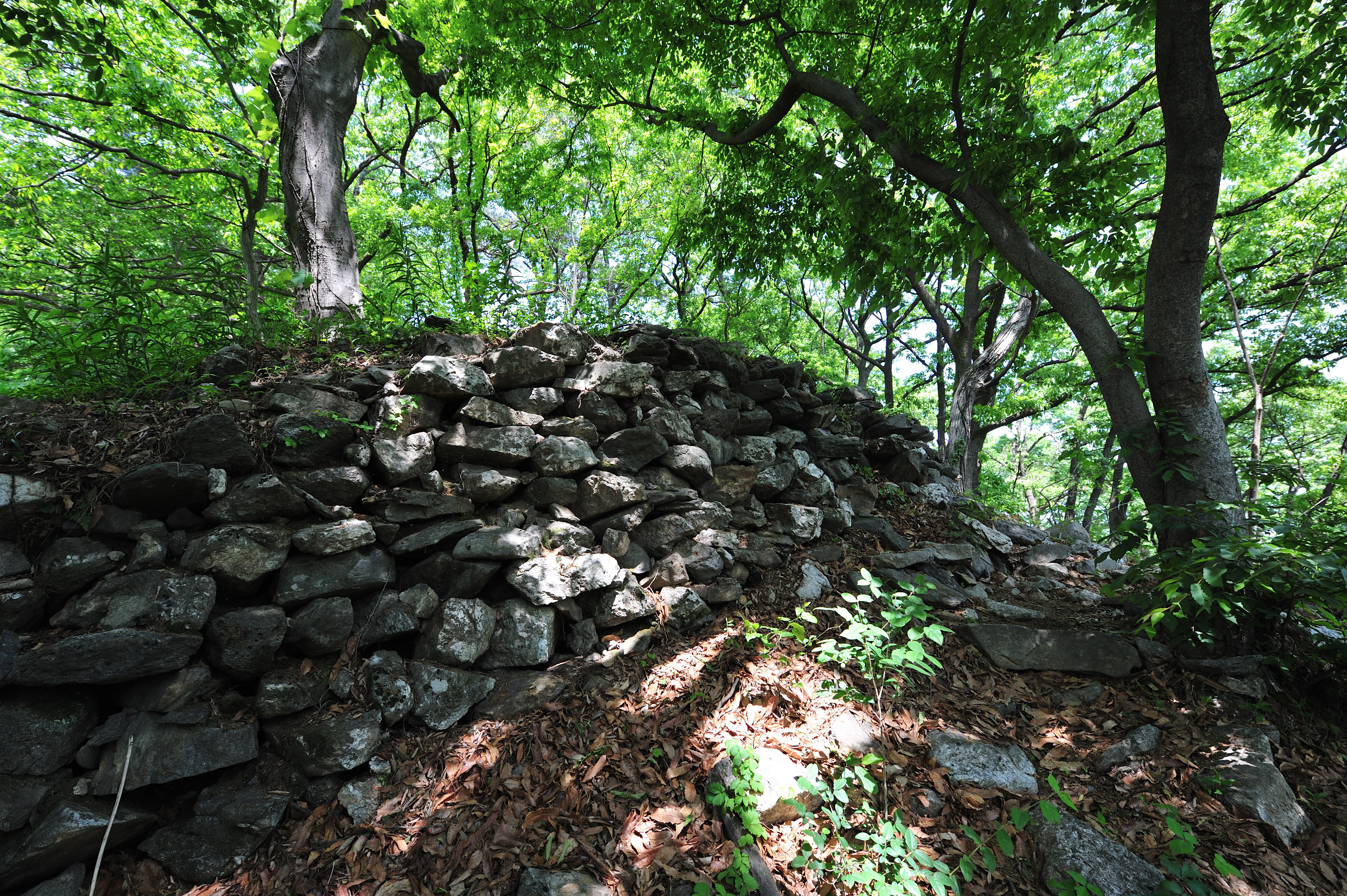 성을 내려오며 아쉬워서 뒤돌아 나무 사이로 보이는 석성을 한 컷 담았다.