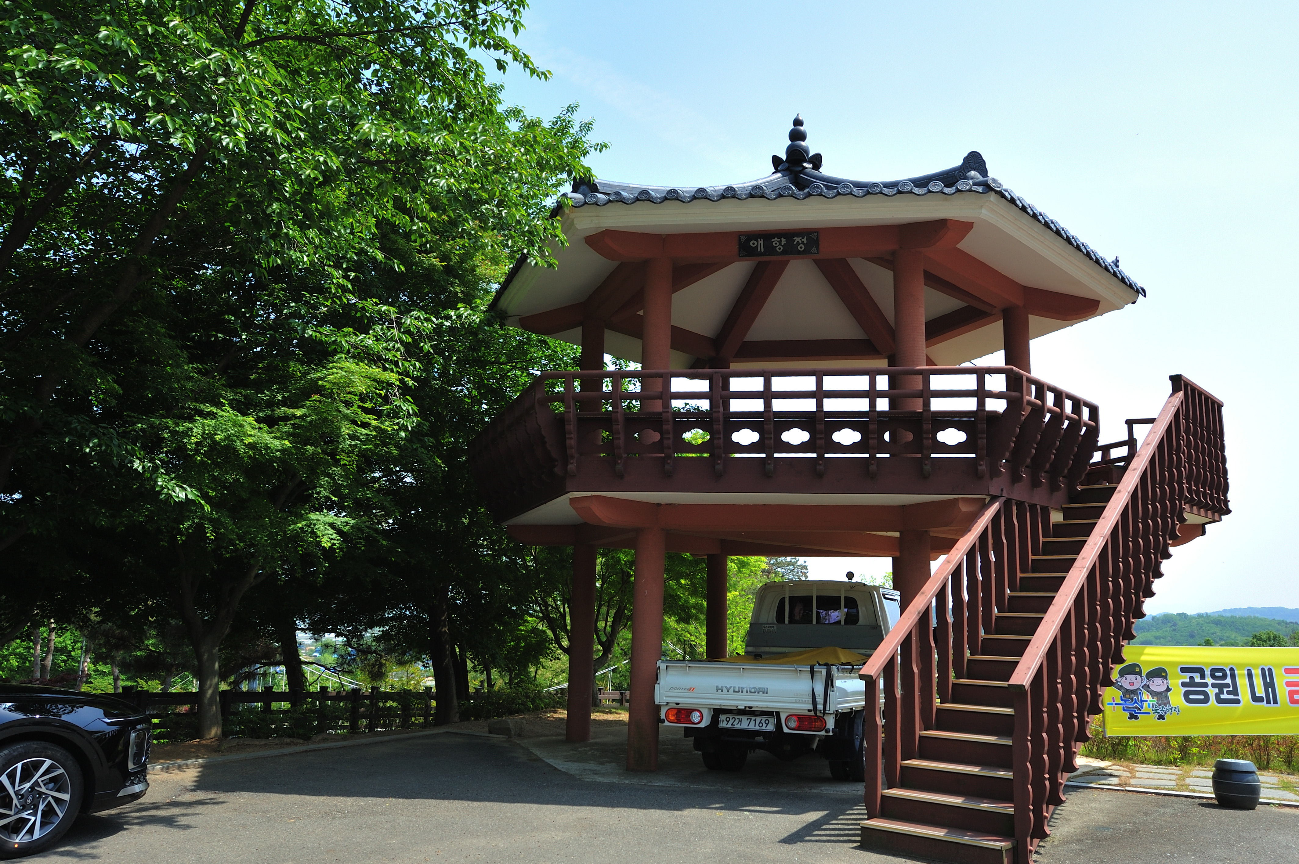 시멘트 콘크리트로 만든 정자. 정자 아래 주차된 화물차. 시원한 그늘이 그리웠던 모양이다.
