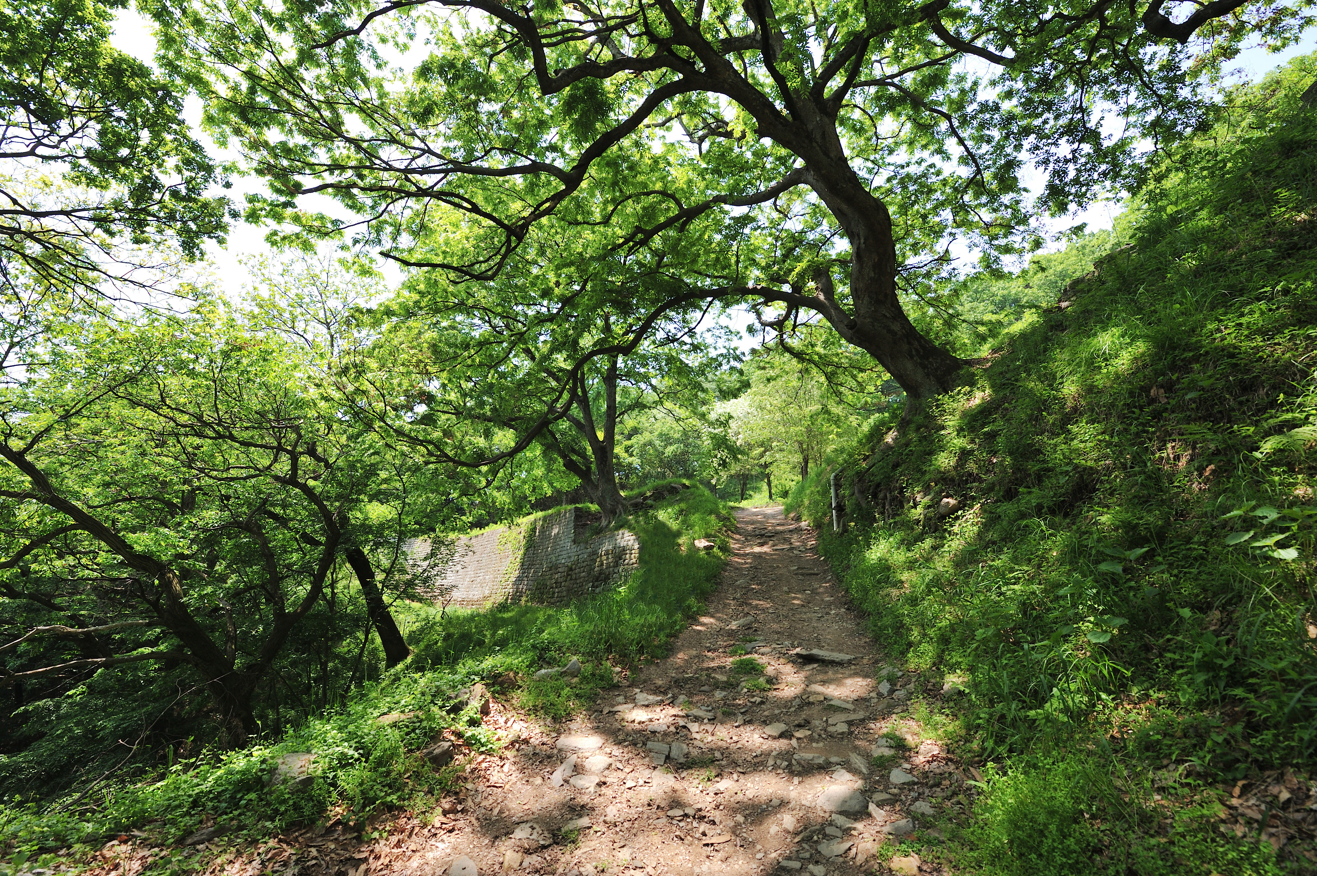 금강대도 노성본원으로 들어가는 길, 허물어진 성벽 사이로 길이 났다. 양쪽으로 큰 느티나무가 성벽에 뿌리를 내리고 있었다.
