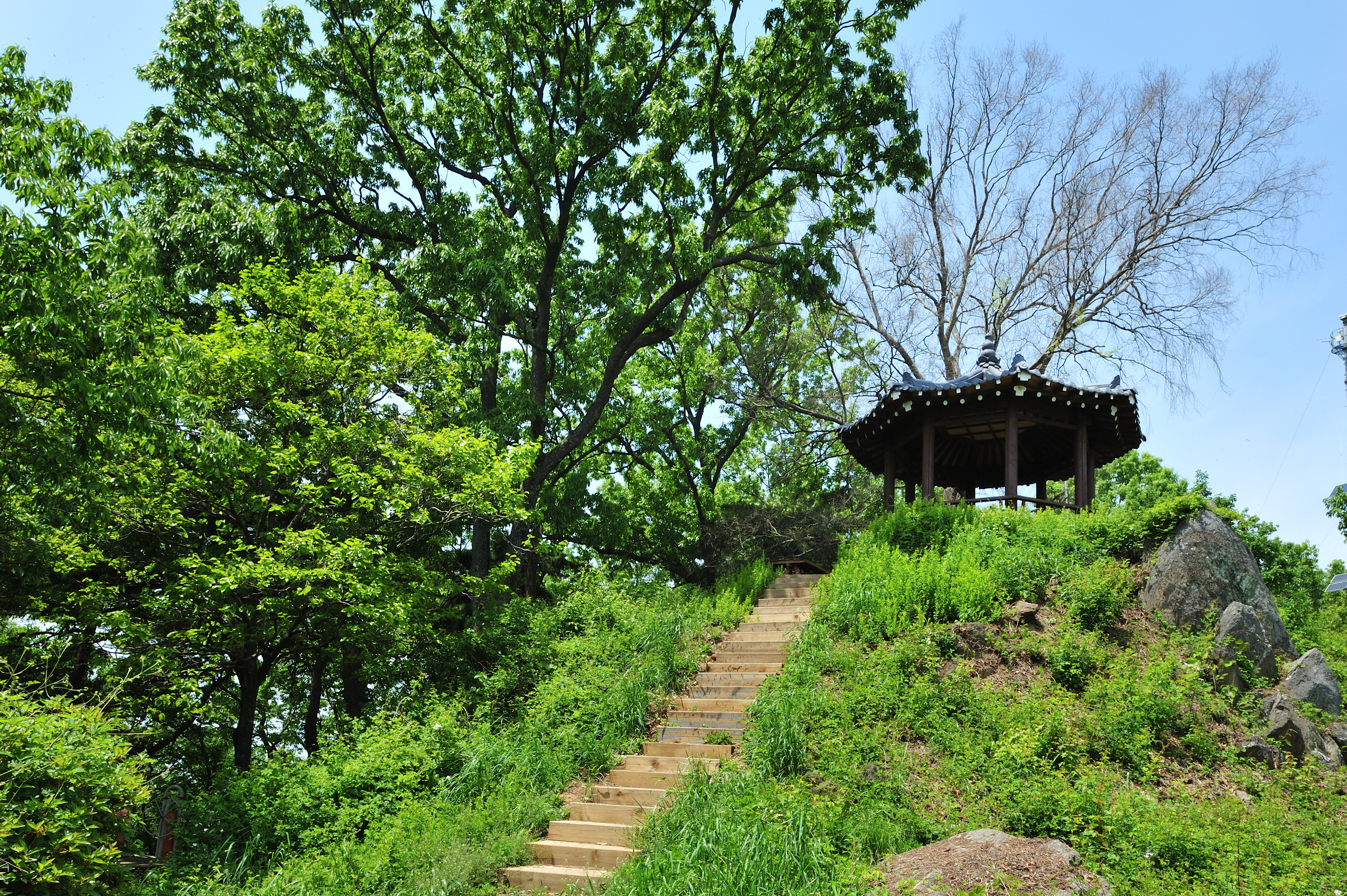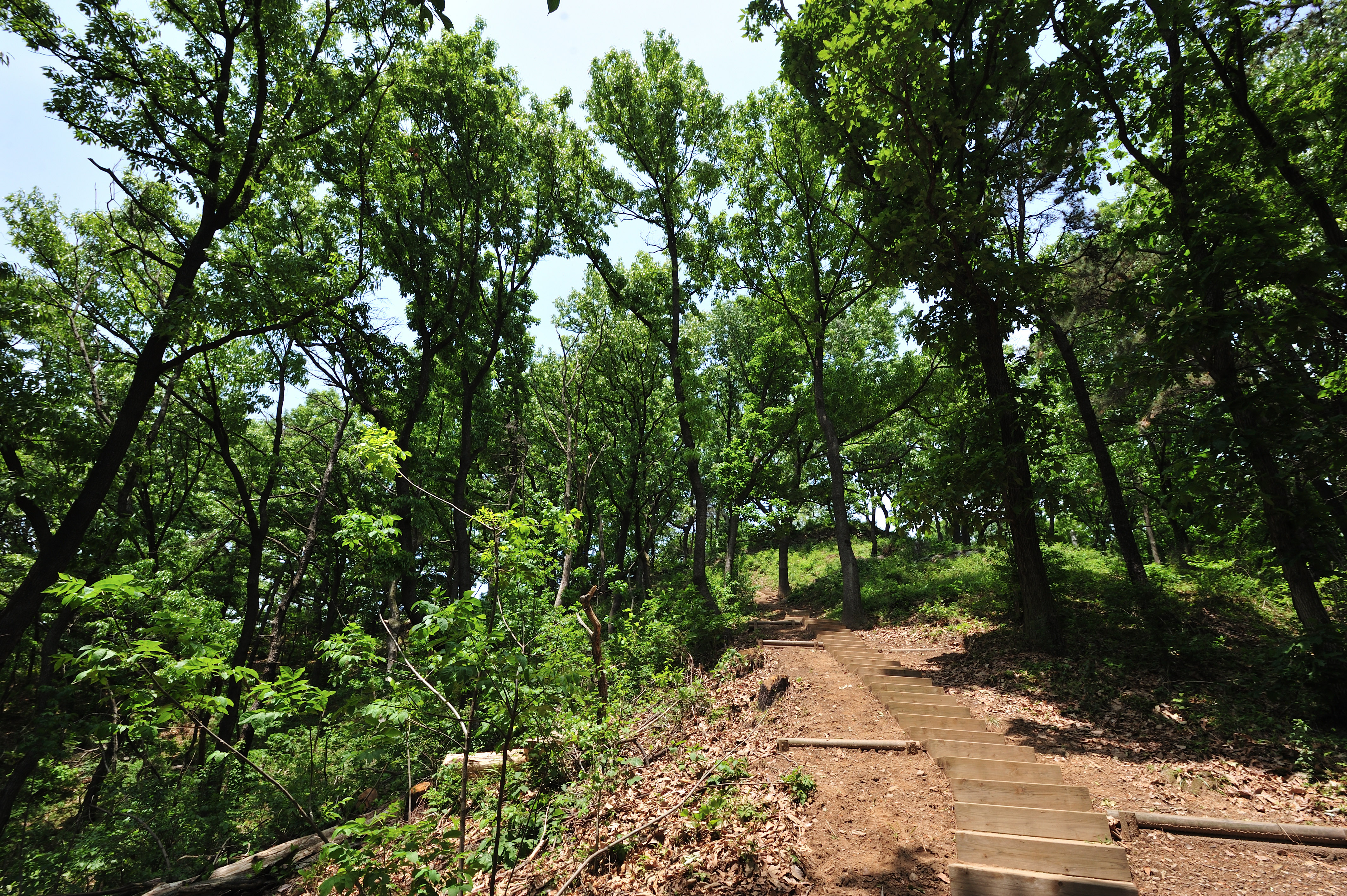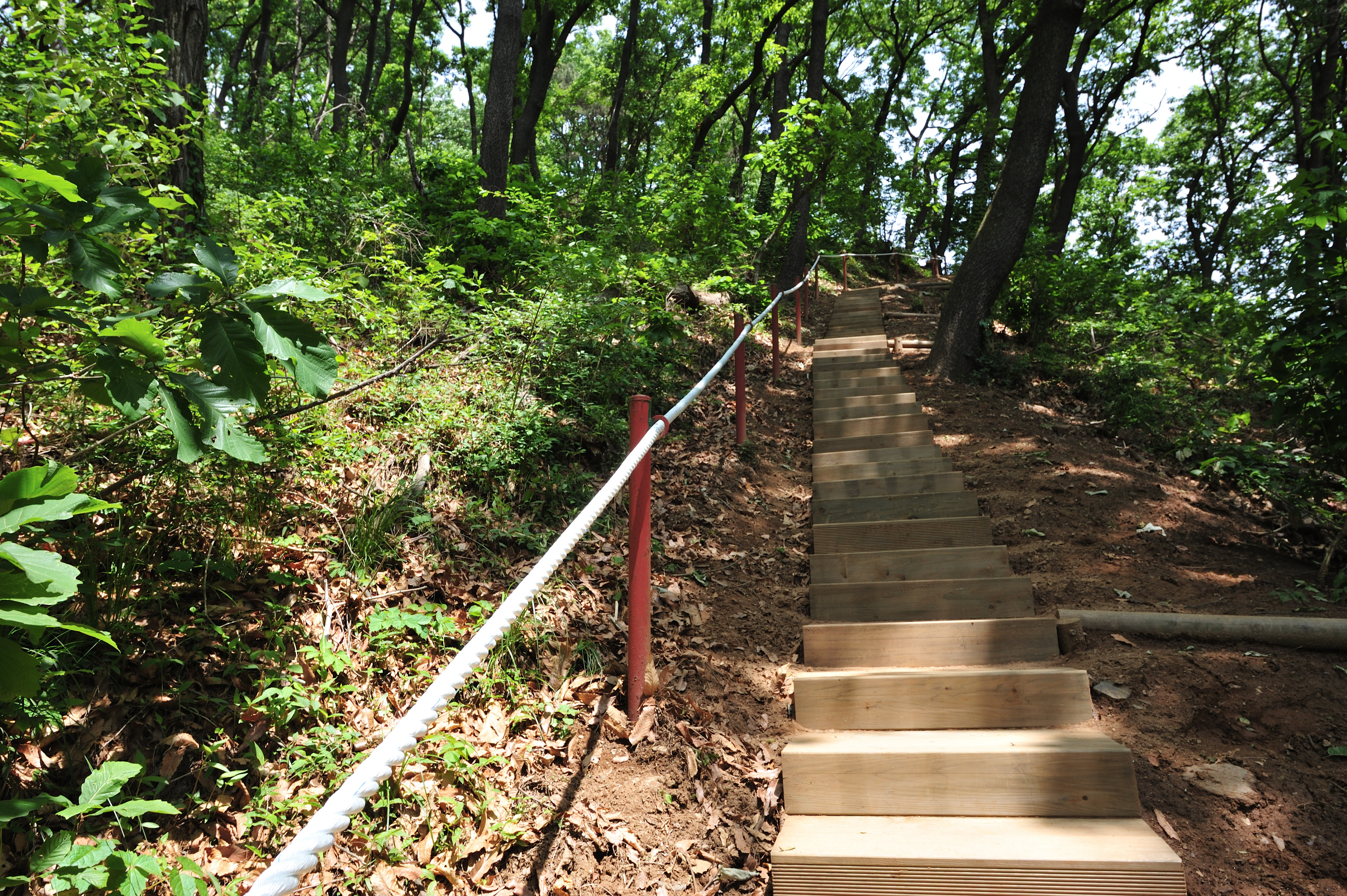 임도를 거쳐 산길을 한참 걸어 노성산 정상부분 삼거리 갈래길에서 오른쪽 나무계단으로 올랐다.