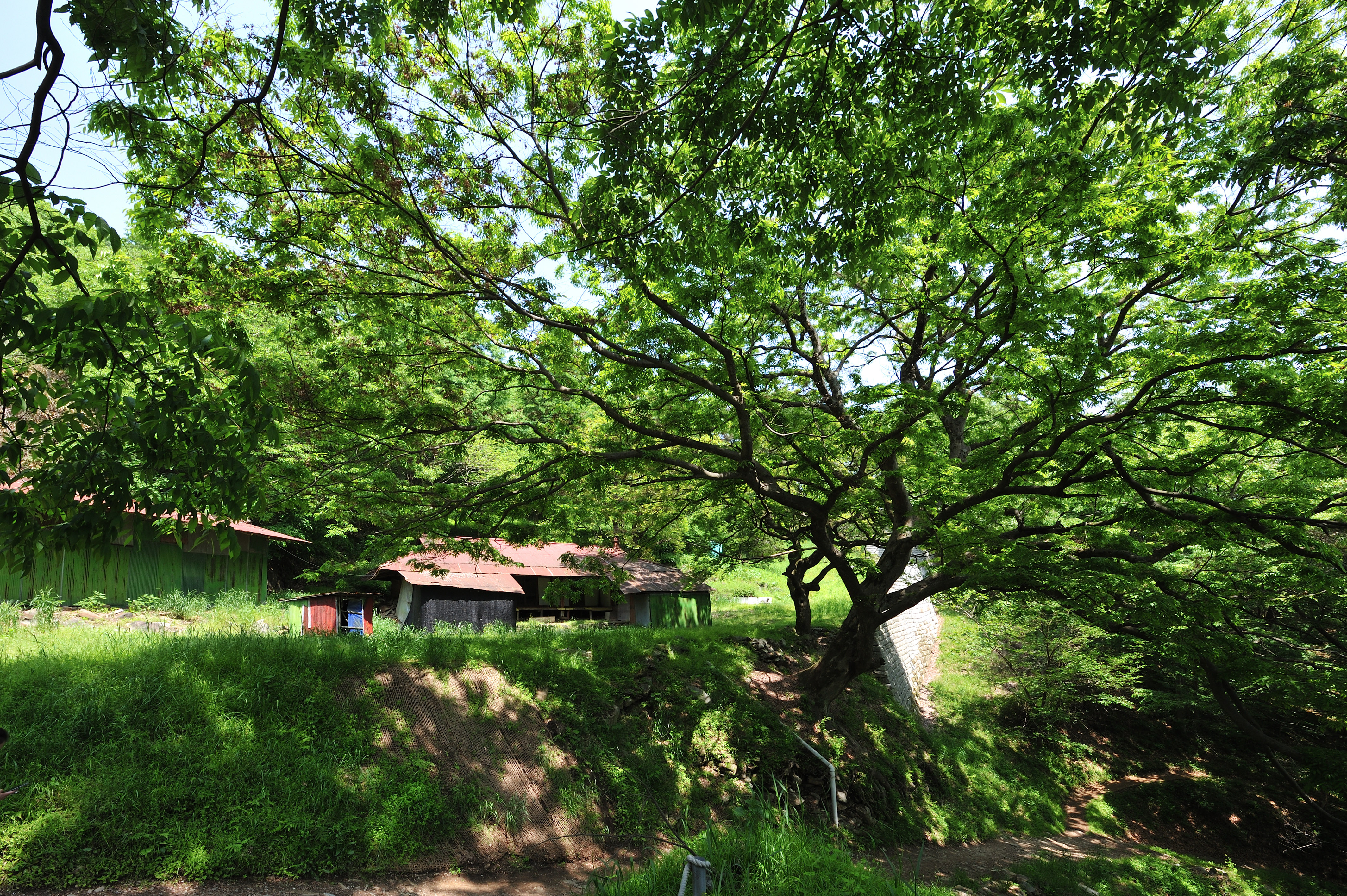 도량에서 왼쪽길로 내려오니, 옛 폐가 앞에 느티나무가 성벽 한가운데 자리 잡고 있었다.
