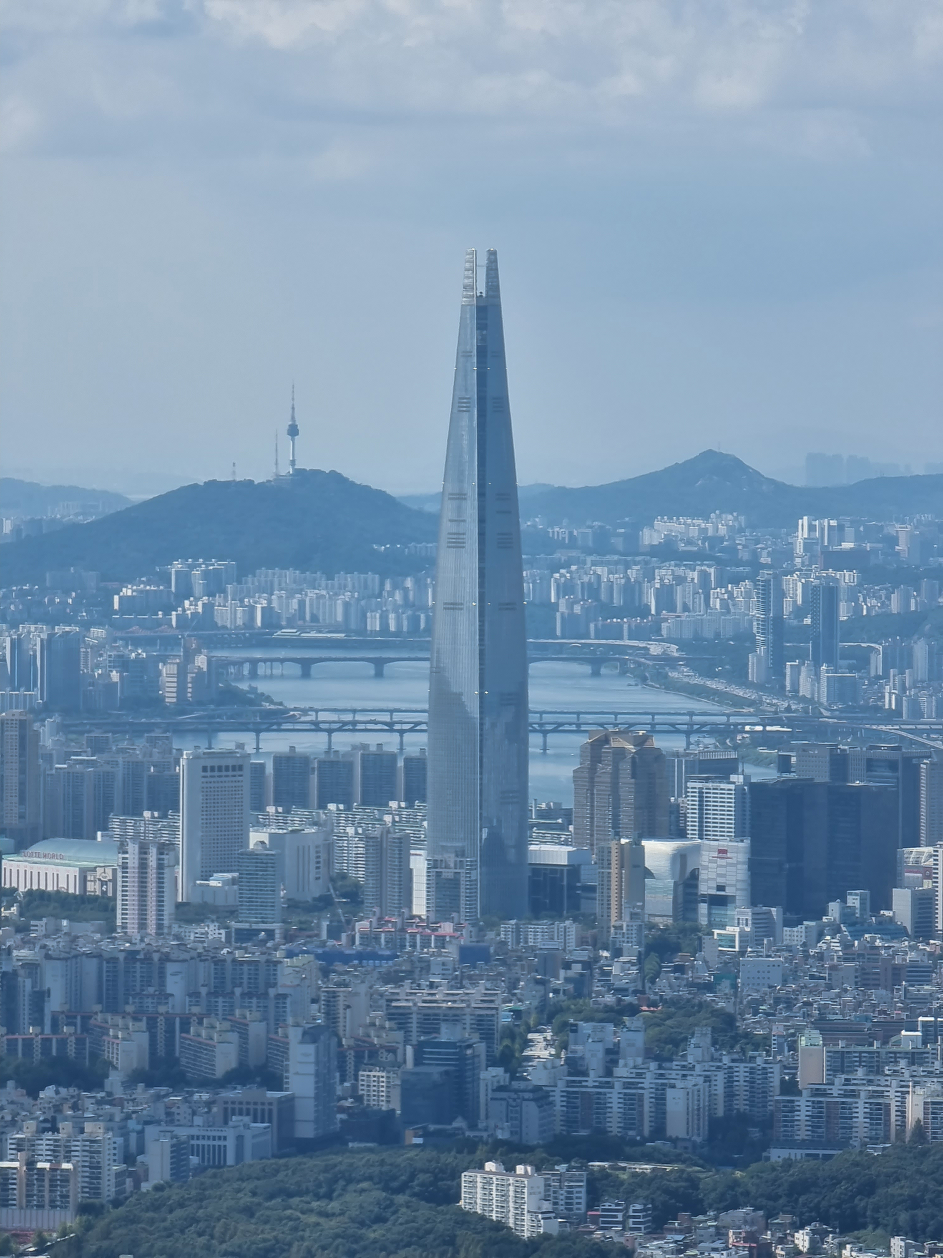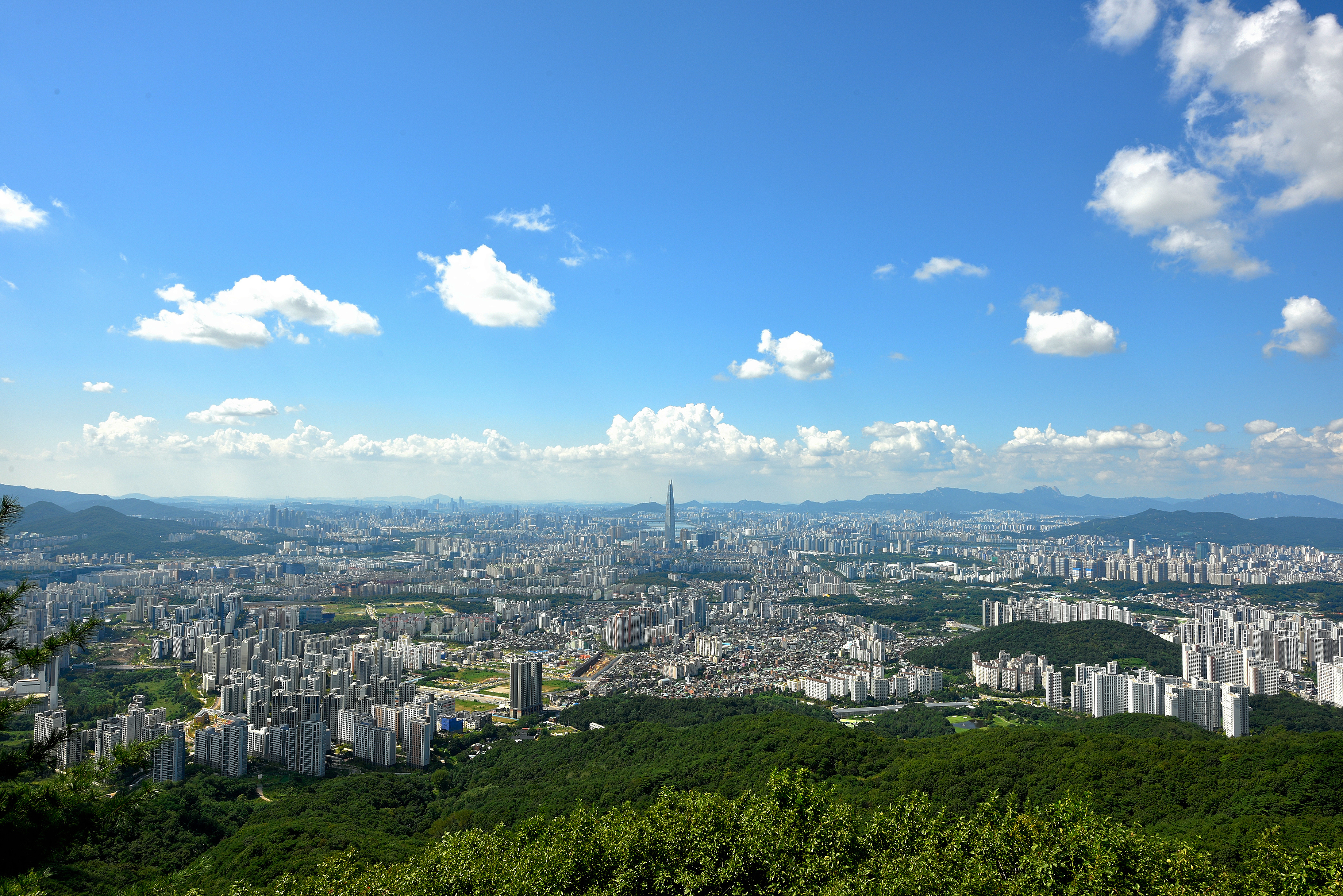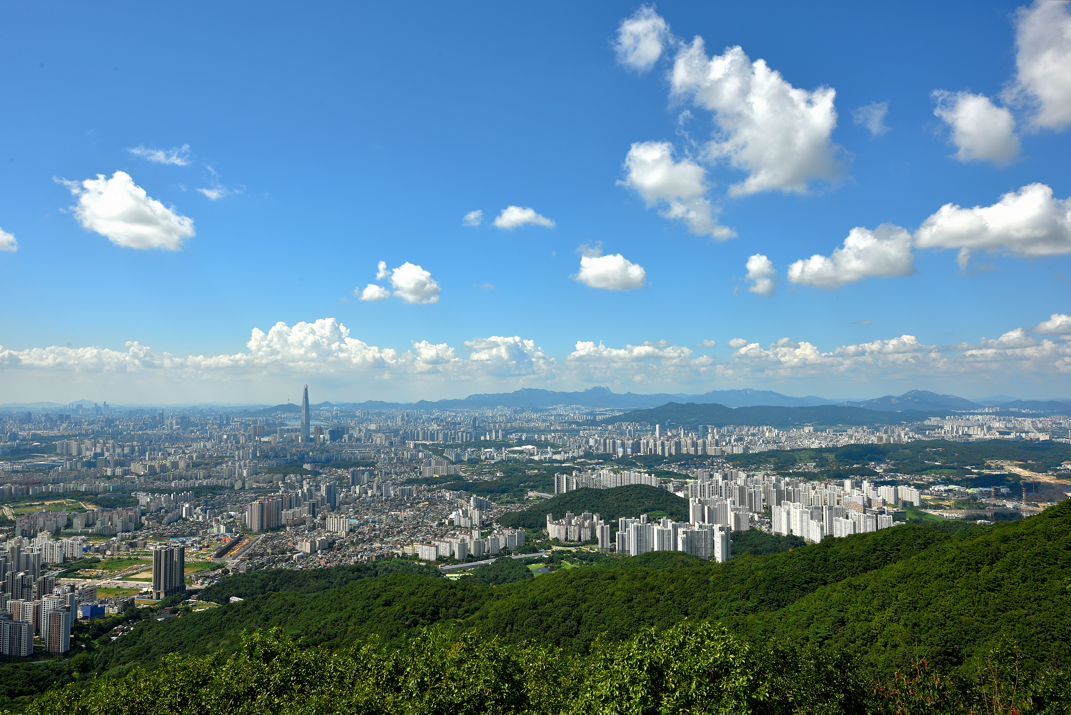 서문 부근에서 성벽너머로 바라보는 한양 도성, 멀리 서울 타워와 삼각산이 조망되었다.