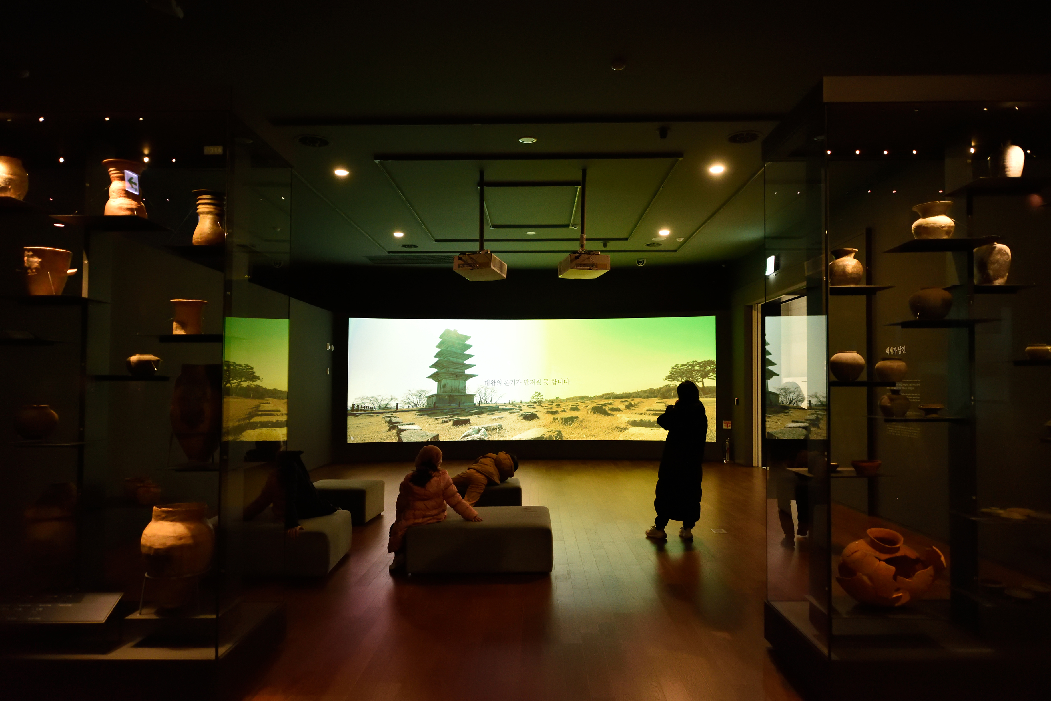 박물관 로비, 가로로 기다란 화면에 영상으로 보여주는 이미지들이 아름다웠다. (석탑의 뒷방향에서 보는 이미지, 오른쪽이 복원된 서탑. 서탑은 뒤에서 봐야 탑의 추녀를 볼 수 있다.)