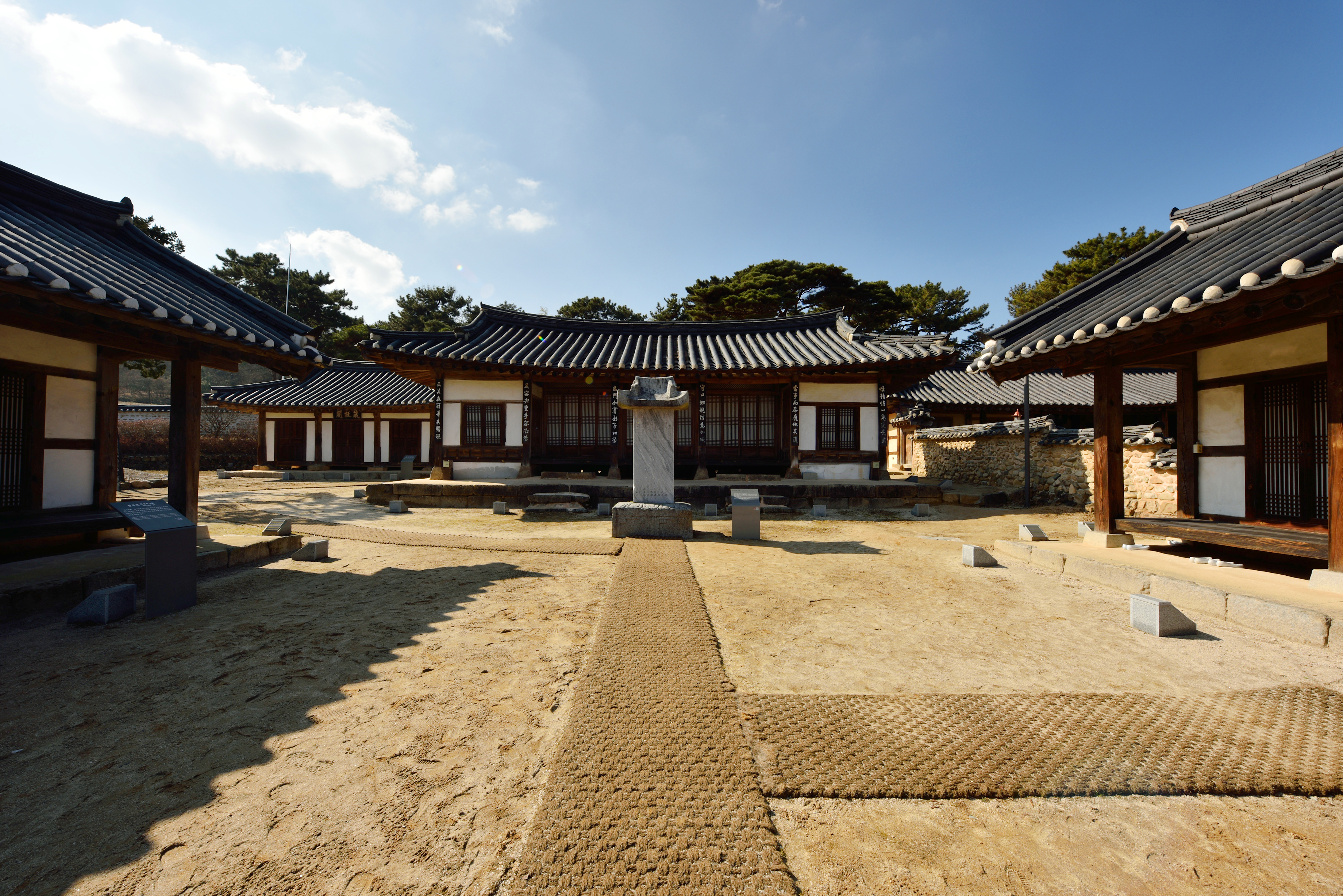 왼쪽의 장판각과 가운데 양성당, 장판각 뒤로 김장생, 김집, 송준길, 송시열의 위패를 모시고 제향하는 숭례사가 있다.