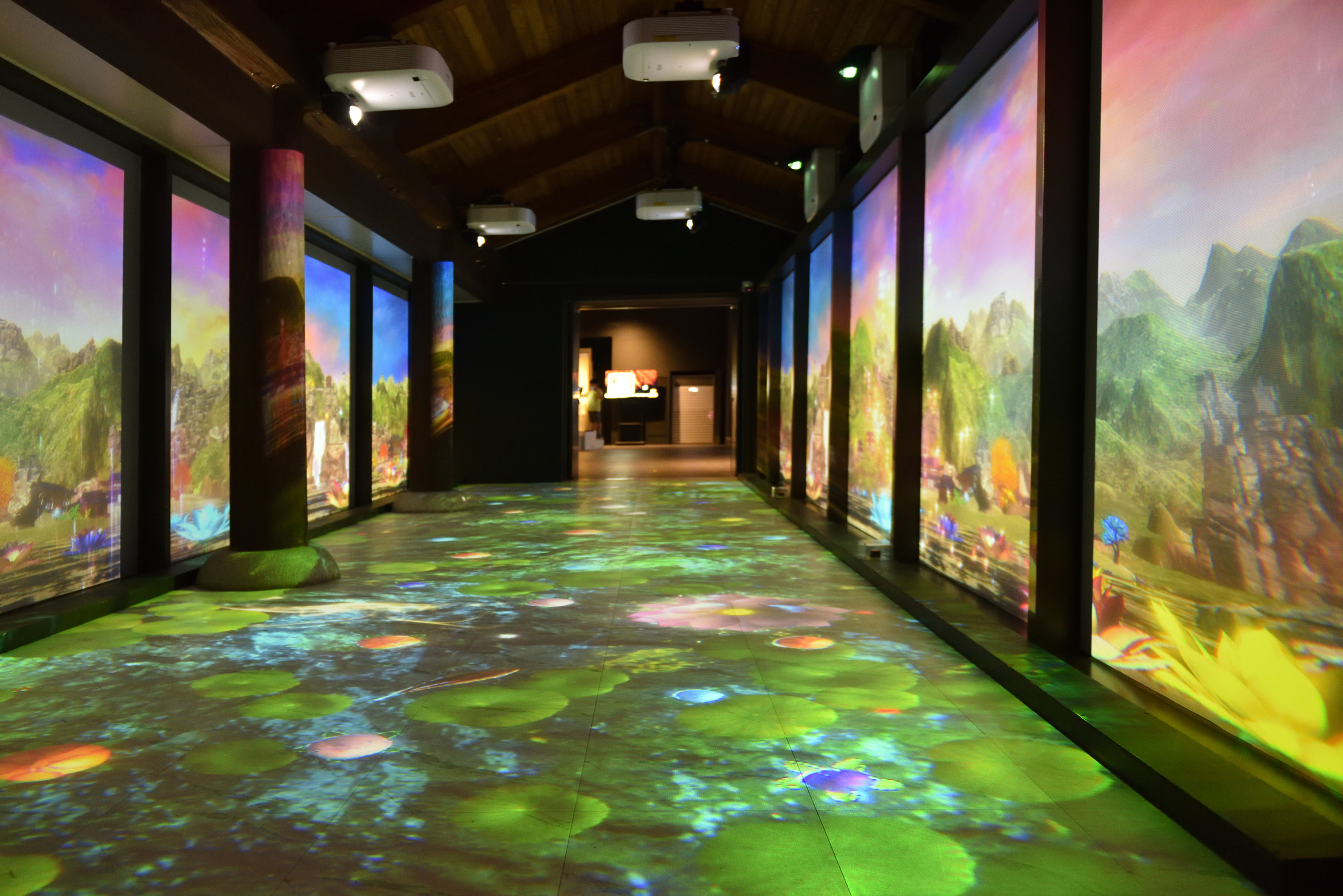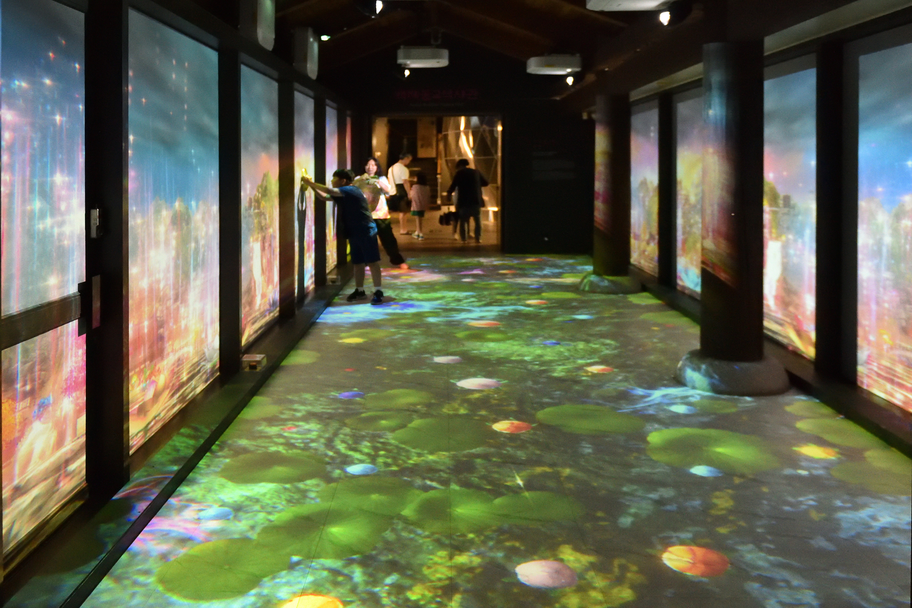 복도를 비추는 영상, 연꽃 위를 밟으며 환상적인 복도를 지나 360도 영상관으로 이동한다.
