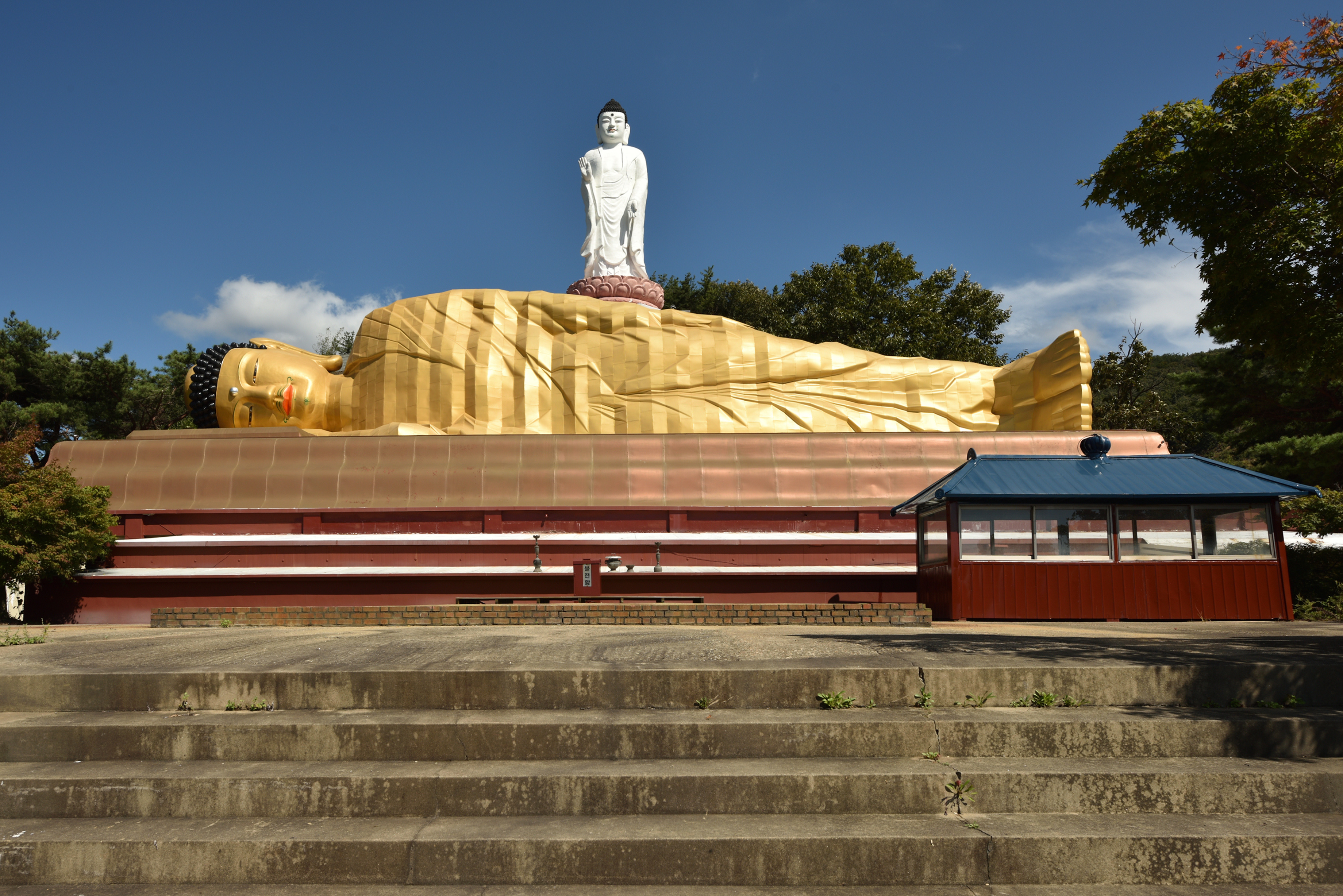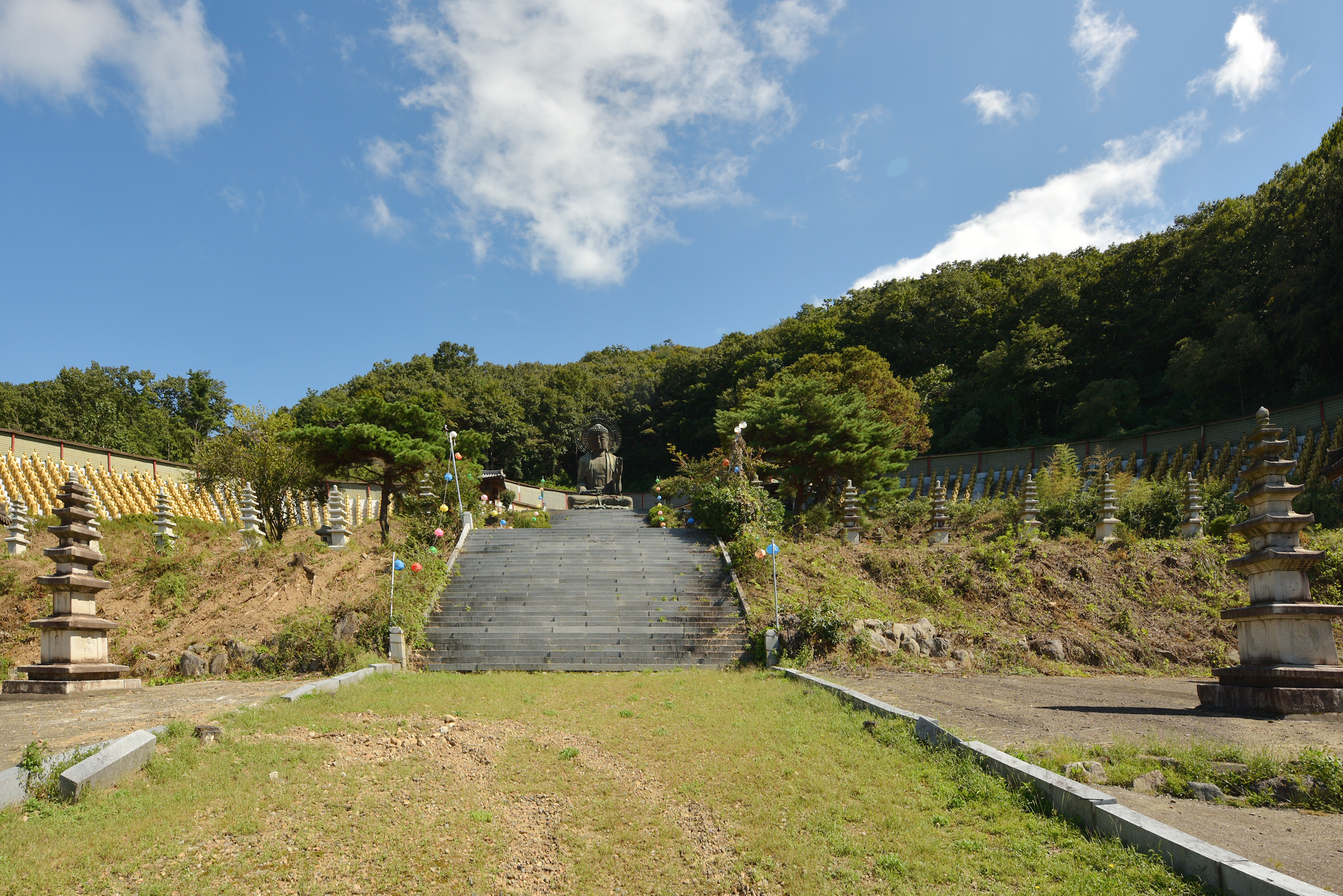 대웅전에서 뻗어 나온 오른편 끝 언덕에 석가님의 열반상인 청동와불을 모시고, 그 뒤 광장을 만들어 미래에 중생을 제도하실 미륵부처님 입상을 세웠다.