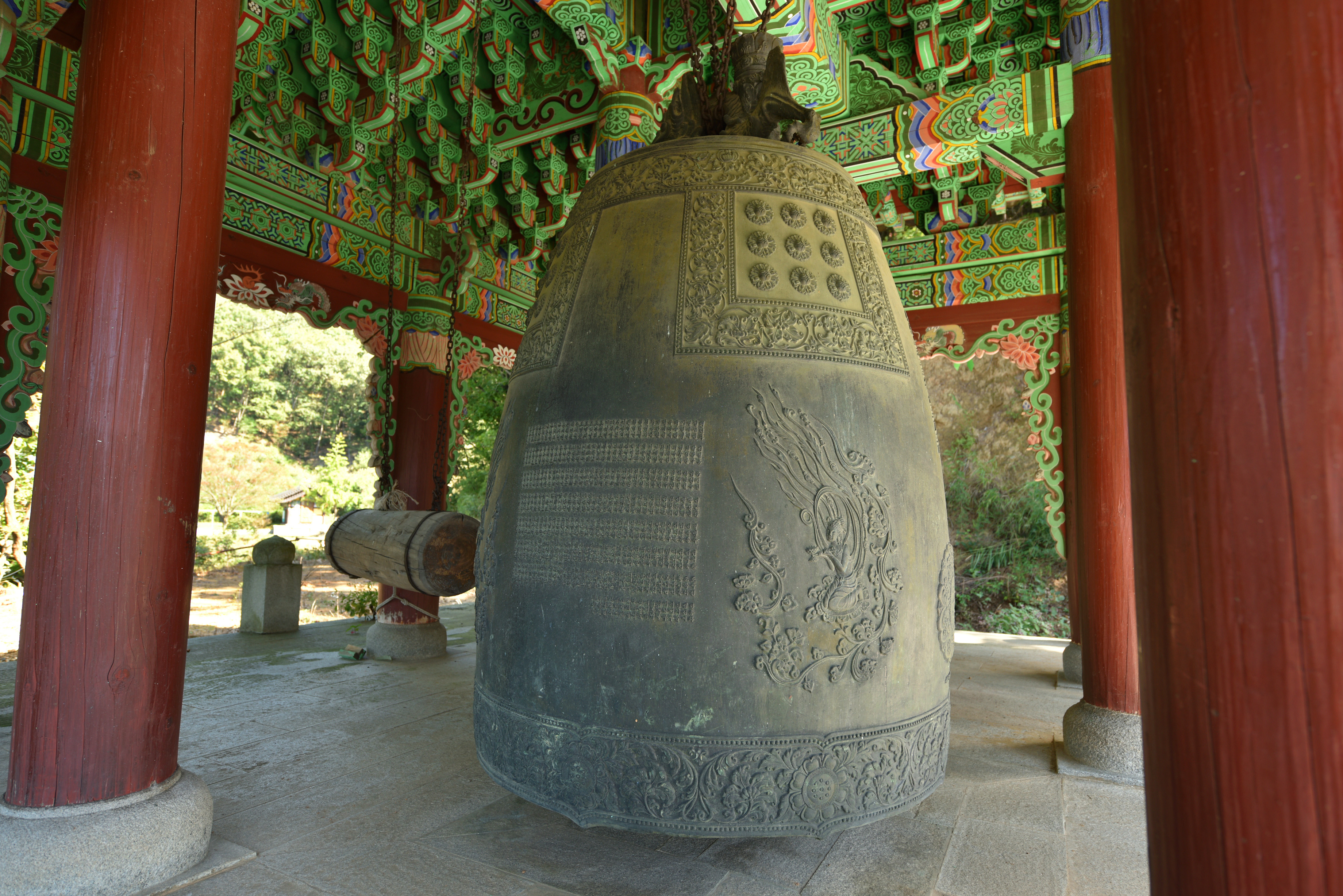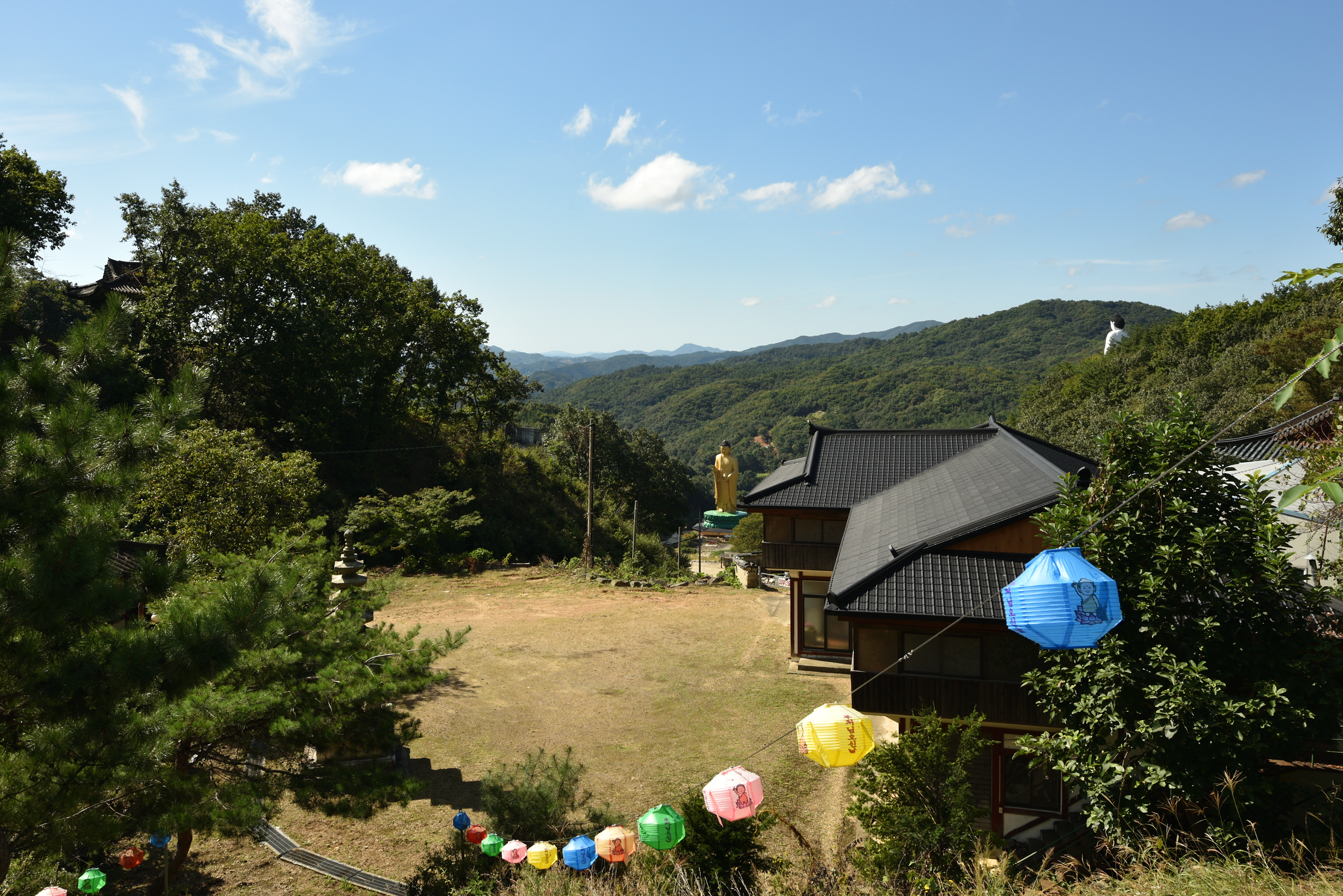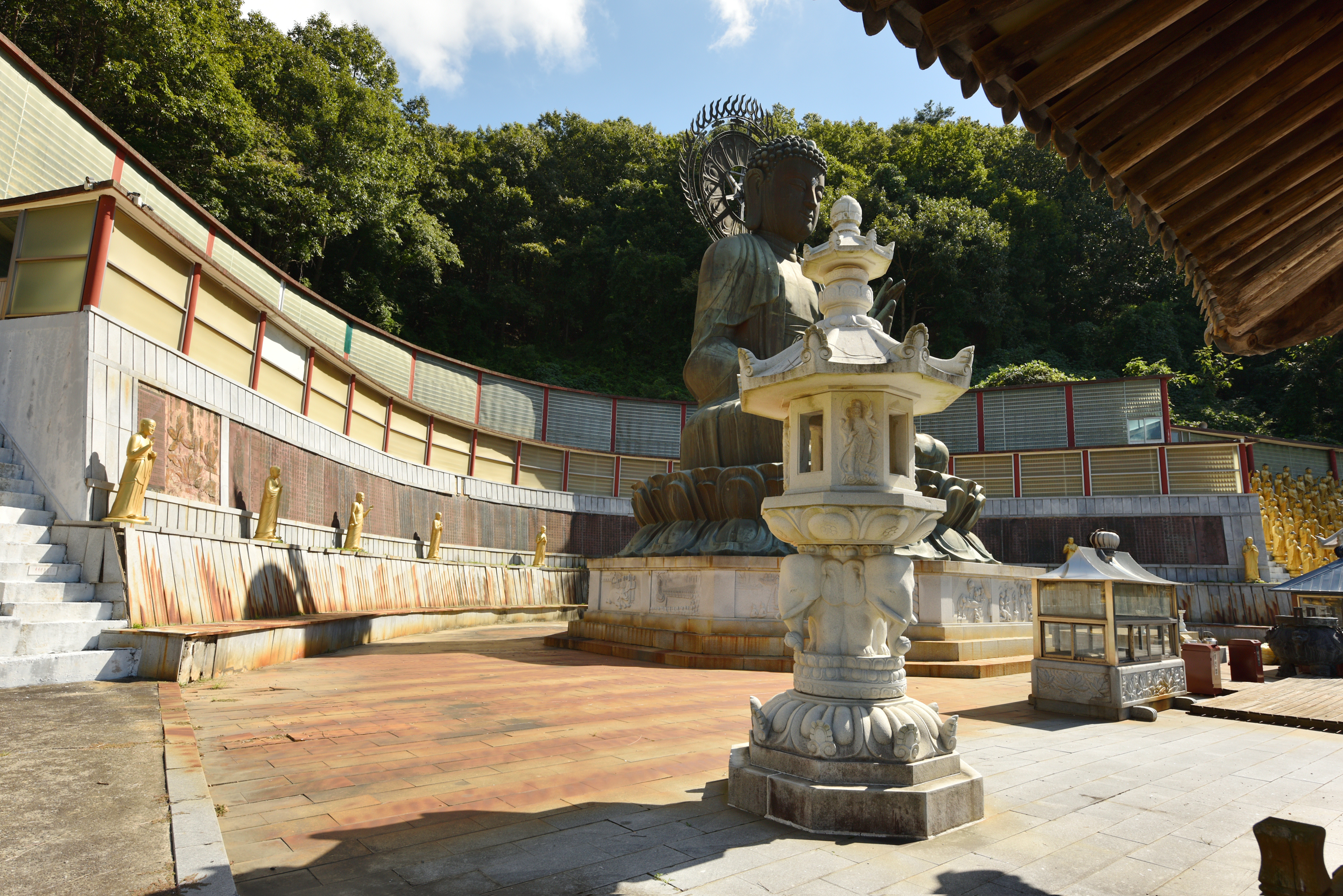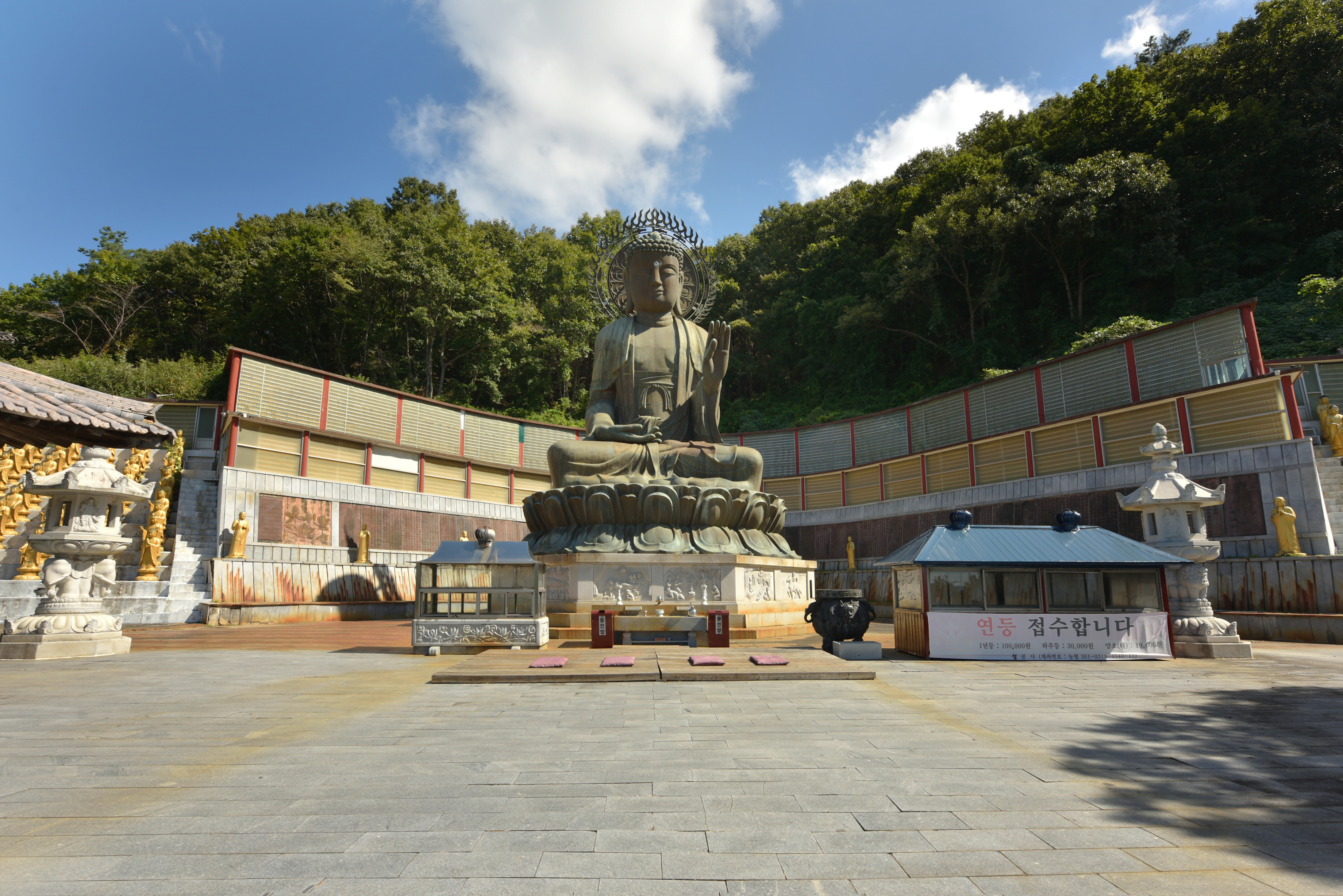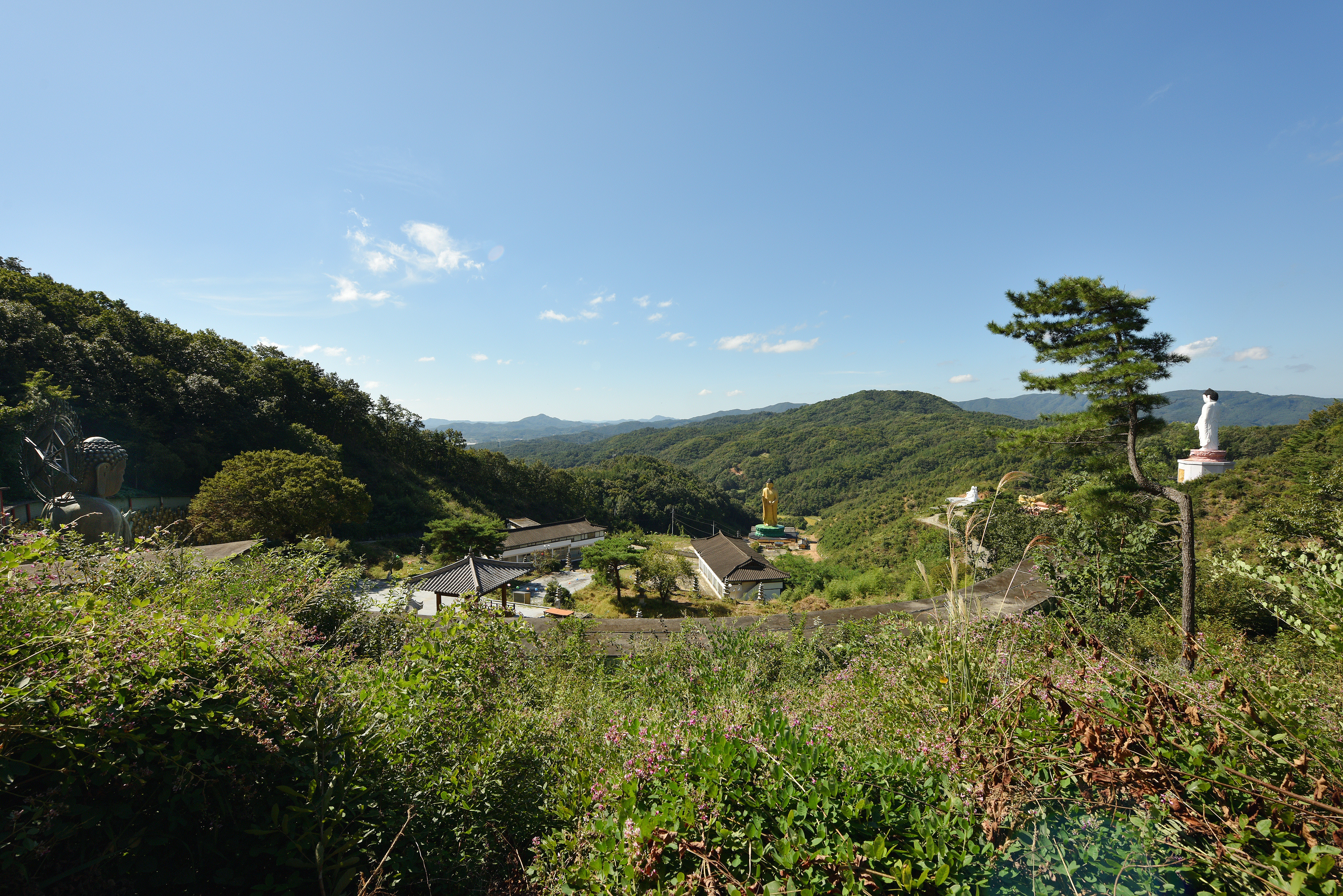 범종각 아래 풍경, 왼쪽으로는 거대한 청동좌불이, 가운데 아래로는 약사여래불, 오른쪽 언덕에는 미륵불이 우뚝 서있었다. 탁 트여 내려다 보이는 먼 산의 희미한 능선들이 산수화처럼 고왔다.