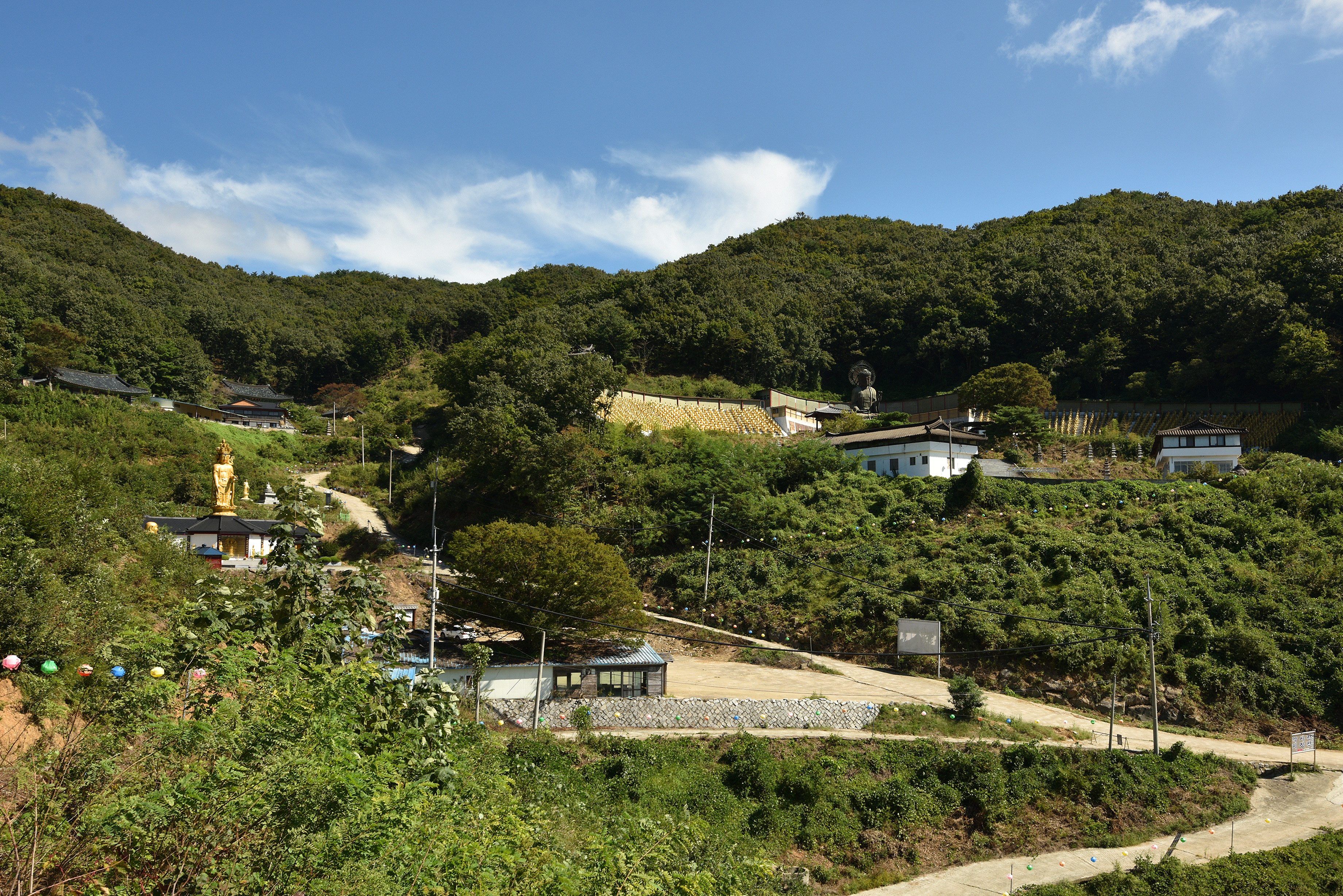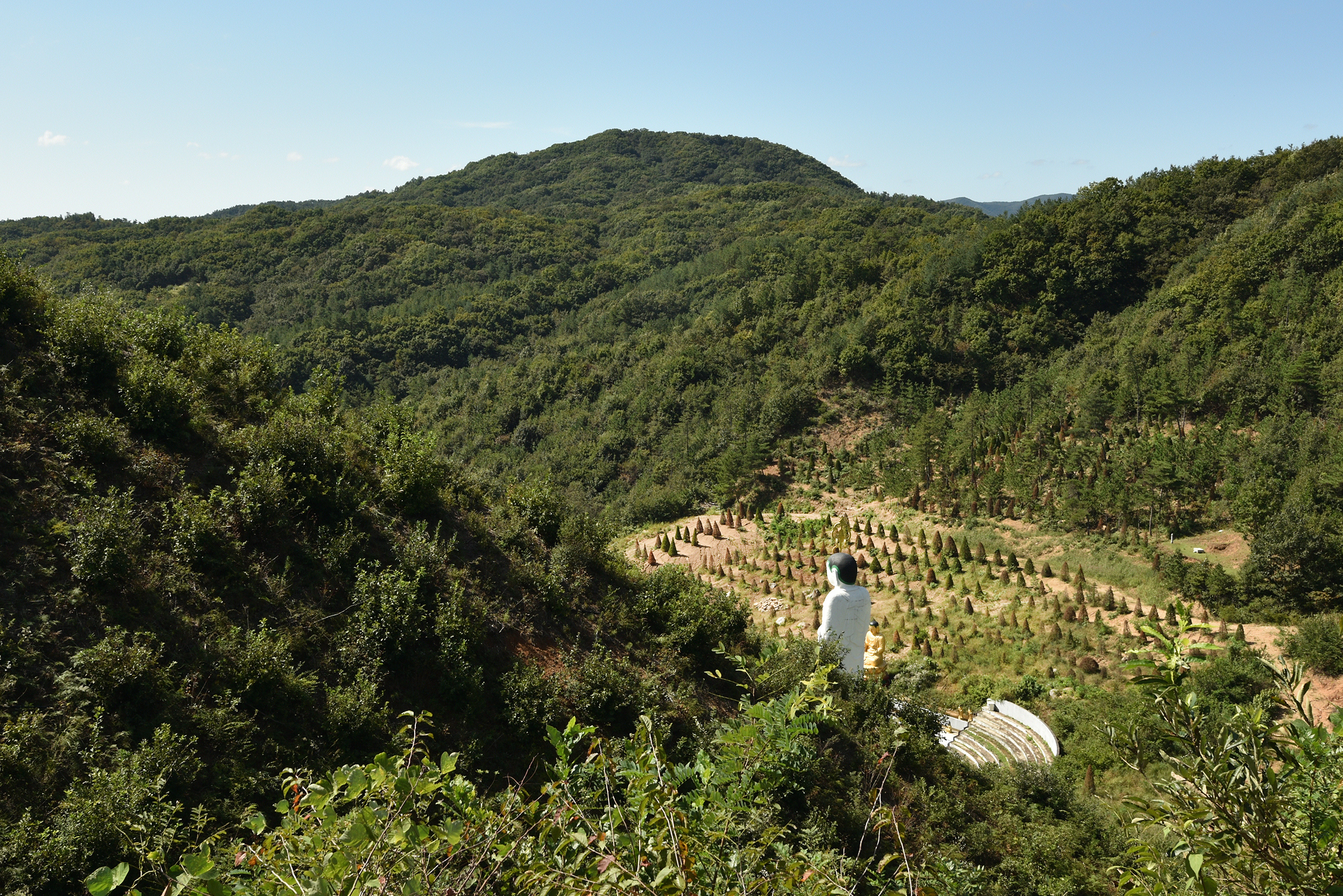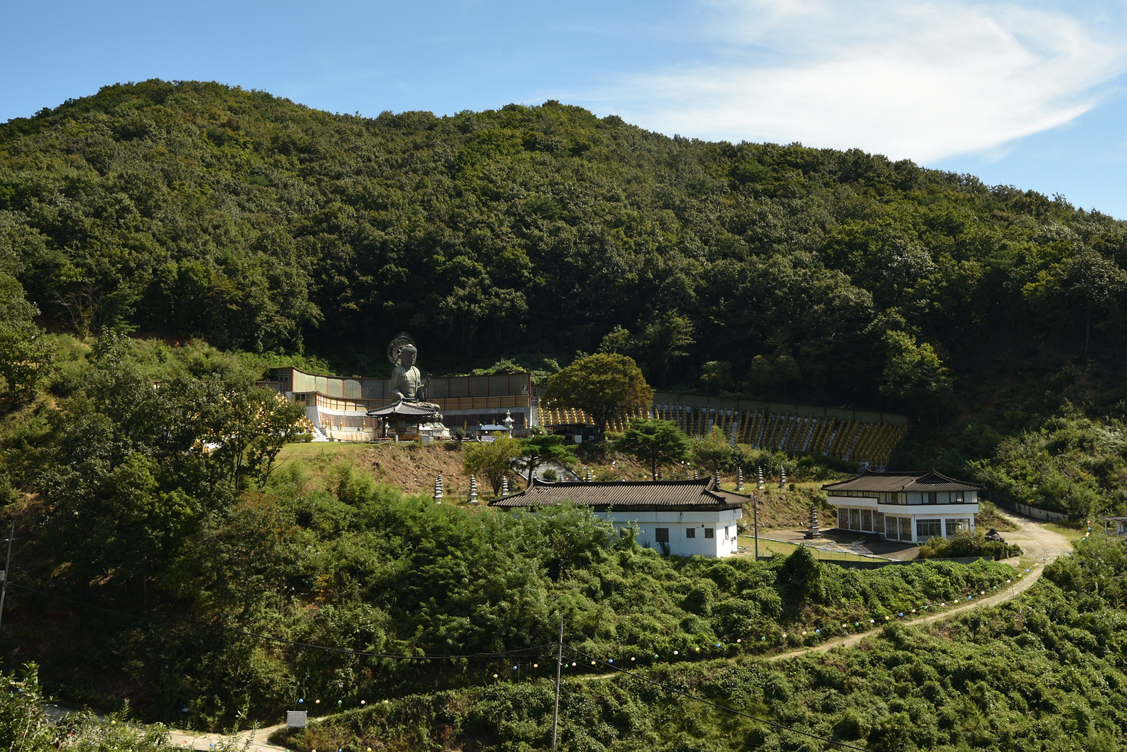 미륵불 언덕에서 내려오는 비탈에서 보는 관음전과 대웅전, 천불전... 광활하고 아름다운 산속에, 불사를 너무 크게 일으킨 듯, 엄청난 재력을 쏟아부었을 텐데, 과유불급이랄까, 제대로 관리되지 않고 피폐화 되어가는 모습이 안스럽다.