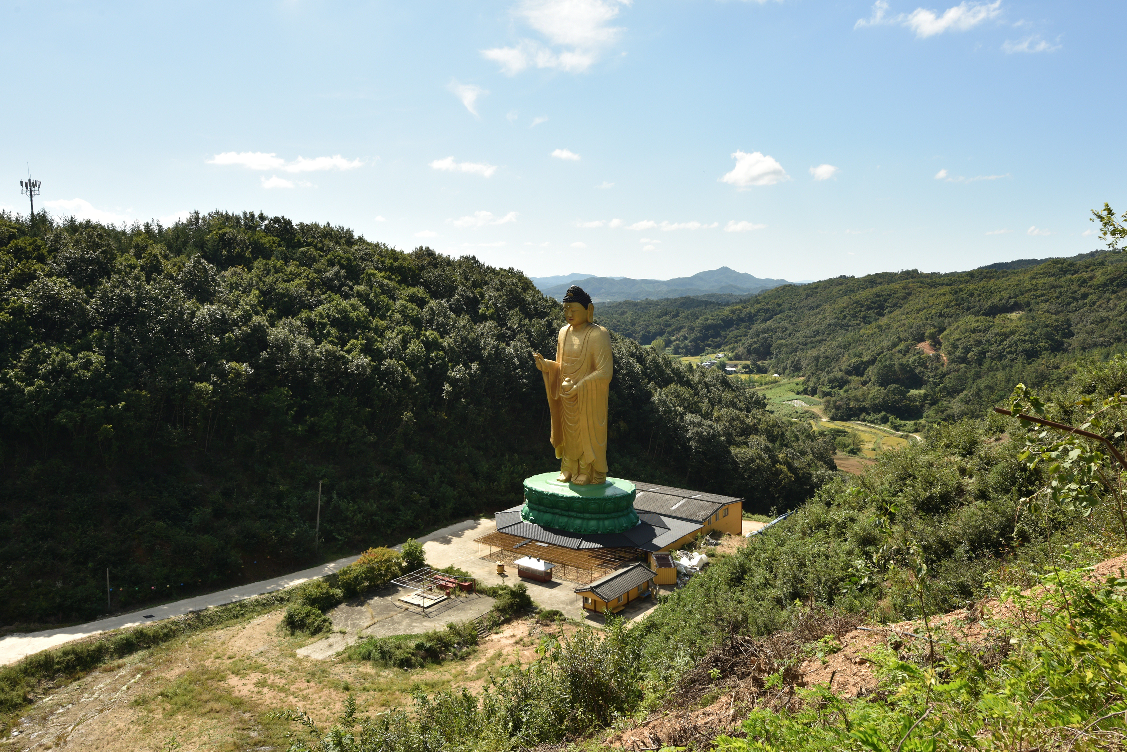 가운데 골짜기 중앙에 서있는 약사전과 거대한 황금색의 약사여래불