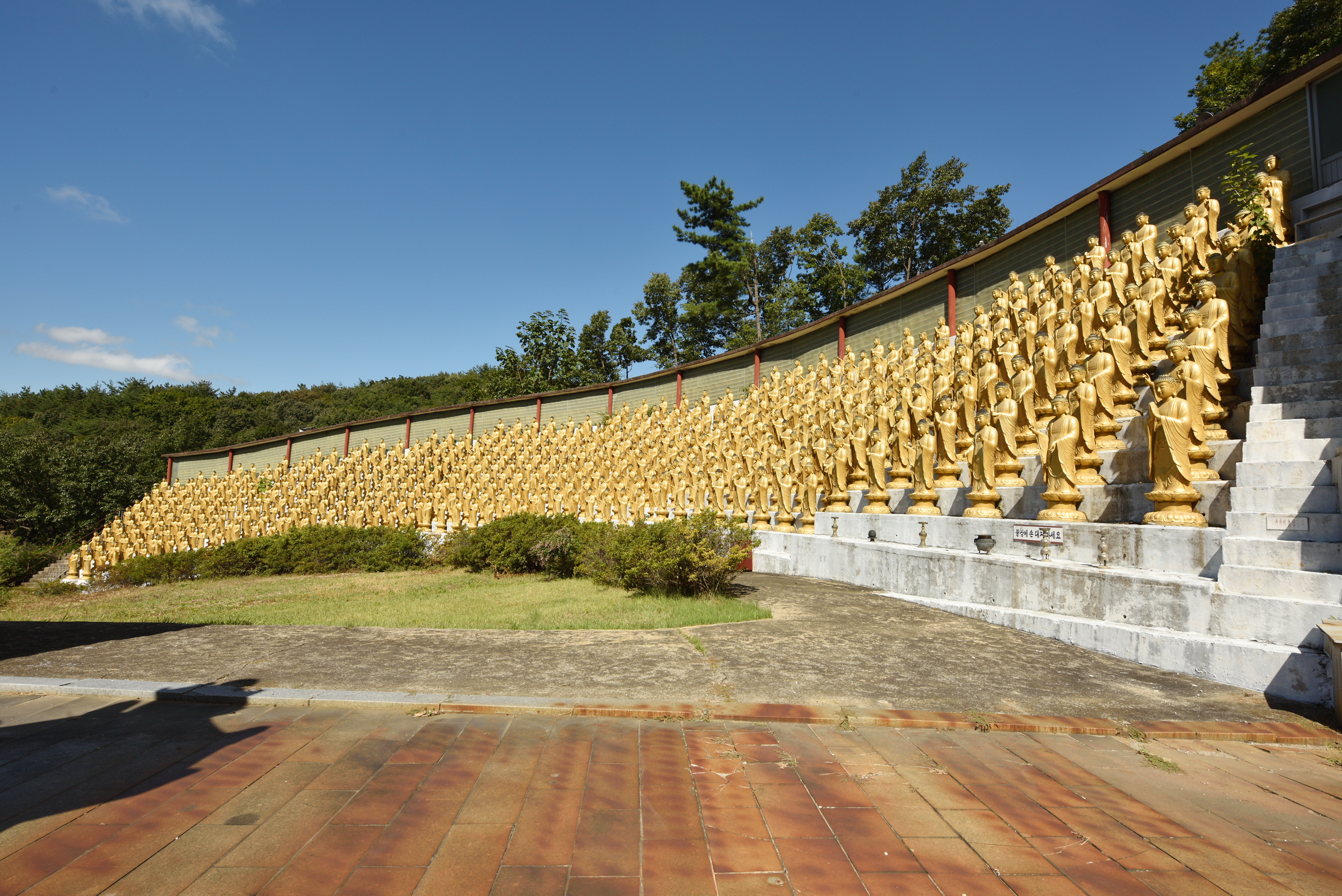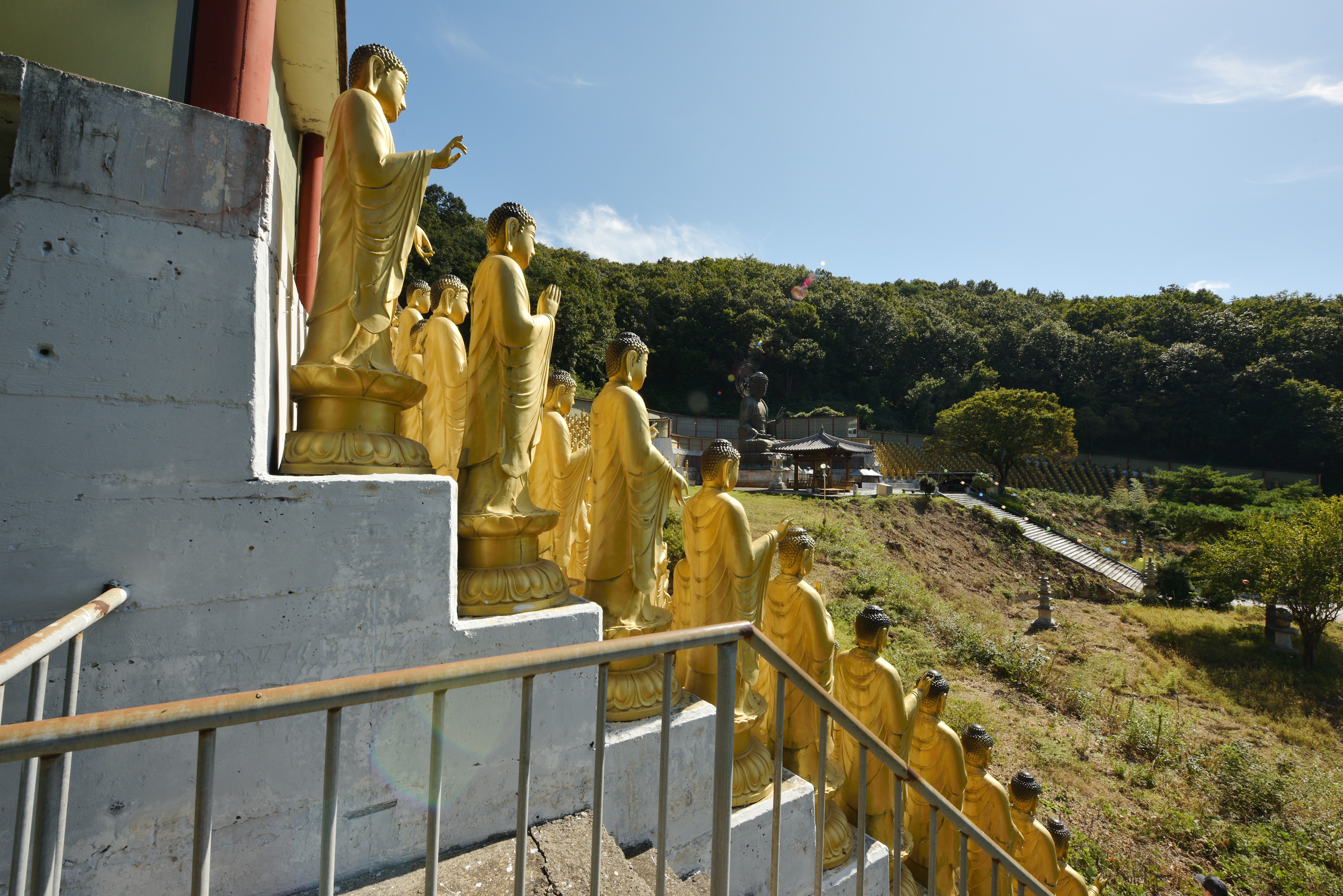 범종각에서 오른쪽으로 망가진 산길을 조심조심 내려가자, 대웅전 왼편 골짜기에 천불전이 있다. 청동좌불 좌우로 황금색 500 부처씩 세워, 이른바 1000불을 모신 곳이었다. 한 분의 부처 입상이 사람 크기보다 컸다. 이런 부처상을 천불이나 모셨다니 대단한 불사였다.