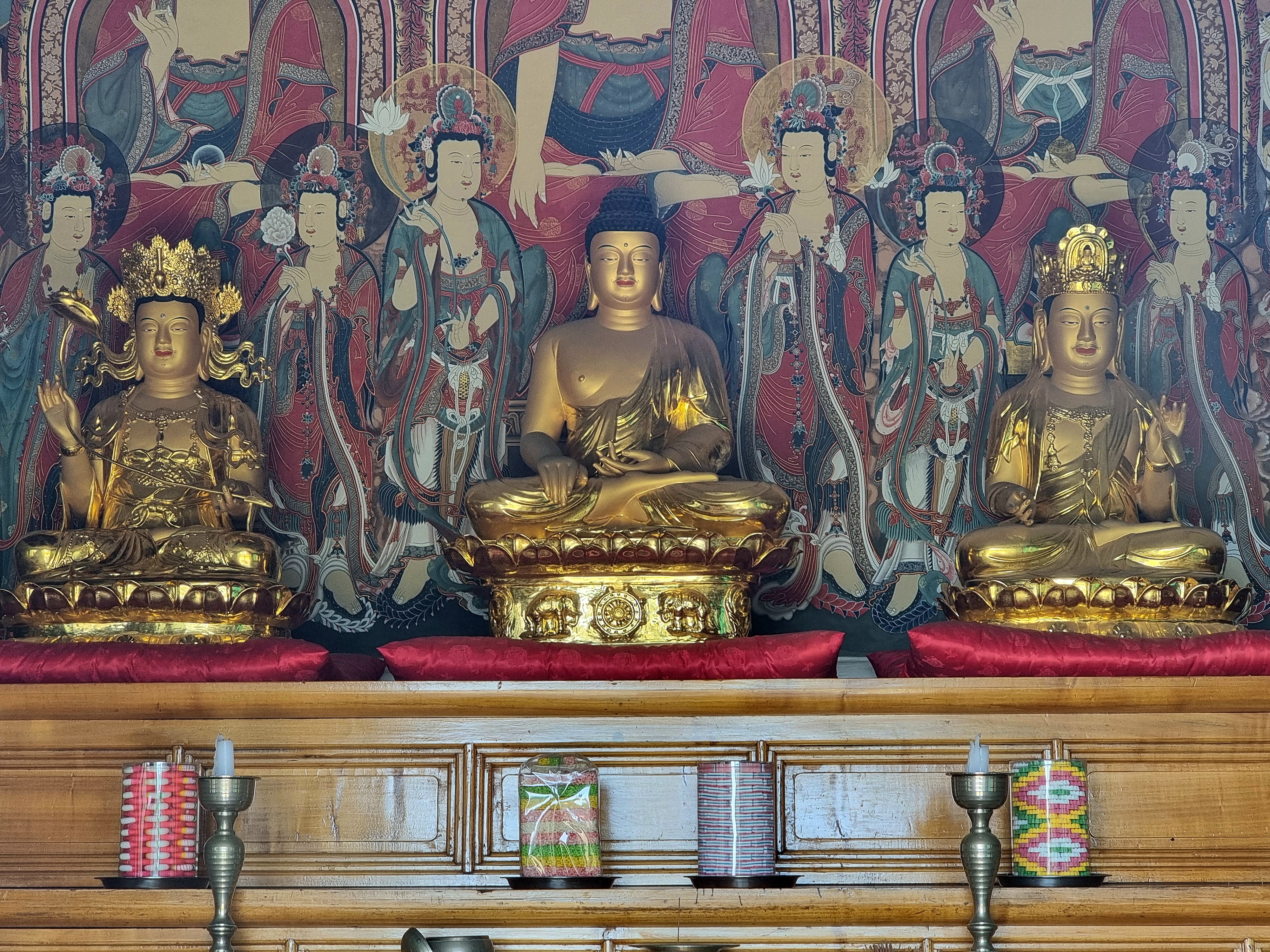 굳게 잠긴 대웅전 문앞에서 유리창에 렌즈를 대고 한 컷 찍었다. 부처남들이 단아하고 아름다우셨다.