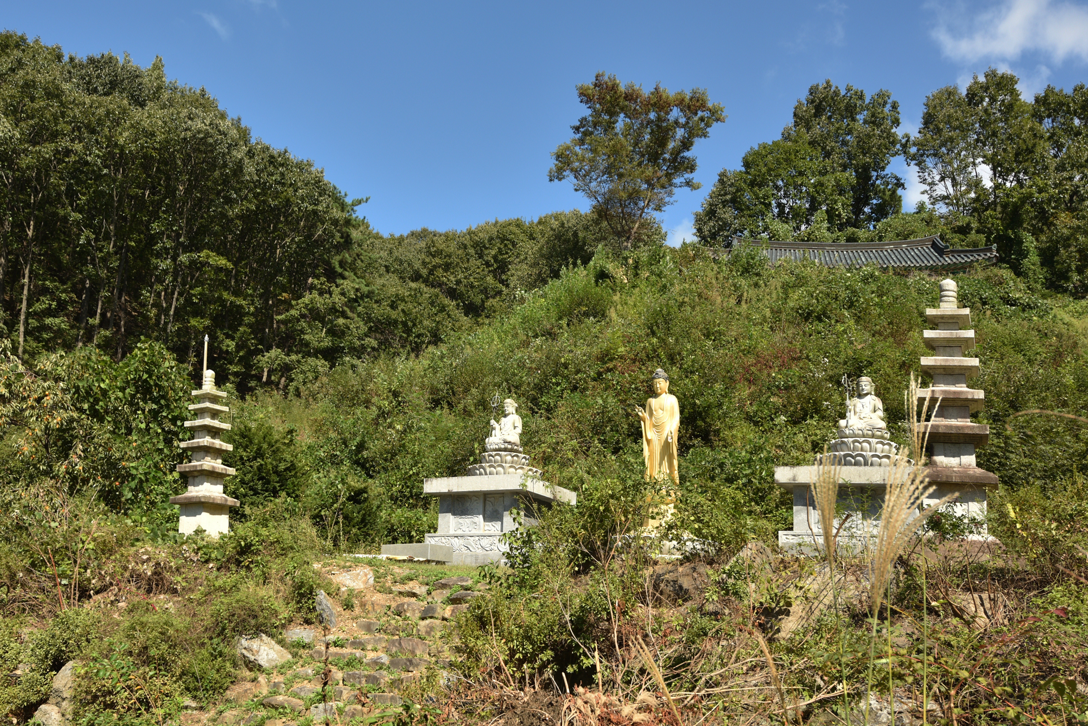 관음전 위, 잡초 속에 불탑과 여러 부처님들