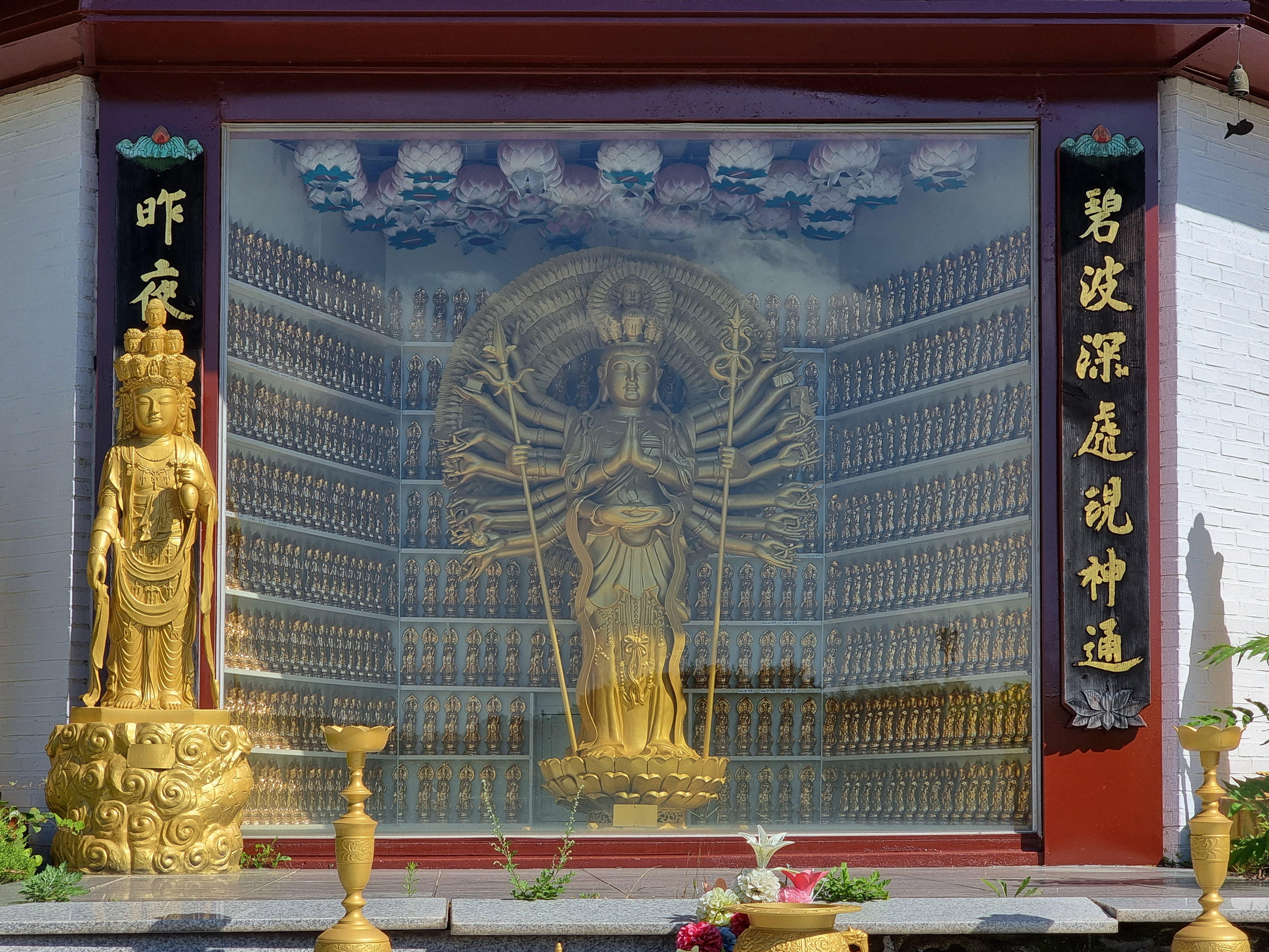 십일면관음상 아래 건물 중앙에 천수관음보살이 유리창 안에 모셔져 있고, 그 좌우로 여러 관음보살들이 입시하고 있었다.
