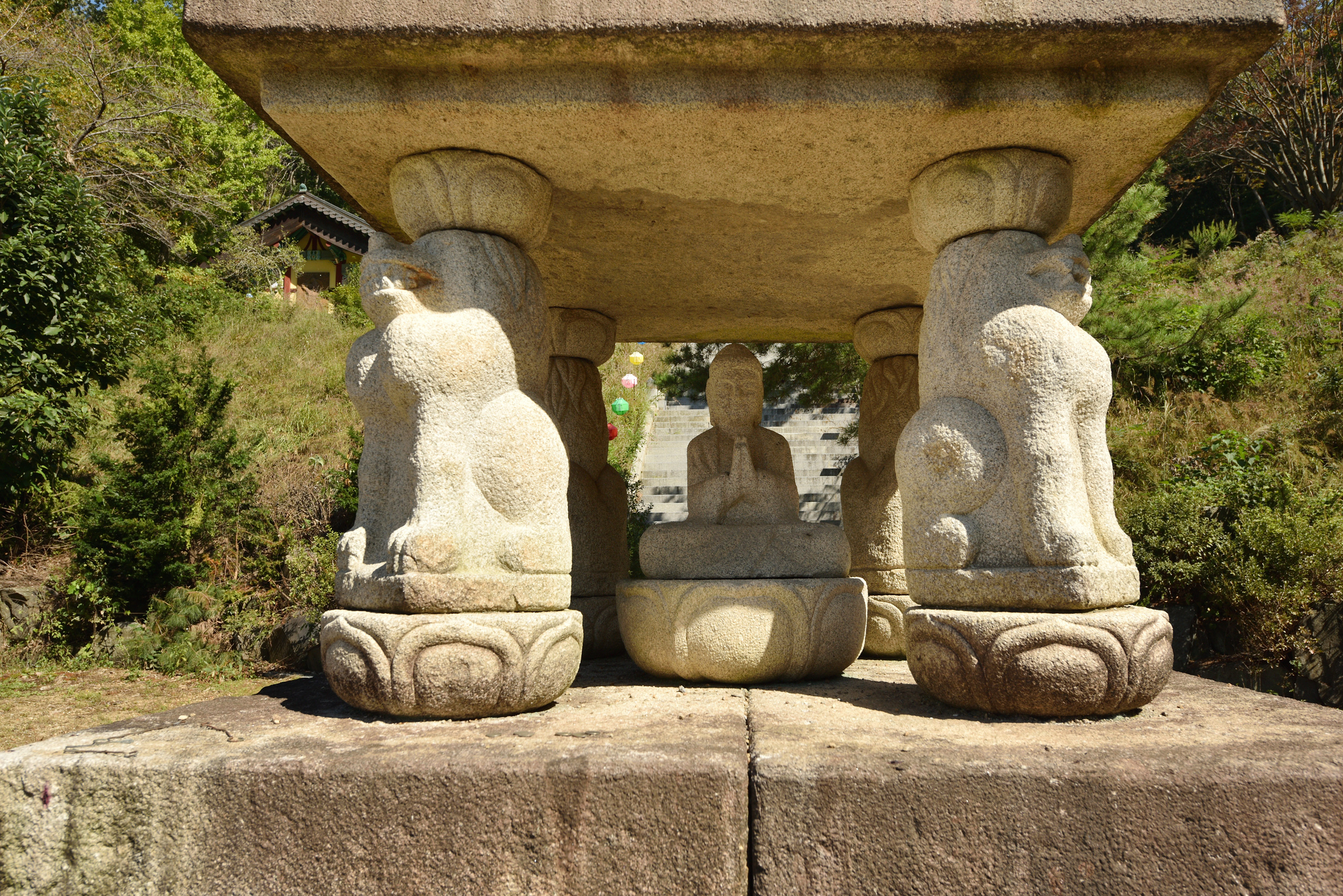 화엄사 사사자 삼층탑을 모방한 사사자오층석탑 뒤 계단 위에 대웅전이 보였다. 석탑 좌우의 국적불명의 건물들을 빼고 석탑 뒤편의 대웅전과 명부전 영산전과 종각만으로도 명당 자리에 소박하고 예쁜 사찰로 손색이 없겠다.