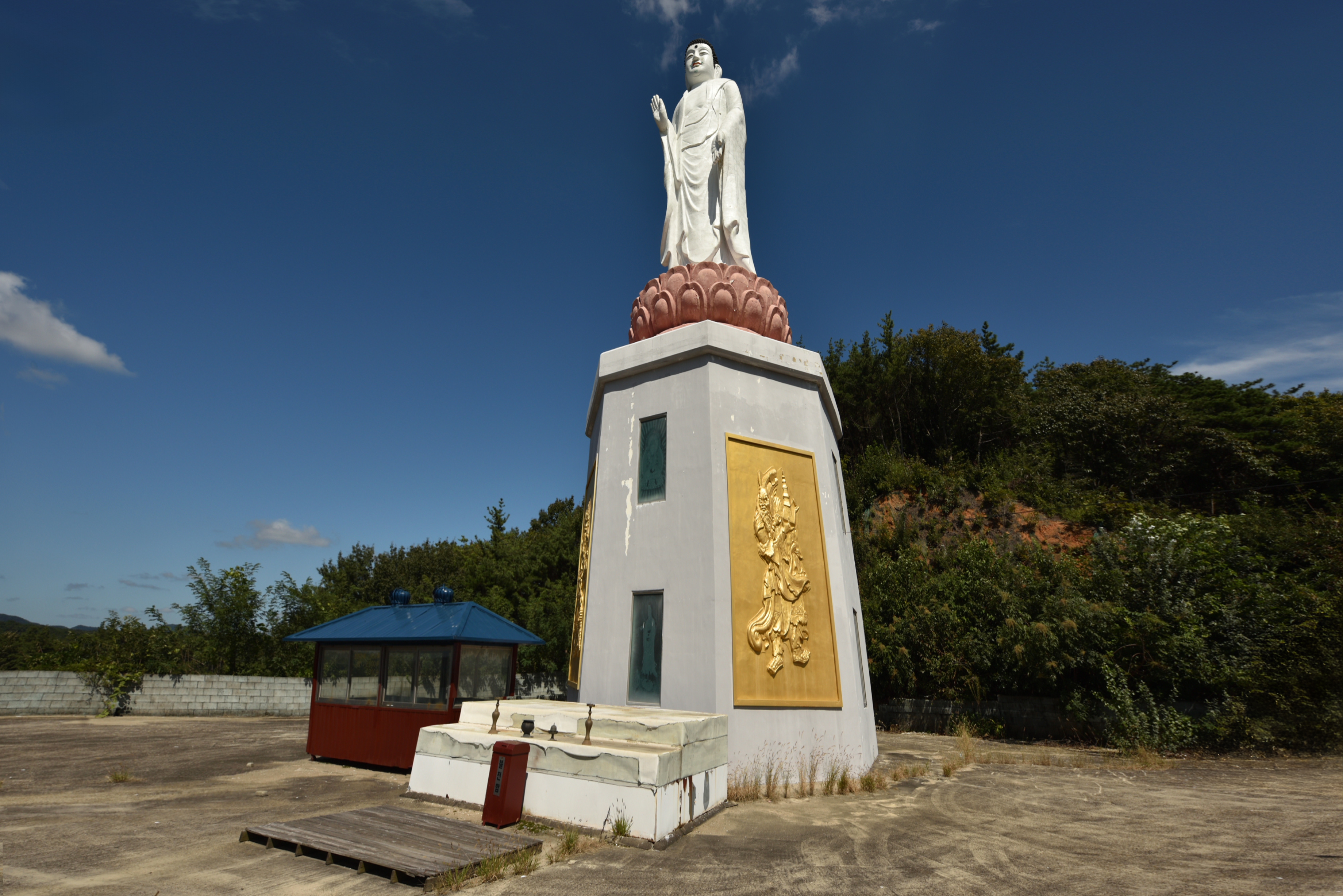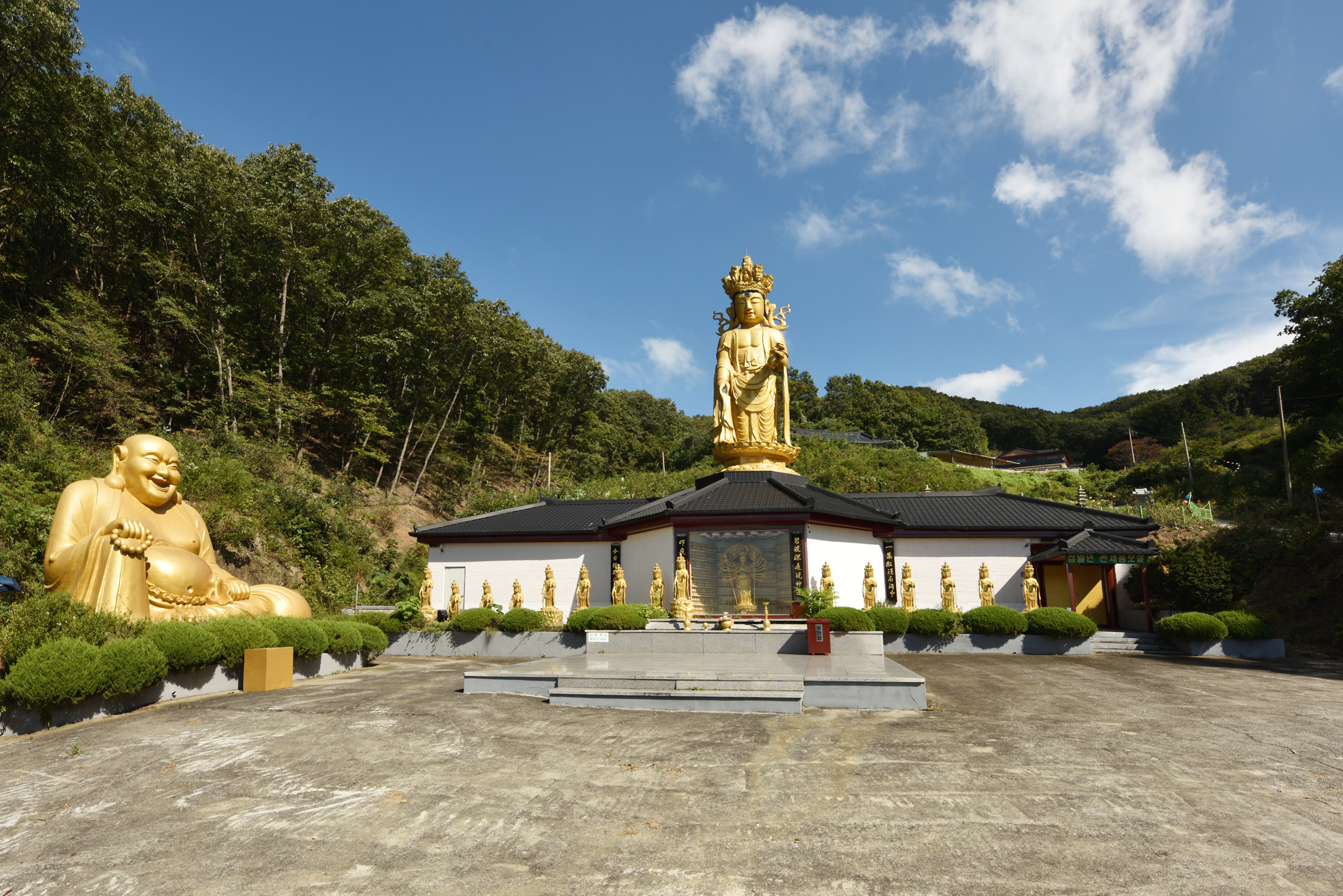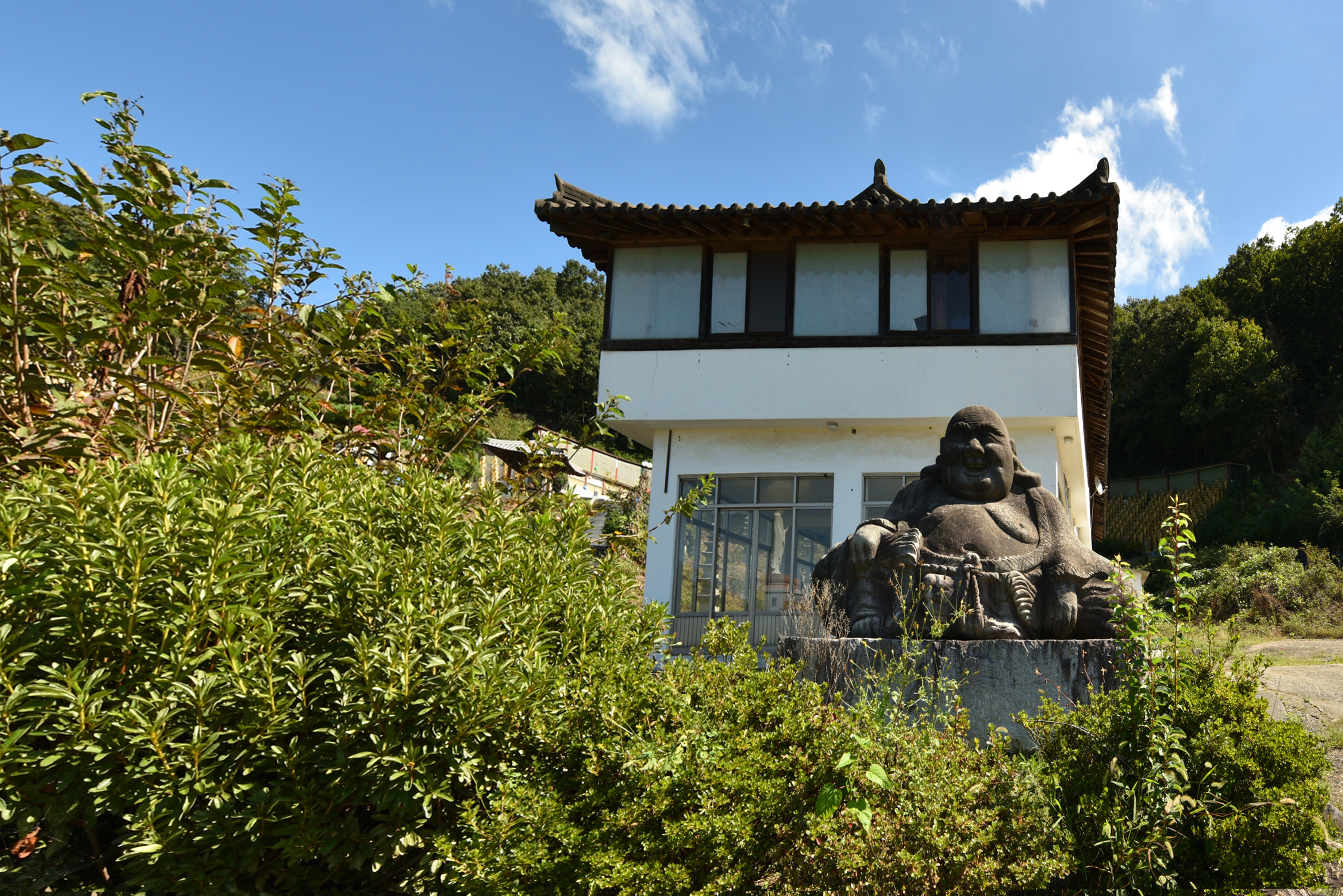 주차장 위의 관음전, 국적을 알 수 없는 건물 위에 황금색 십일면관음보살이 우뚝 서 있다. 측면에 역시 황금빛 포대화상이 넉살 좋게 웃고 있었고... 개인적으로 유행처럼 절마다 세우는 포대화상들에 거부감이 든다.