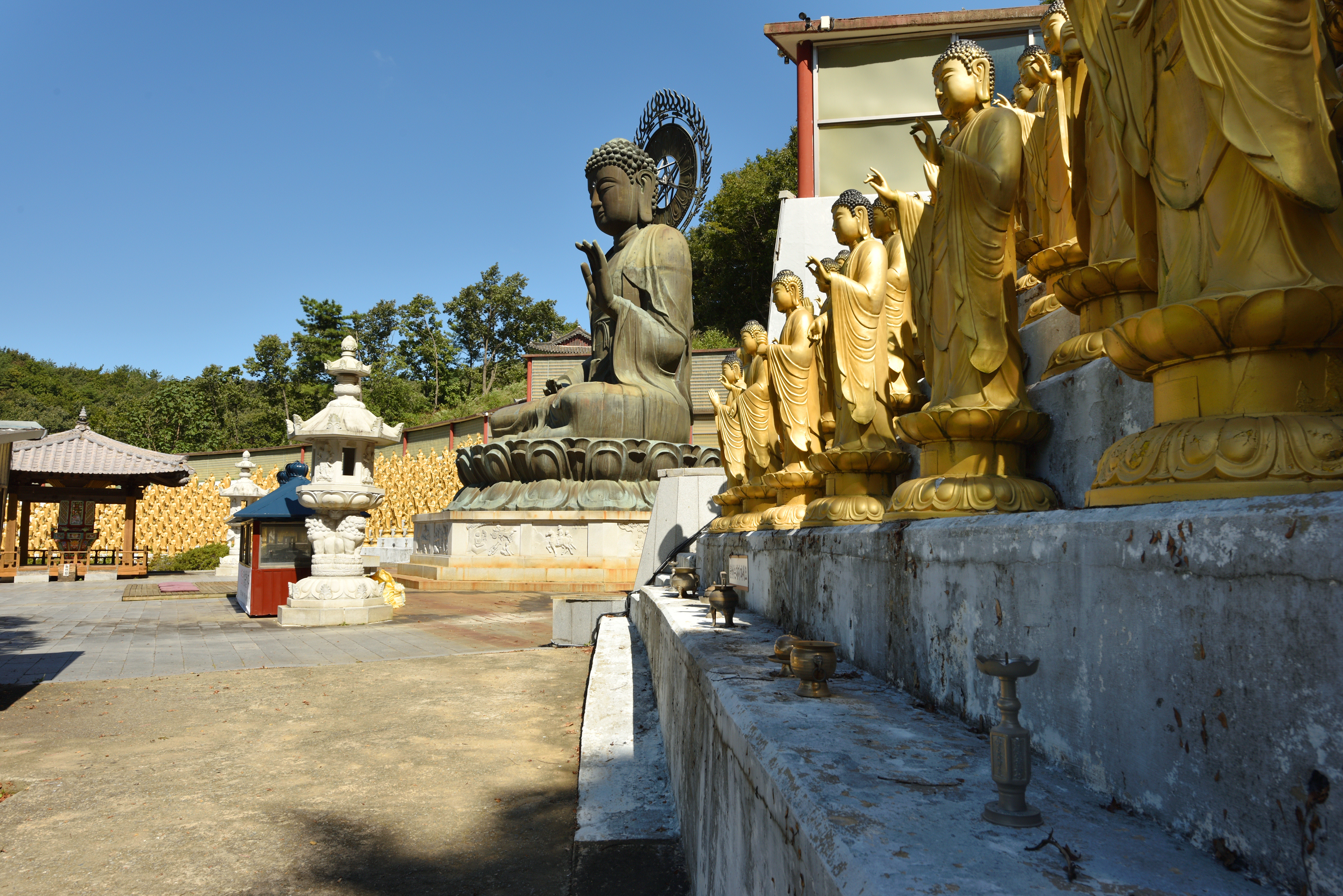 청동 좌불을 중심으로 좌우에 각각 오백 부처님들이 도열해 있었다. 조금 더 다듬어지고 정돈되었다면, 장관이었을 것을. 대단한 불사임에도 거두지 않아 쇄락해가는 모습이 안스럽다.
