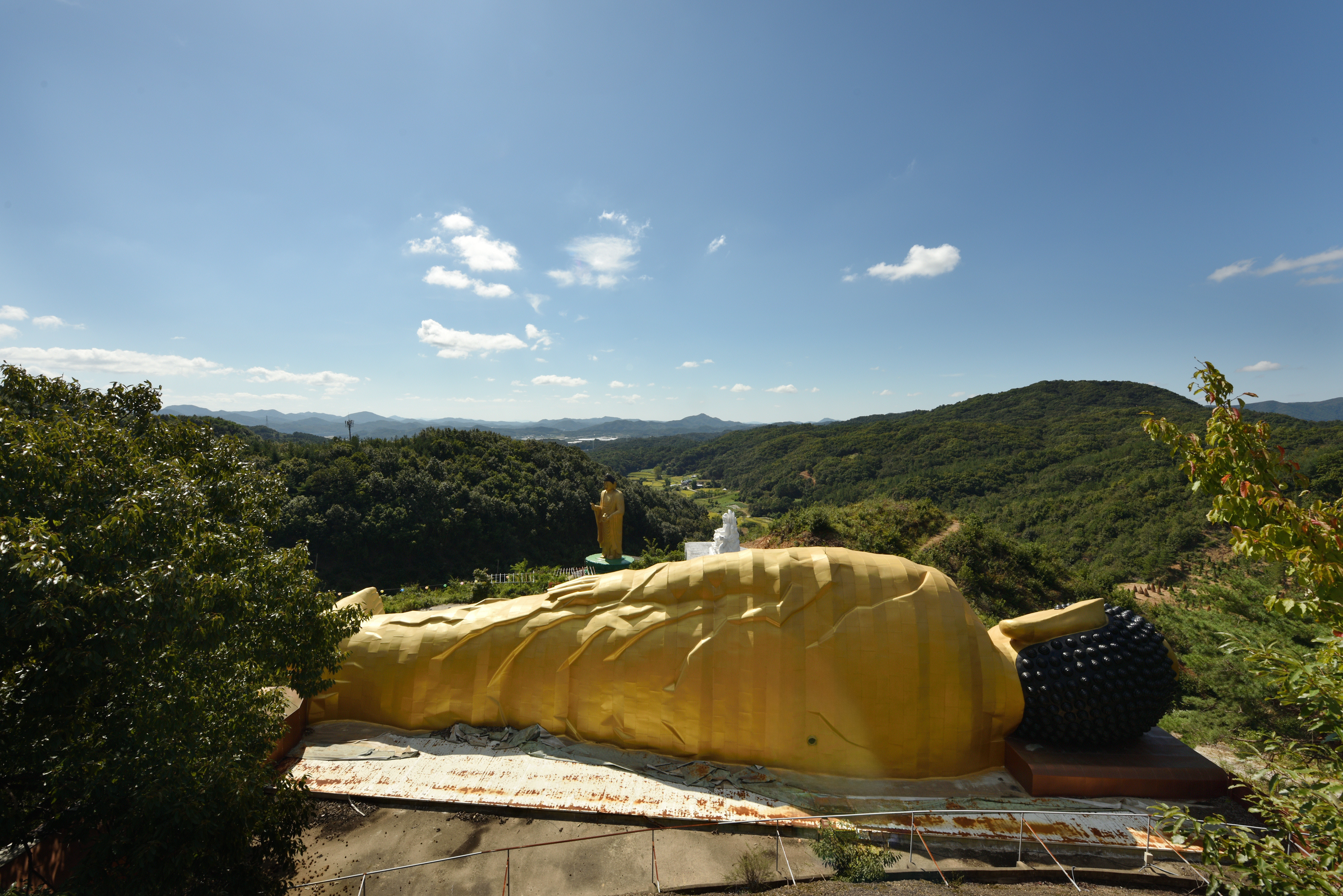 미륵상 앞 전경, 황금색 와불과, 용왕신, 약사여래불... 멀리 산자락과 빛나는 강물이 아름답다. 와불 뒤 다듬지 못한 잔상들이 품격을 떨어트린다.