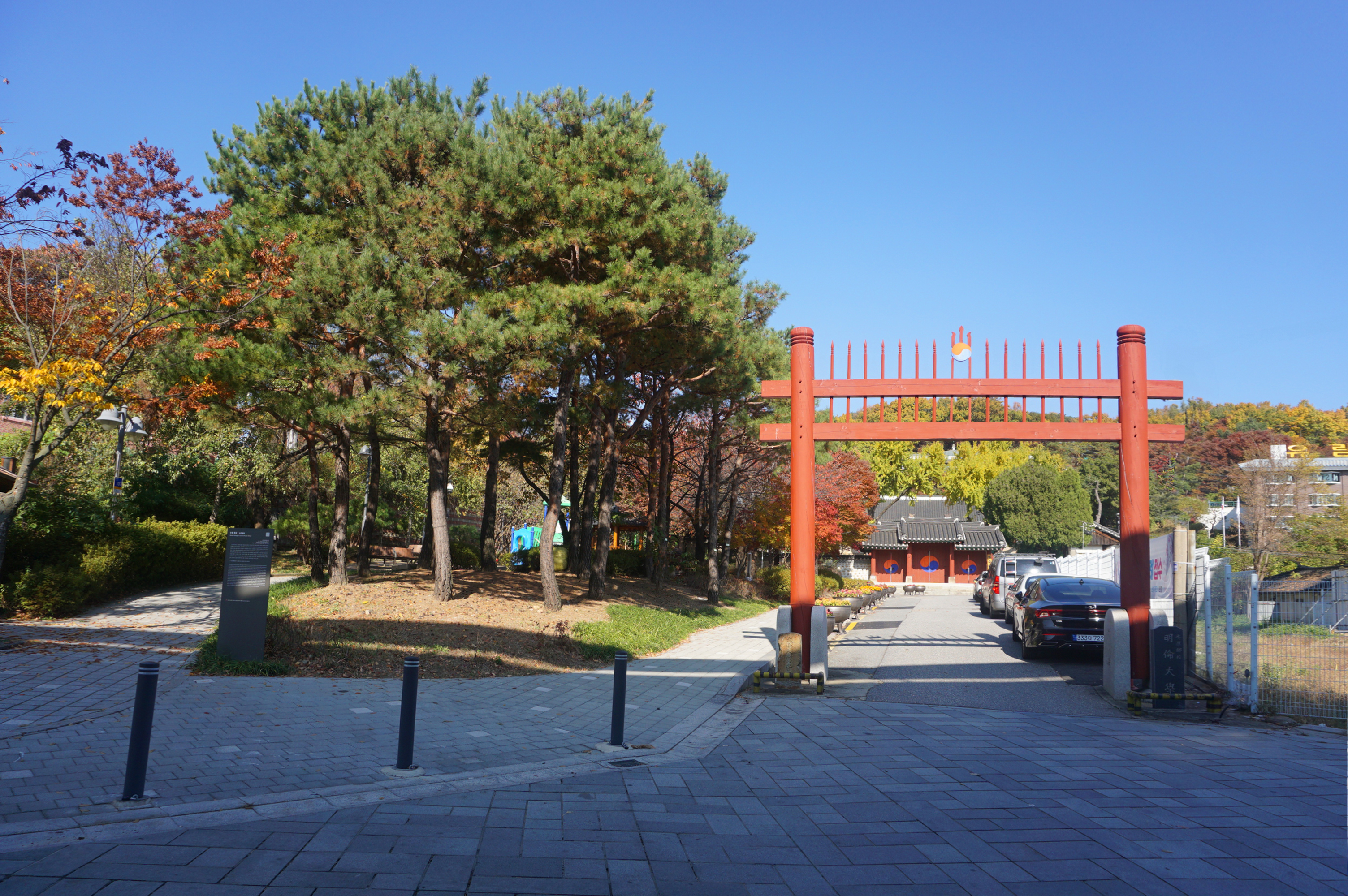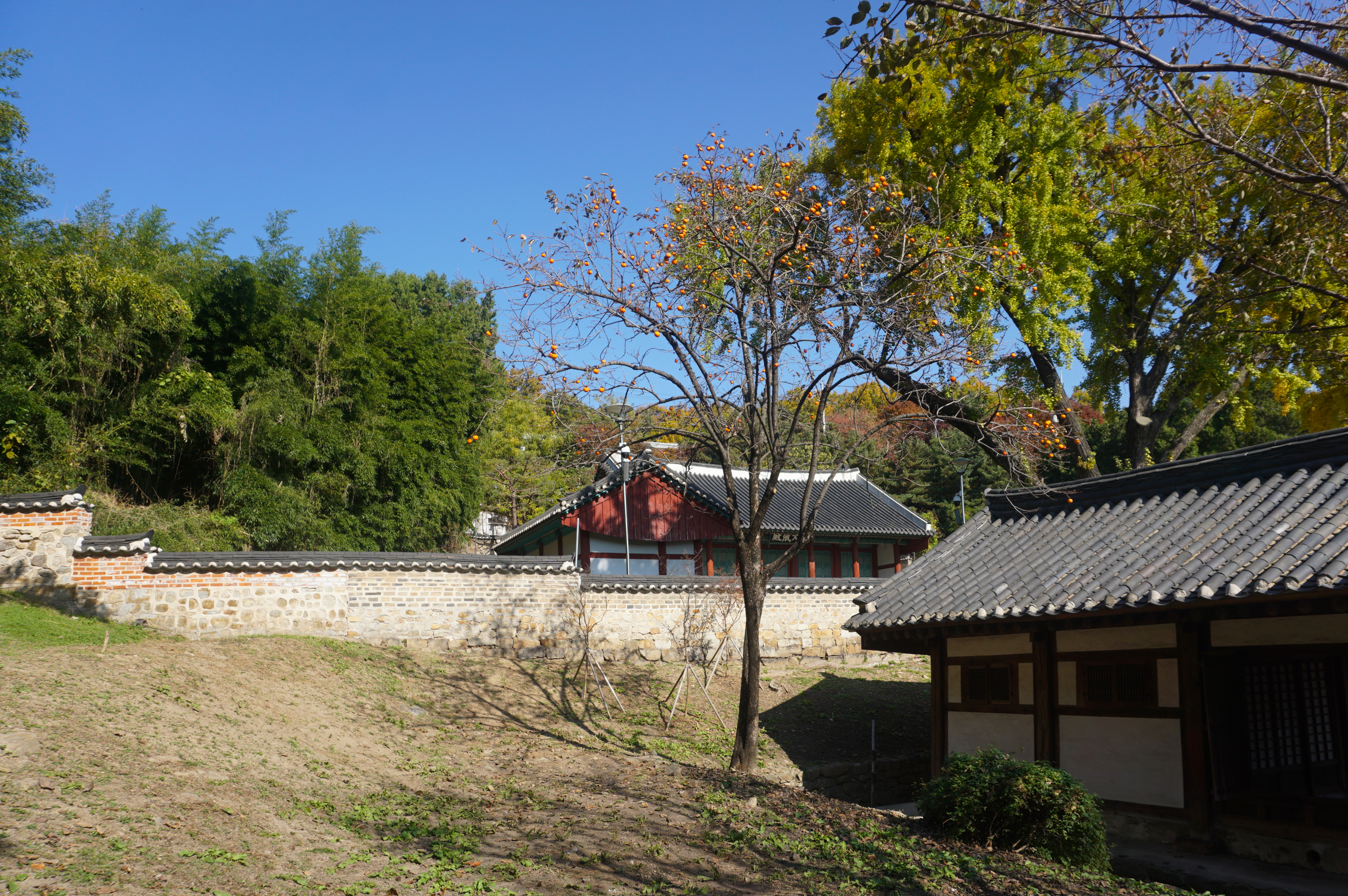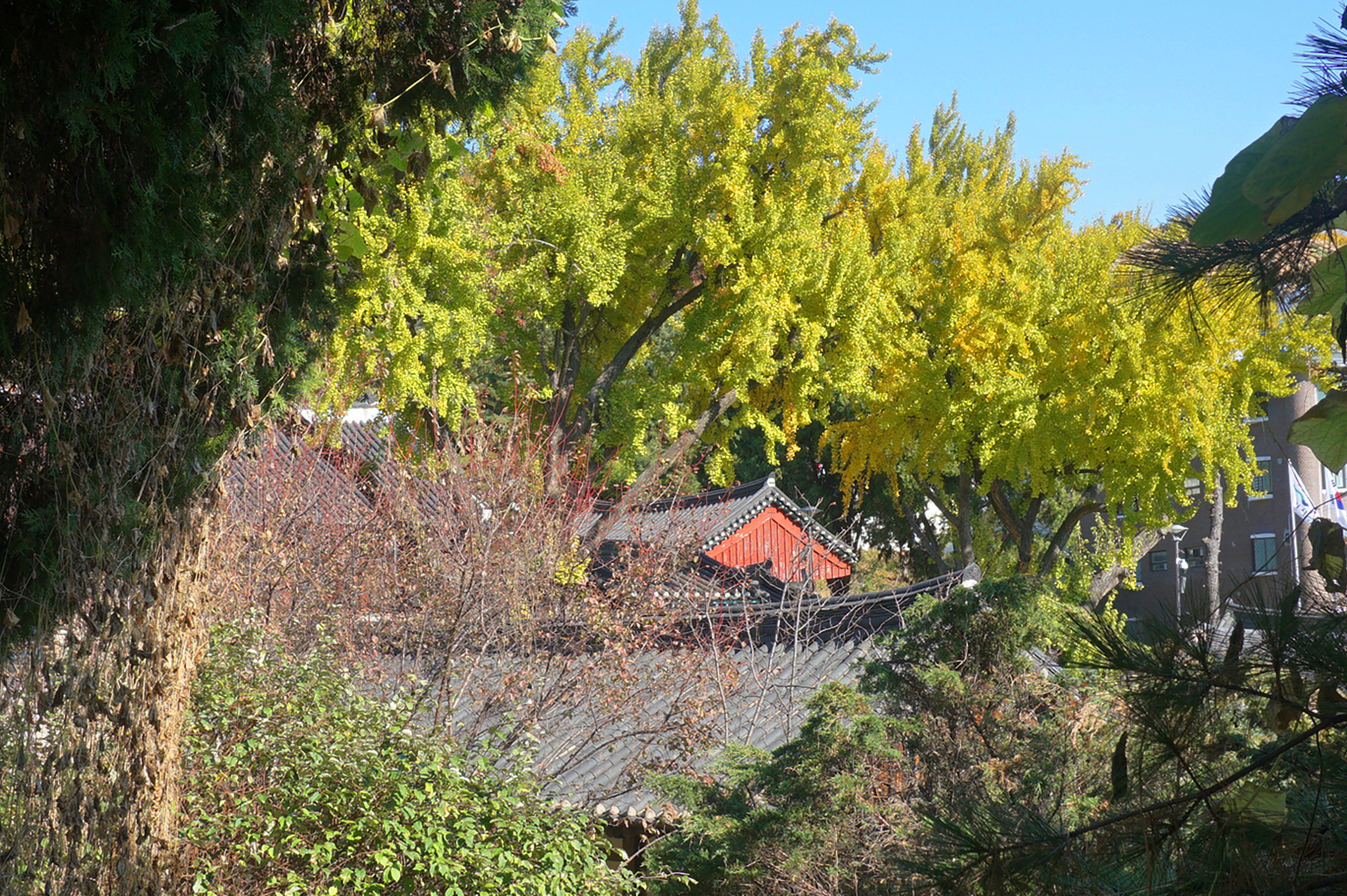 노랗게 물든 은행나무를 보기 위해 팔달산 남쪽 자락 아래 자리한 수원 향교에 갔다. 가로수 은행나무들은 이미 노랗게 물들어 낙엽 지고 있었으나, 수원 향교의 은행나무 이파리들은 아직도 푸르렀다. 향교마다 오래된 은행나무가 많다. 공자께서 은행나무 아래에서 제자들을 가르친 연유로 향교에서는 은행나무를 상징적으로 심어 이를 행단이라 한다. 고려 때부터 우리나라에 전해진 유학은 조선 시대 국시가 되어 전국 방방곡곡에 공자를 모시는 향교가 설립되었다. 유교의 종주국인 중국은 공산화 이후 본토에서 공맹사상이 완전 사라졌음에도 아직 공맹을 숭상하며 가르치는 우리나라 유림들의 정성은 대단하다. 유학 탓에 조선이 망했다지만, 동양사상의 중심인 유학의 인의예지 사상은 우리나라 사람들의 생활철학이 되어 우리 문화의 뿌리가 되었다 해도 과언이 아니다. 가을의 정점에서 비록 노랗게 풍성한 은행잎은 보지 못했지만 수원 향교의 이곳저곳을 살피며 고즈넉한 한 때를 보냈다. 금년 여름이 너무 덥고 길었던 탓에 은행나무뿐만 아니라 대부분의 활엽수 잎들도 영양과 환경에 따라 쇄락이 크게 다른 모양이다.