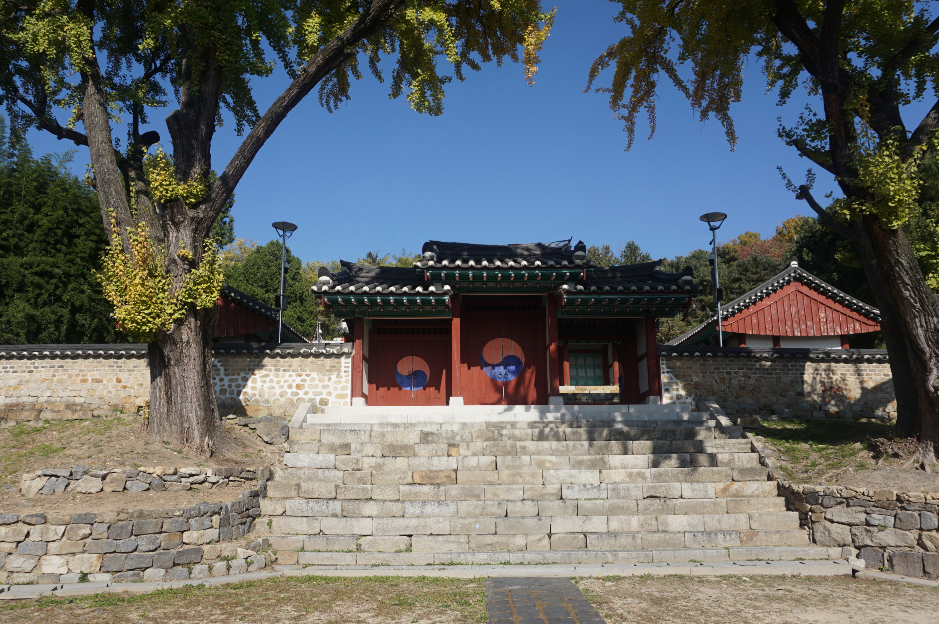 대성전으로 오르는 내삼문, 내삼문 밖 좌우로 커다란 은행나무 두 그루가 무성하고 푸른 잎을 자랑삼아 세월을 굽어보는 듯하다.