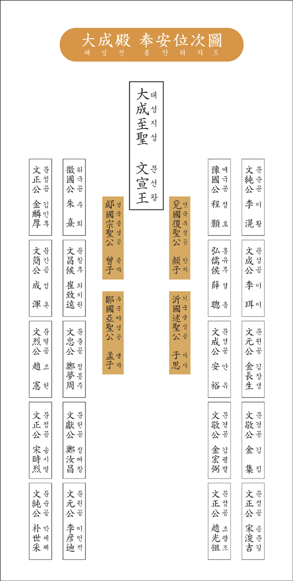 대성전, 대성지성 문선왕이신 공부자(孔夫子)의 유덕을 추모하여 제사를 지내는 문묘(文廟)이다. 이곳에는 공부자의 위패(位牌)를 정중앙으로 오성(五聖) 송대(宋代)의 2현(賢), 한국의 18현의 위패가 모셔져 있다.