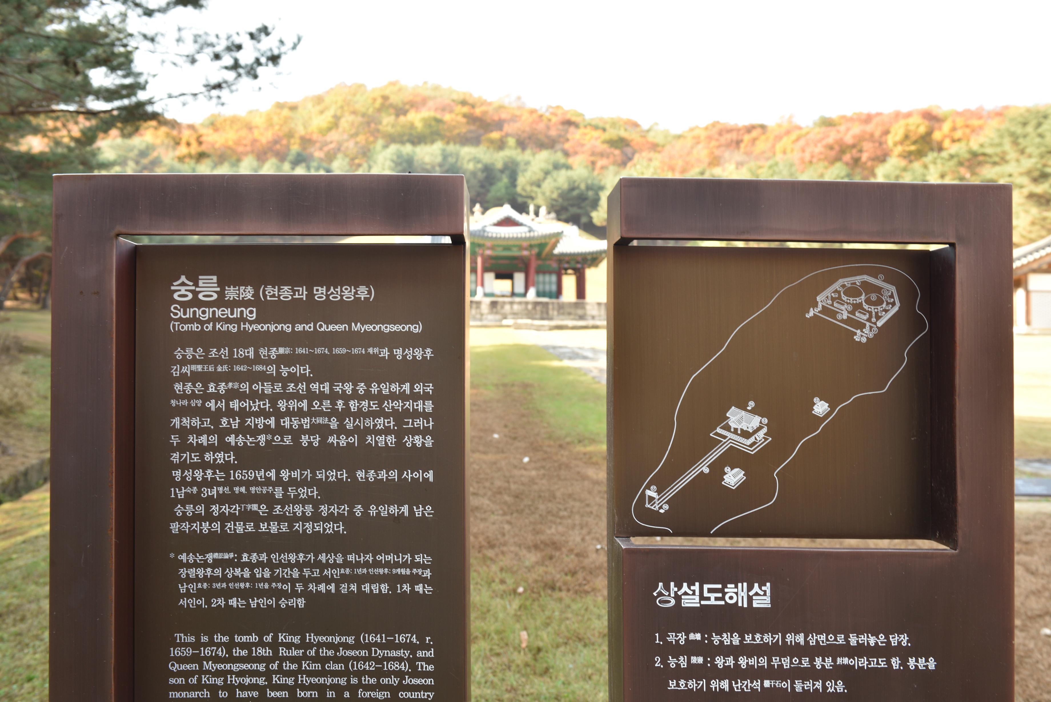 숭릉 - 18대 현종과 명성왕후 김씨의 능이다. 현종은 효종의 아들로 청나라 심양에서 태어나 19세에 즉위하여 34세에 창덕궁에서 사망하였다. 조선 국왕들 중 유일하게 후궁을 들이지 않고, 중전인 명성왕후 김씨에게만 충실했다. 부부간의 금슬 자체는 그럭저럭 좋았다고 하나 사이가 좋아서라기보다는, 명성왕후가 태종비 원경왕후 민씨처럼 워낙 성깔 있기로 유명했기 때문에 후궁을 들이지 못했다고도 한다. 현종은 화를 낼 때는 단호했지만 아버지, 아내, 아들과는 정반대로 현종은 기본적으로는 매우 온화한 성품으로 성군으로 평가된다. 명성왕후 김씨는 10세에 세자빈이 되어 슬하에 1남 3녀를 두었다. 18세에 왕비가 되고, 현종 사망 후 아들 숙종이 즉위하자 왕대비가 되어 창경궁에서 살다가 43세로 사망하였다.