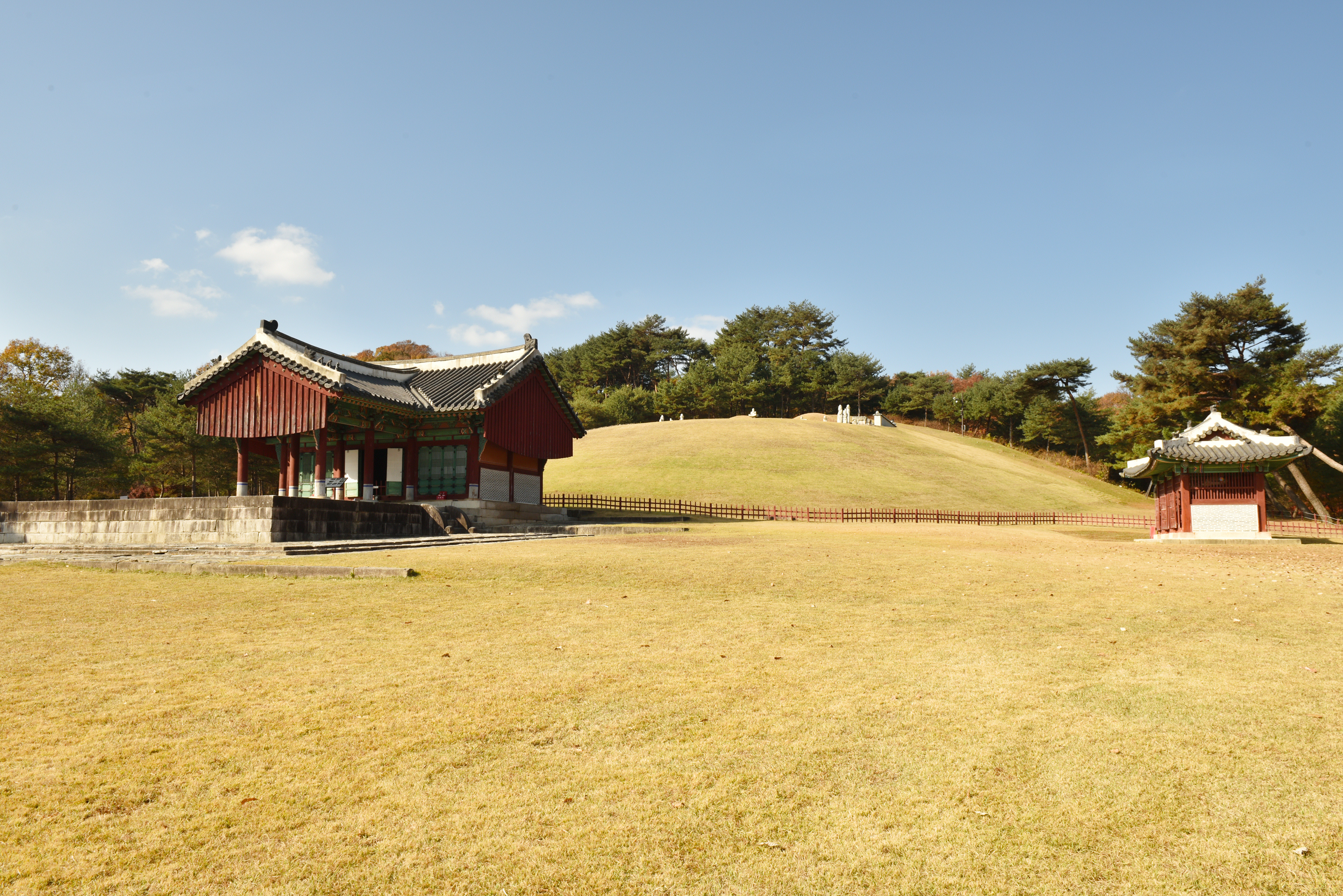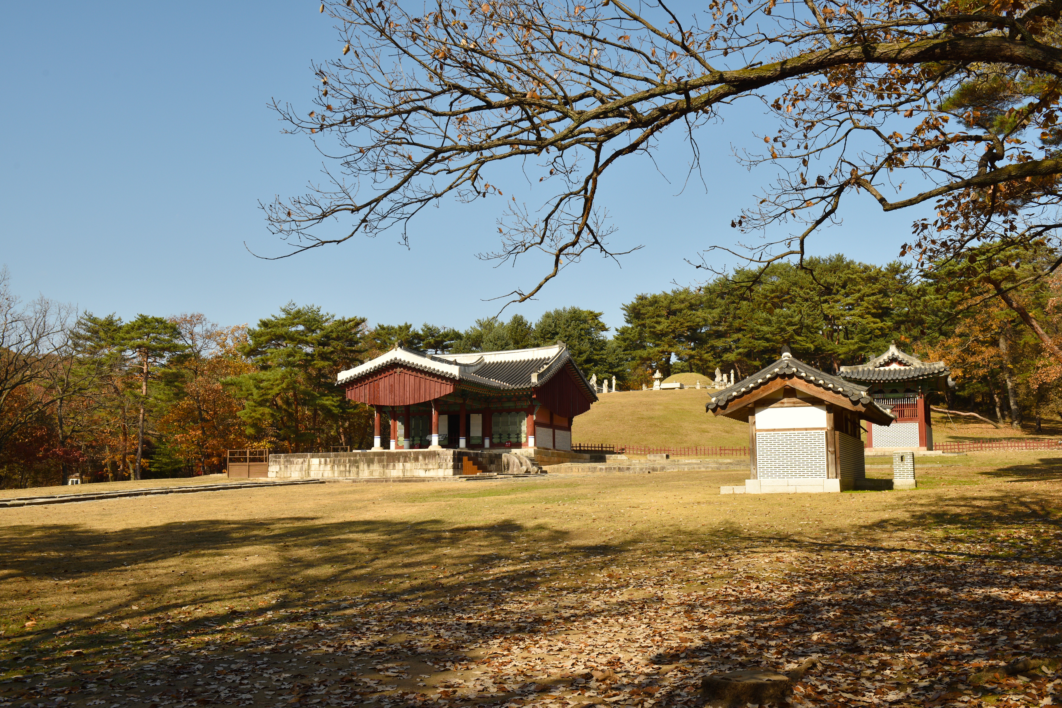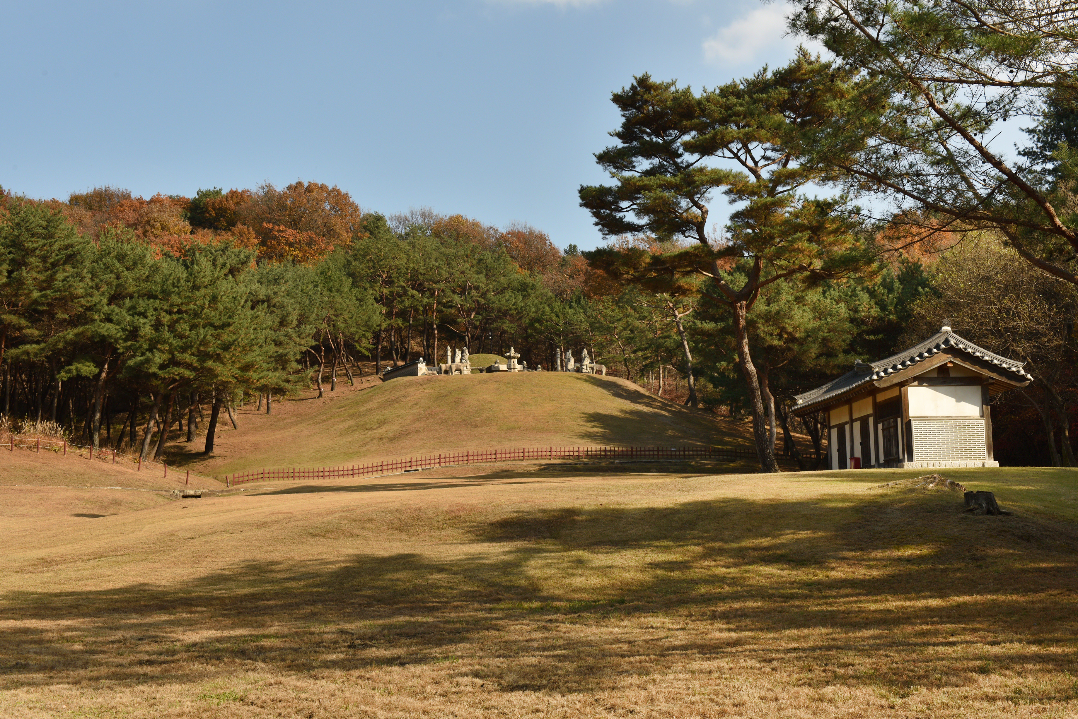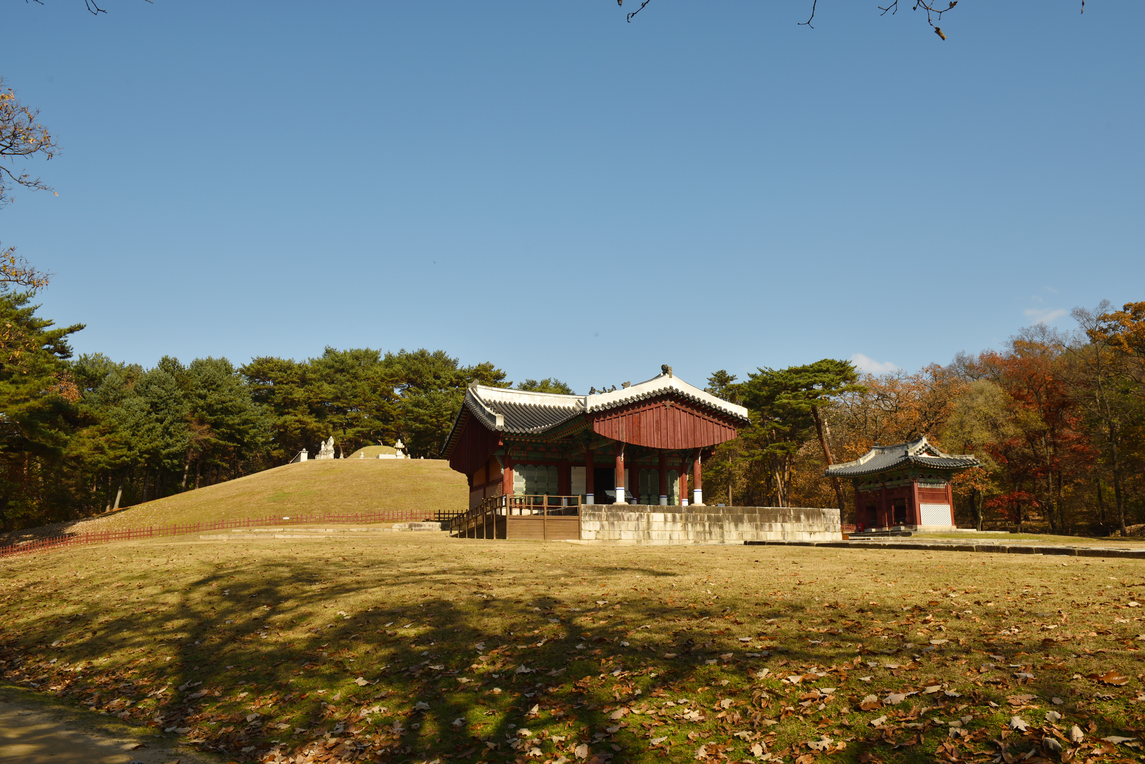 건원릉-조선을 건국한 태조 이성계의 능(1392년 개성에서 개국하여 1394년 한양으로 천도하여 조선의 기틀을 다졌다. 1408년 74세로 사망하여 이곳에 묻혔다. 봉분은 고향인 함흥의 억새를 심어 매년 4월에 단장하며 이후 벌초를 하지 않아 억새로 덮여있다.)
