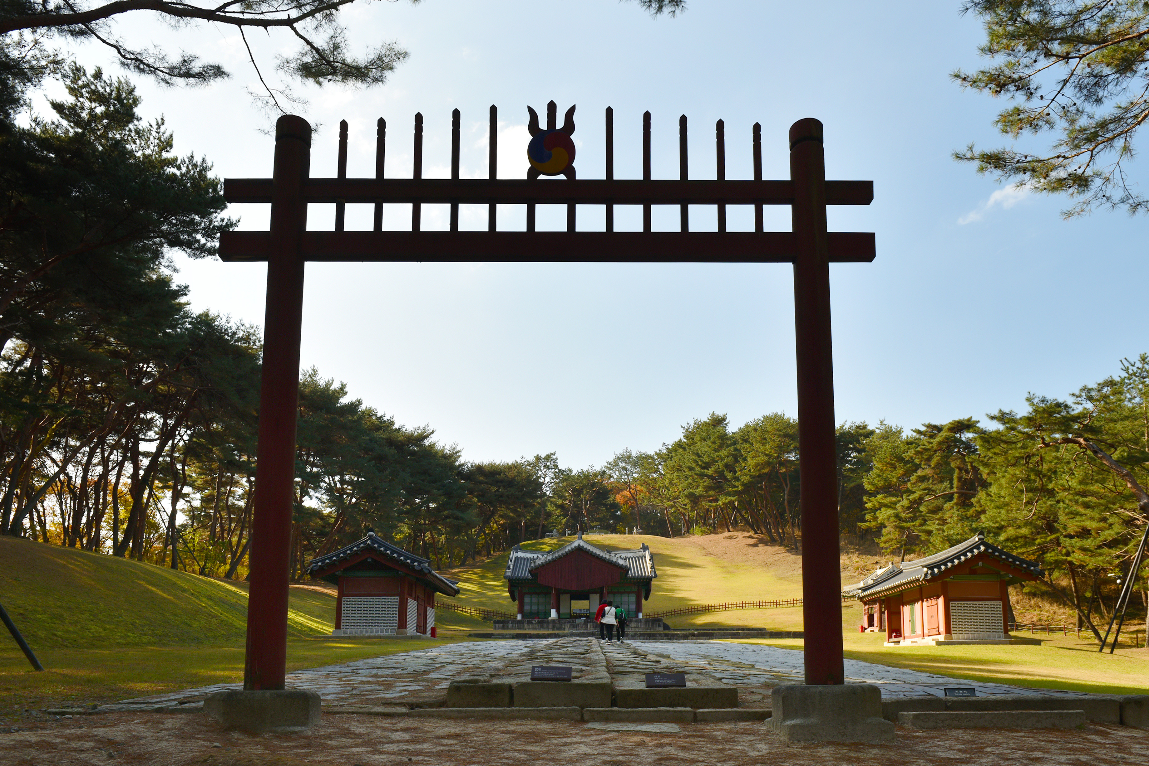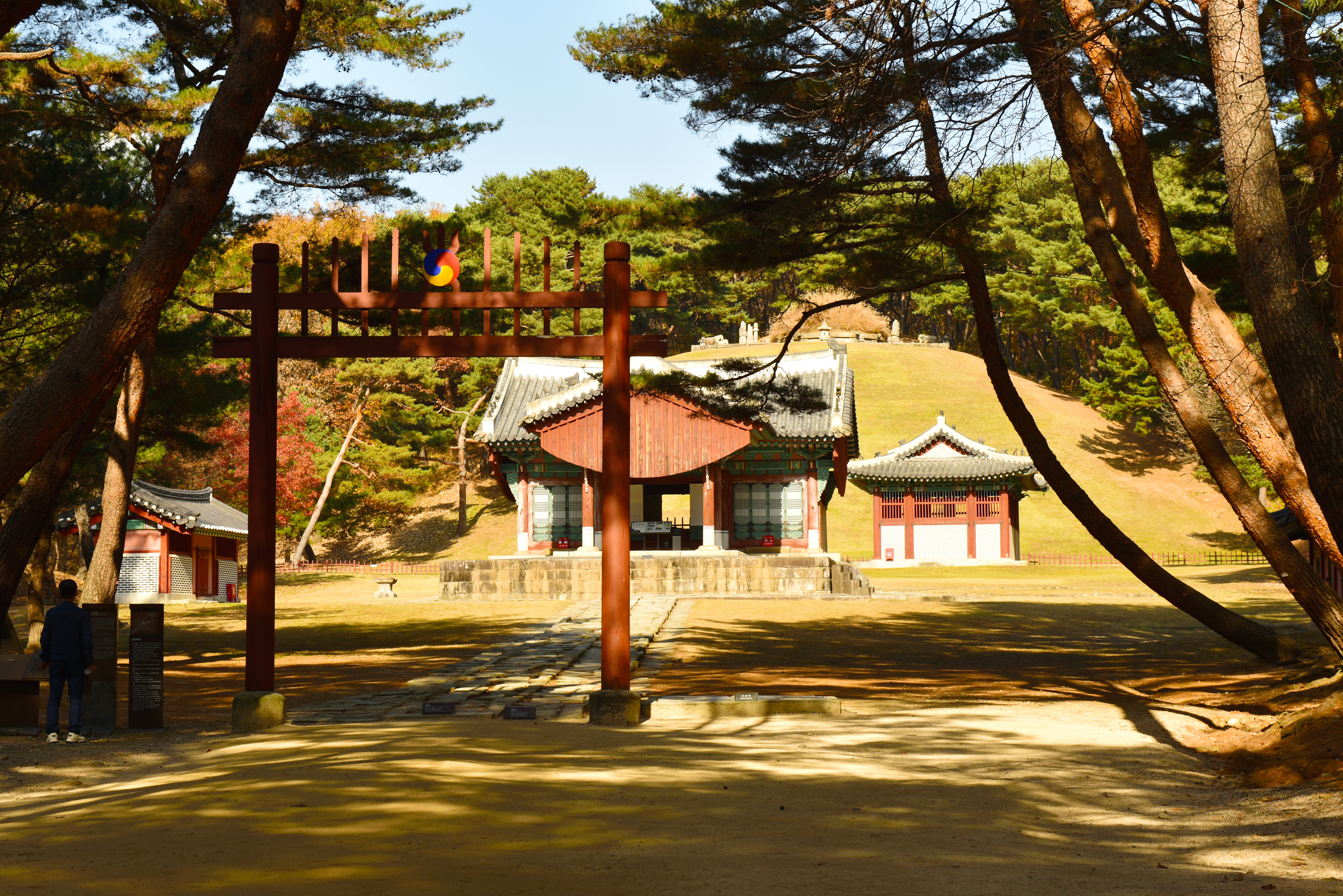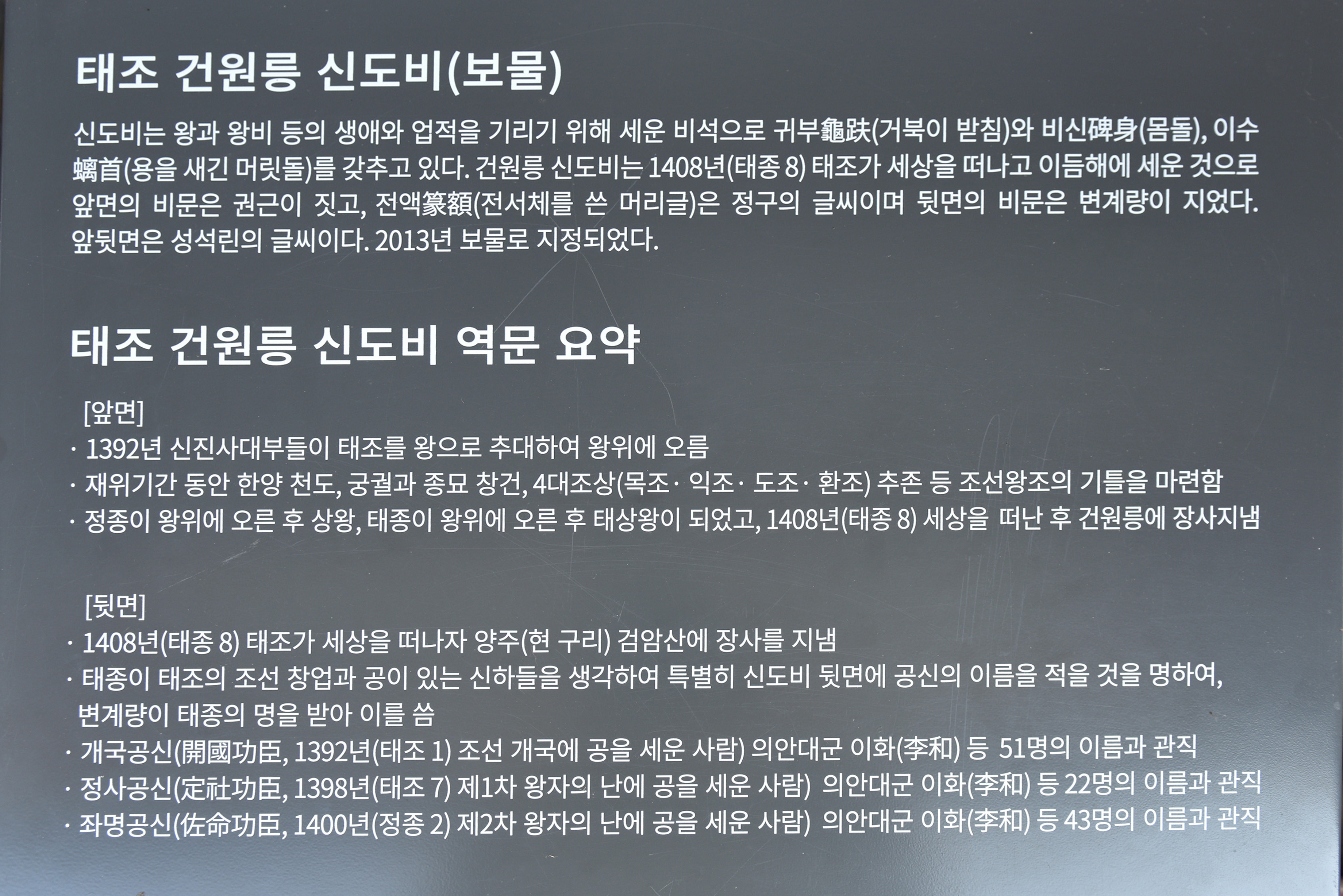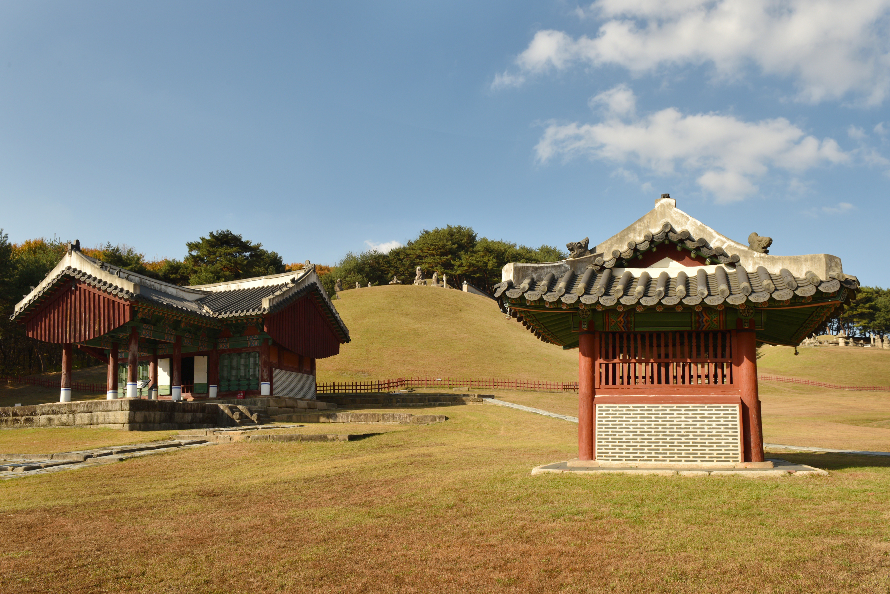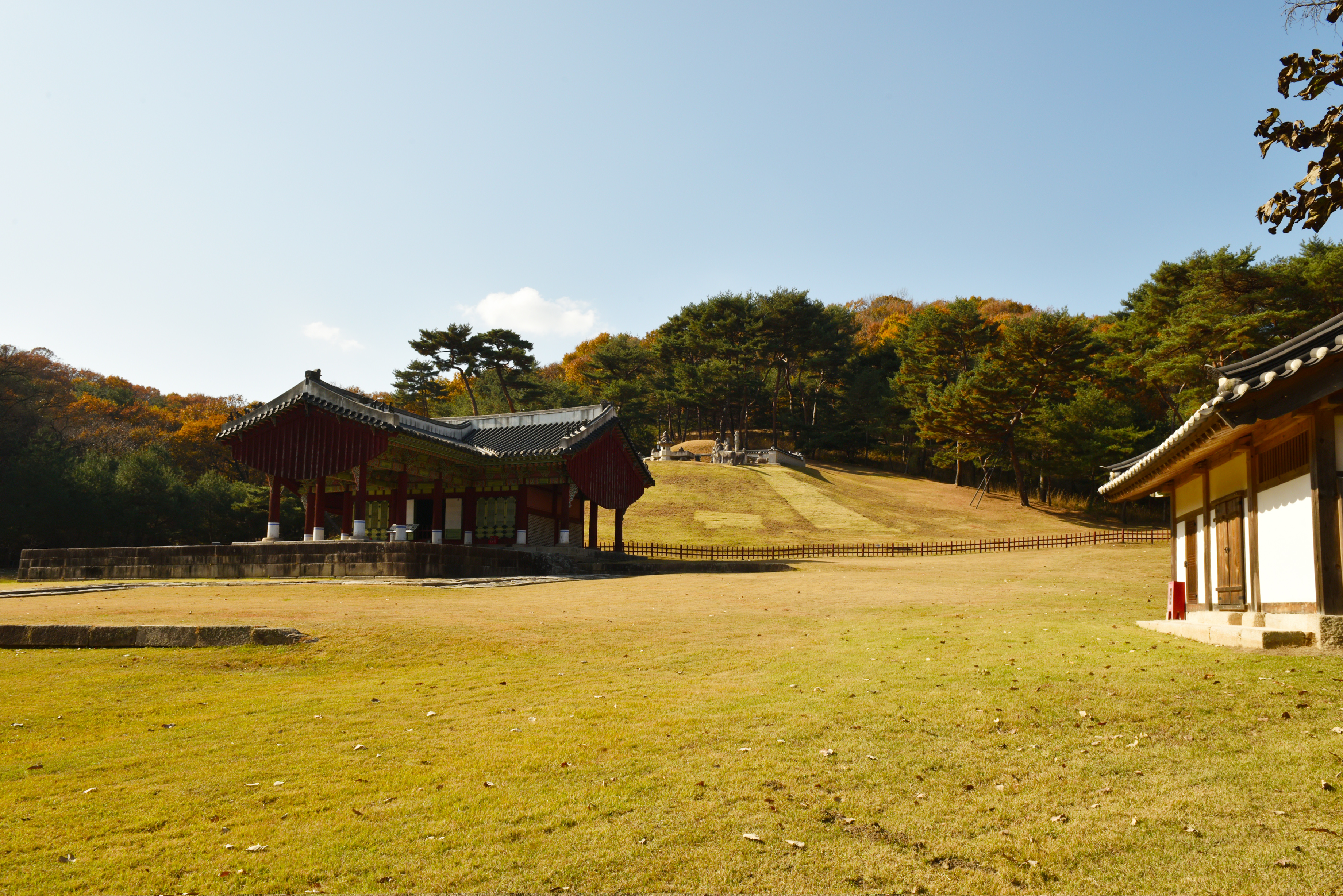 건원릉-조선을 건국한 태조 이성계의 능(1392년 개성에서 개국하여 1394년 한양으로 천도하여 조선의 기틀을 다졌다. 1408년 74세로 사망하여 이곳에 묻혔다. 봉분은 고향인 함흥의 억새를 심어 매년 4월에 단장하며 이후 벌초를 하지 않아 억새로 덮여있다.)